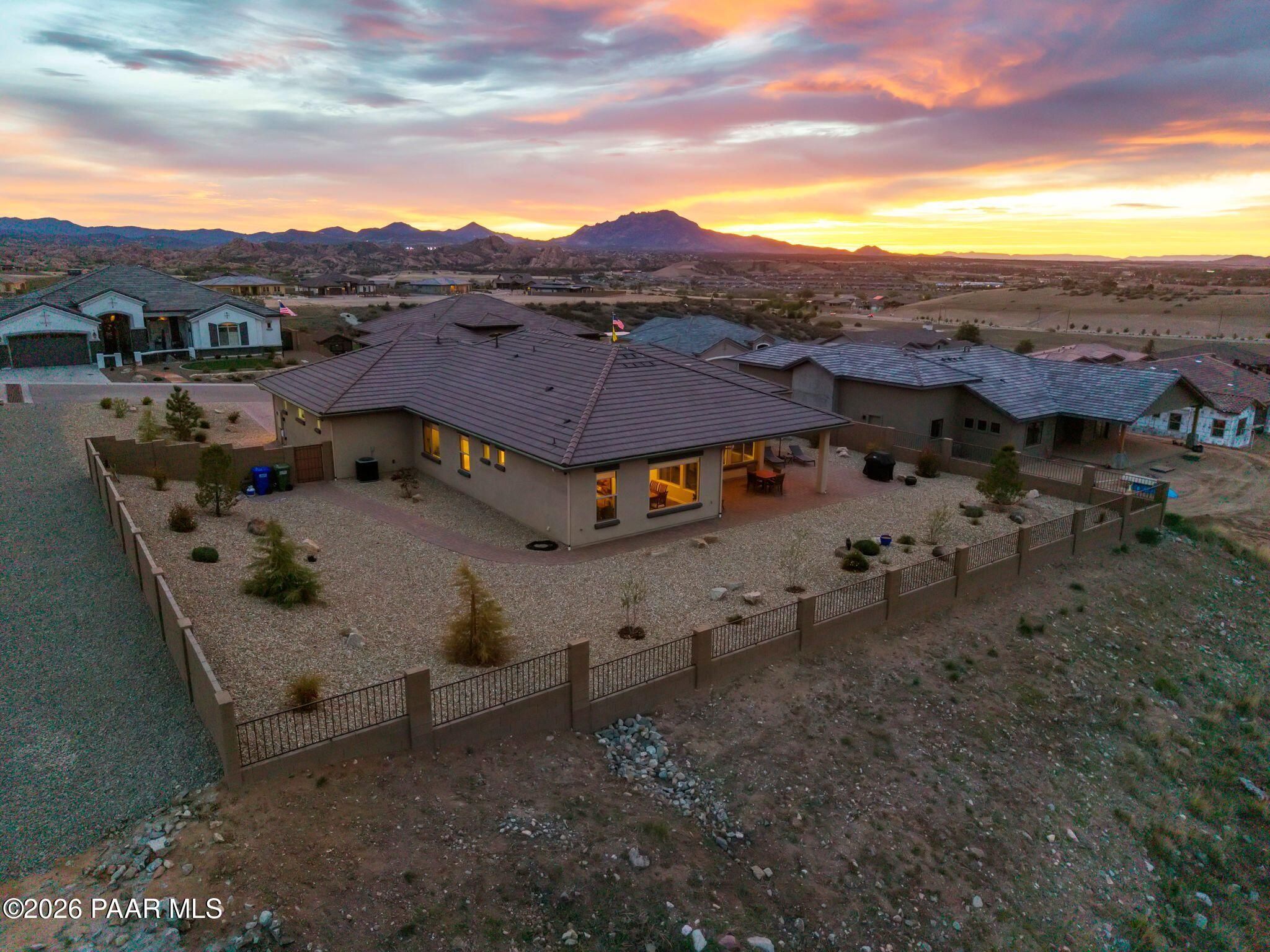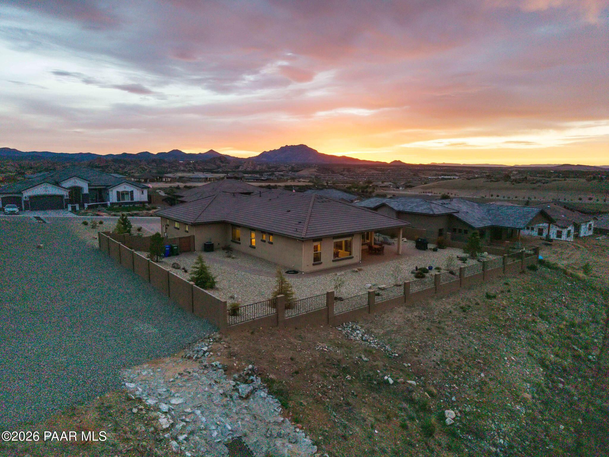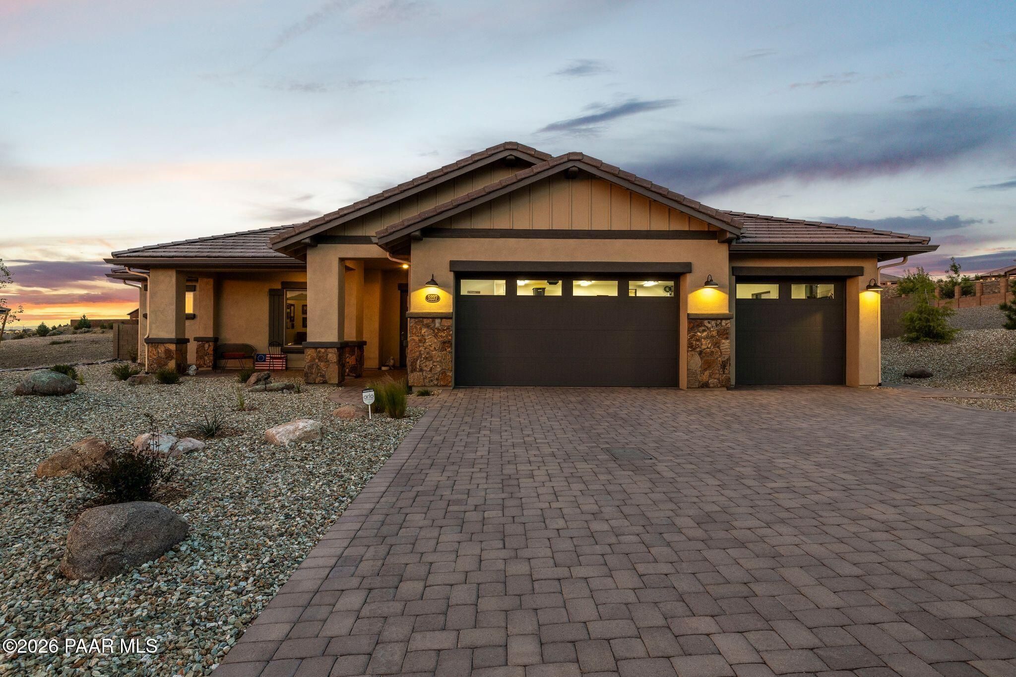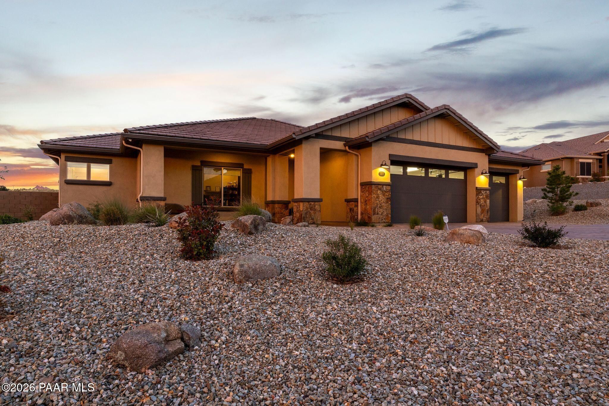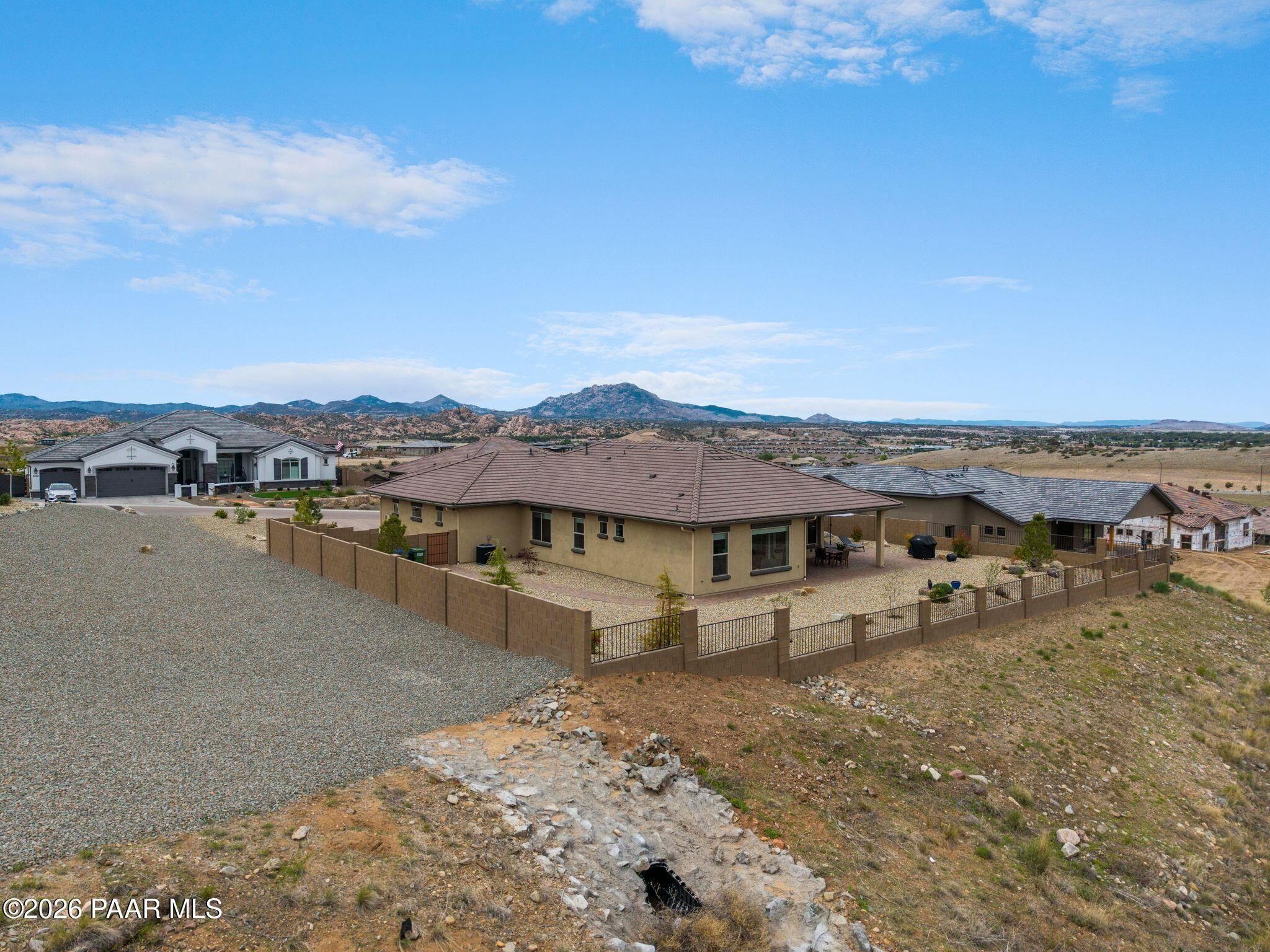 Discover the pinnacle of luxury living in the highly coveted, prestigious, and secure gated community of Granite Dells Estates. This stunning custom-built residence, meticulously crafted by the renowned Stoddard Lifestyle Homes, offers an unparalleled, absolutely turnkey experience, ready for immediate occupancy. Spanning 2,322 square feet of thoughtfully designed interior space, this home exudes pure elegance and functionality. The layout features three spacious bedrooms and three full bathrooms, including two luxurious ensuites, providing comfort and privacy for residents and guests alike. The heart of the home is an expansive, open-concept great room, perfect for entertaining or relaxing. Anchored by a cozy gas fireplace, this grand space flows seamlessly into the gourmet chef's kitchen. The state-of-the-art kitchen is a culinary enthusiast's dream. It boasts a spacious dining area and a massive center island, which is not only a functional workspace but also a stylish focal point, featuring a durable, low-maintenance granite composite sink. Premium features include a convenient wine refrigerator, elegant glass door display cabinets, and top-of-the-line stainless steel appliances. Just off the kitchen, a versatile butler's pantry or dedicated hobby room provides invaluable additional flexible and functional living space, perfect for extra storage, prep work, or pursuing creative projects. No detail has been overlooked in the selection of high-end finishes. The home showcases stunning, smooth quartz countertops, elegant white custom cabinetry complemented by sleek stainless steel hardware, and sophisticated under cabinet lighting to create a warm ambiance. The main living areas feature exquisite, durable planked tile floors that offer both beauty and ease of maintenance. Perhaps the most captivating feature is the home's connection to nature. Massive picture windows span the entire back of the residence, framing and offering breathtaking, unobstructed, and protected open space views that create a serene and private backdrop for everyday living. Capping off this exquisite property is a truly exceptional amenity: an oversized, five-car garage. Spanning over 1,000 square feet, this substantial space provides ample room for multiple vehicles, storage, a workshop, and all your recreational equipment, appealing to collectors and hobbyists alike. This Granite Dells Estates home is a masterpiece of custom construction, blending luxurious finishes, modern functionality, and unparalleled views into a perfect residential retreat.