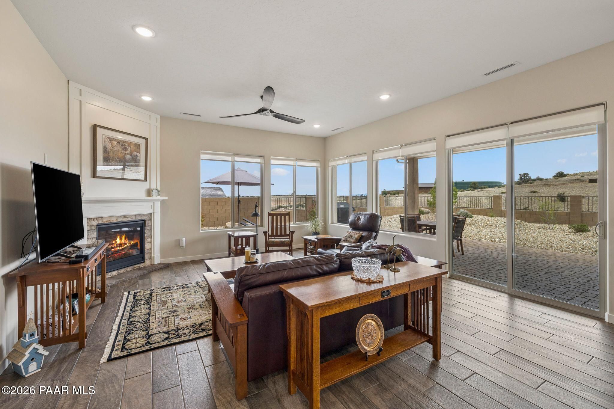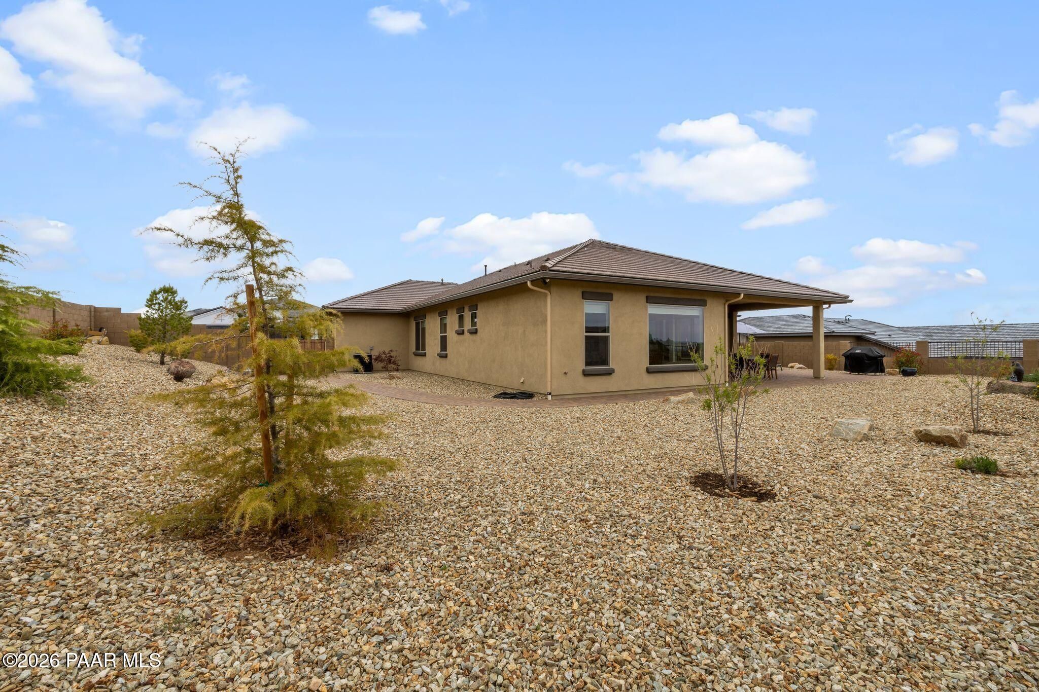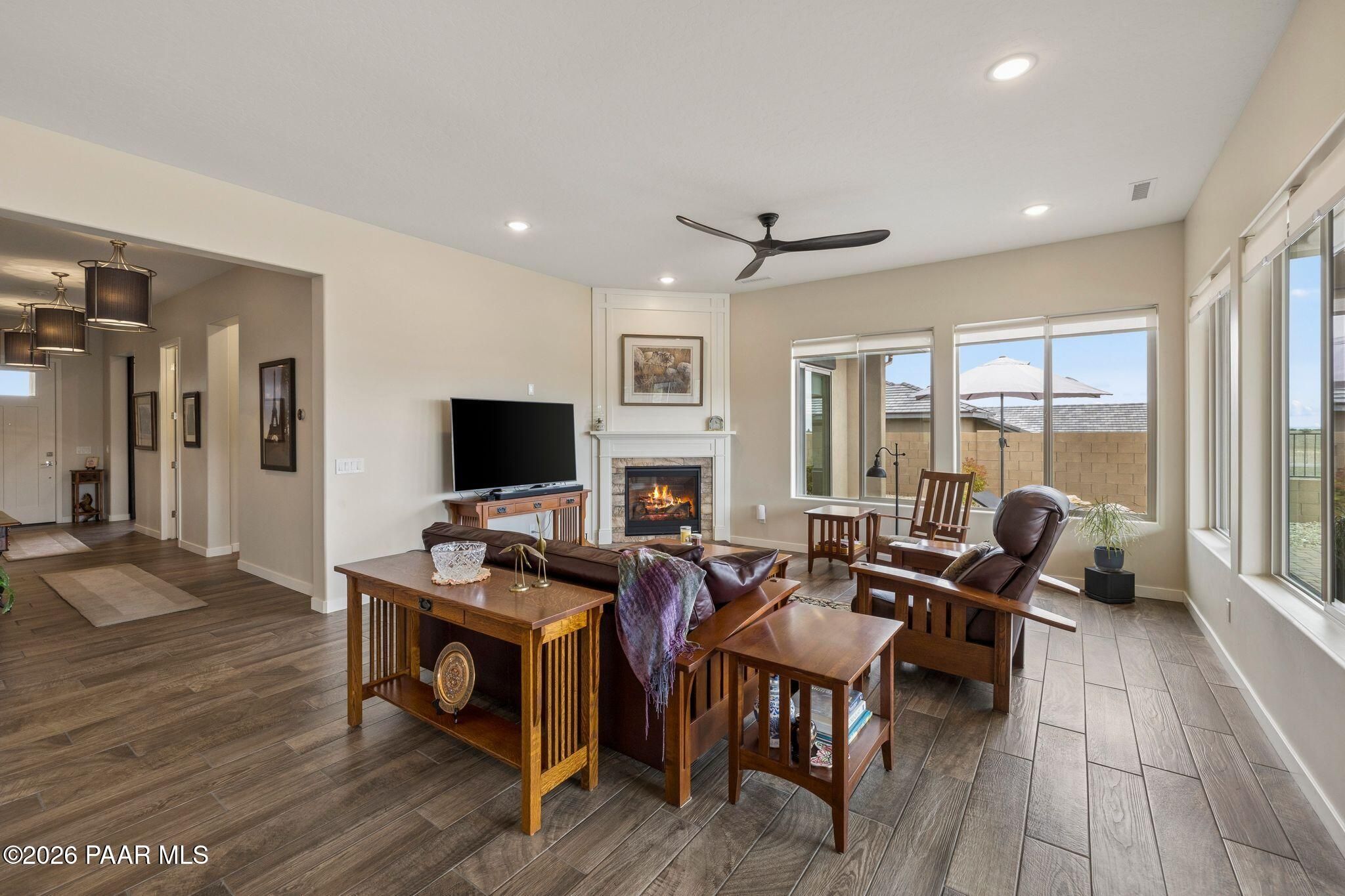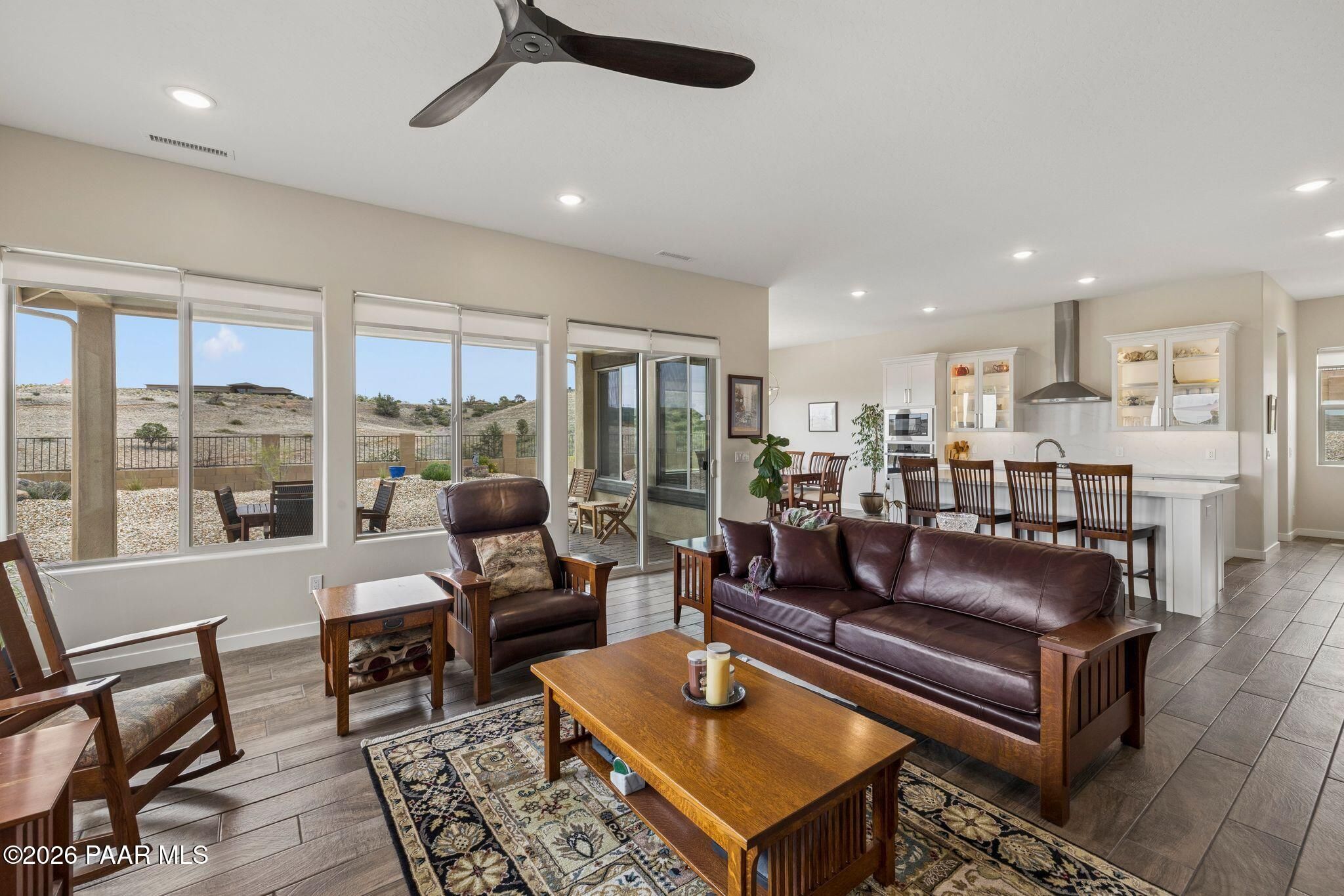 Discover the pinnacle of luxury living in the highly coveted, prestigious, and secure gated community of Granite Dells Estates. This stunning custom-built residence, meticulously crafted by the renowned Stoddard Lifestyle Homes, offers an unparalleled, absolutely turnkey experience, ready for immediate occupancy. Spanning 2,322 square feet of thoughtfully designed interior space, this home exudes pure elegance and functionality. The layout features three spacious bedrooms and three full bathrooms, including two luxurious ensuites, providing comfort and privacy for residents and guests alike. The heart of the home is an expansive, open-concept great room, perfect for entertaining or relaxing. Anchored by a cozy gas fireplace, this grand space flows seamlessly into the gourmet chef's kitchen. The state-of-the-art kitchen is a culinary enthusiast's dream. It boasts a spacious dining area and a massive center island, which is not only a functional workspace but also a stylish focal point, featuring a durable, low-maintenance granite composite sink. Premium features include a convenient wine refrigerator, elegant glass door display cabinets, and top-of-the-line stainless steel appliances. Just off the kitchen, a versatile butler's pantry or dedicated hobby room provides invaluable additional flexible and functional living space, perfect for extra storage, prep work, or pursuing creative projects. No detail has been overlooked in the selection of high-end finishes. The home showcases stunning, smooth quartz countertops, elegant white custom cabinetry complemented by sleek stainless steel hardware, and sophisticated under cabinet lighting to create a warm ambiance. The main living areas feature exquisite, durable planked tile floors that offer both beauty and ease of maintenance. Perhaps the most captivating feature is the home's connection to nature. Massive picture windows span the entire back of the residence, framing and offering breathtaking, unobstructed, and protected open space views that create a serene and private backdrop for everyday living. Capping off this exquisite property is a truly exceptional amenity: an oversized, five-car garage. Spanning over 1,000 square feet, this substantial space provides ample room for multiple vehicles, storage, a workshop, and all your recreational equipment, appealing to collectors and hobbyists alike. This Granite Dells Estates home is a masterpiece of custom construction, blending luxurious finishes, modern functionality, and unparalleled views into a perfect residential retreat.