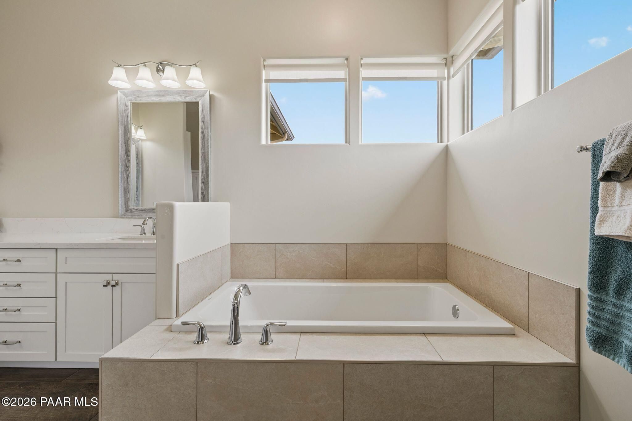 - Ceiling Fan(s), Countertops, Eat-in Kitchen, Soaking Tub, Kitchen/Dining Combo, Kitchen Island, Single Living Level, Primary Downstairs, Pantry, Quartz Countertops, High Ceilings, See Remarks, Walk-In Closet(s), Washer/Dryer Hookup
