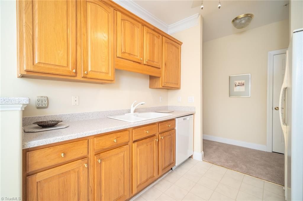 Sought after third floor corner unit condo with lots of good natural light in the 524 Building of Guilford Crossing- a 55+ community! The living room has a fireplace with gas logs & built in cabinetry and shelving as well as nice moldings and arched doorways. The bright kitchen has good storage. The Large primary bedroom has a walk in closet and an ensuite bath with a walk-in shower as well as a large vanity. The second bath has a tub/shower combination. The large laundry room has cabinets for pantry space and storage. Enter building from the parking lot through the lobby & elevator to third level. There is a community Clubhouse which is perfect for entertaining & recreation- with a kitchen, sitting areas, work out room, card room and landscaped patio with grills. Location is convenient to highways as well as shopping, grocery stores, restaurants at Guilford College! Assigned parking space as well as ample visitor spaces.