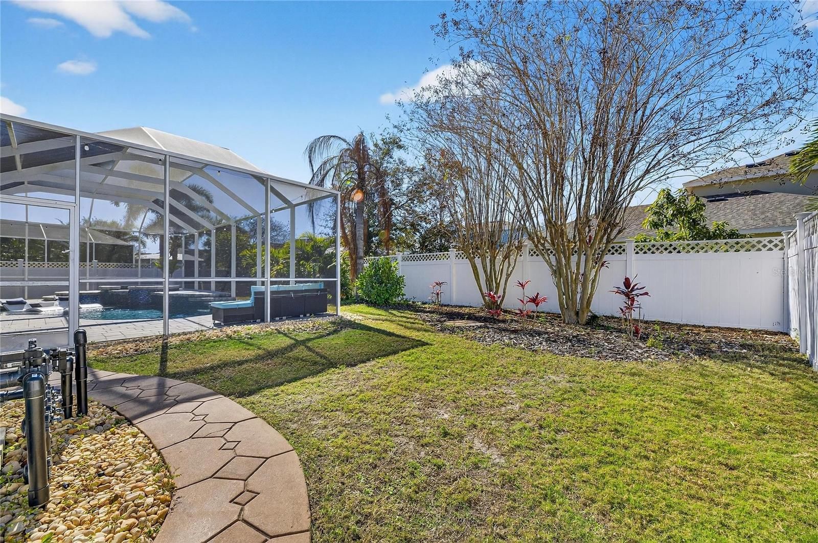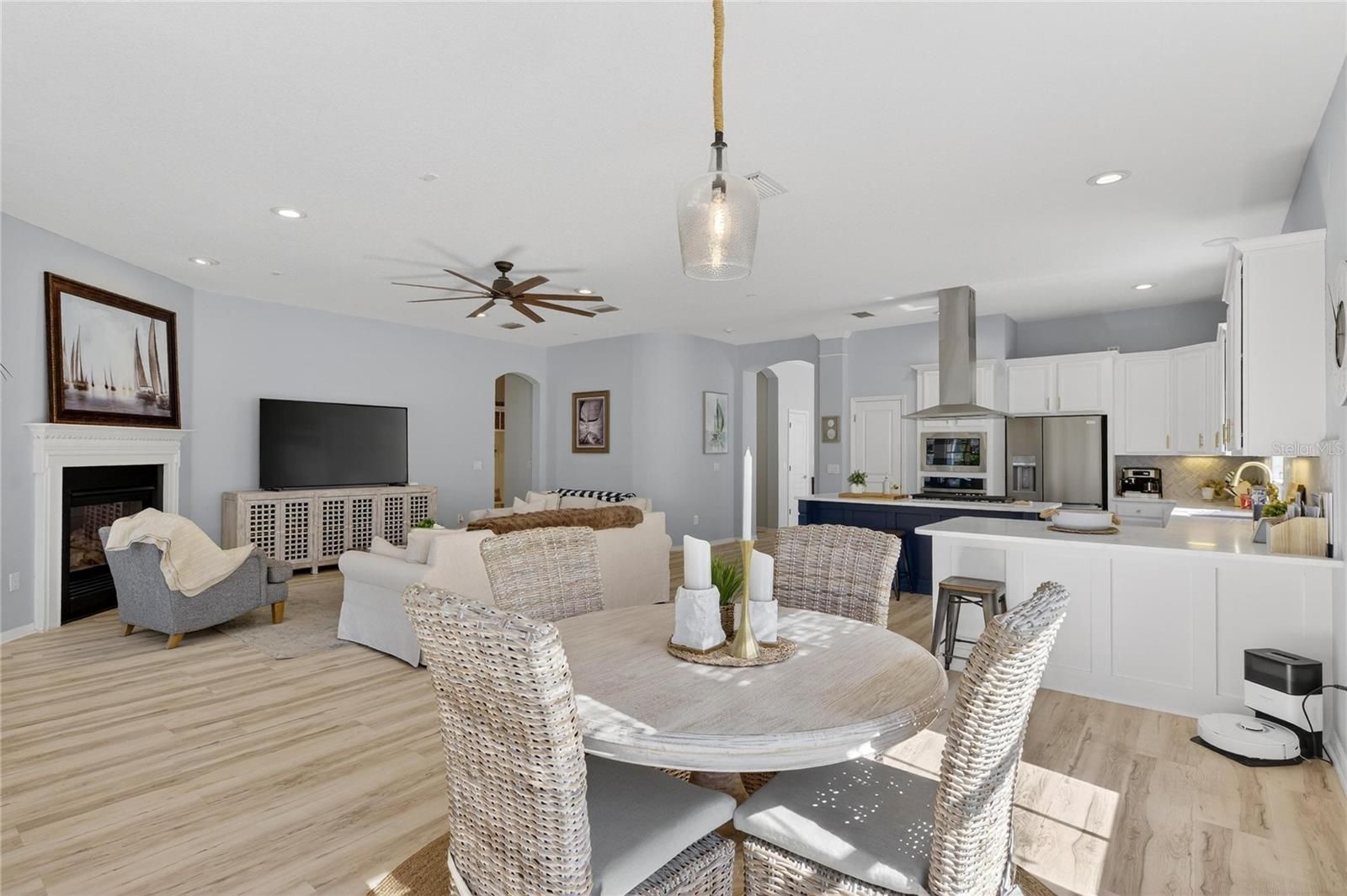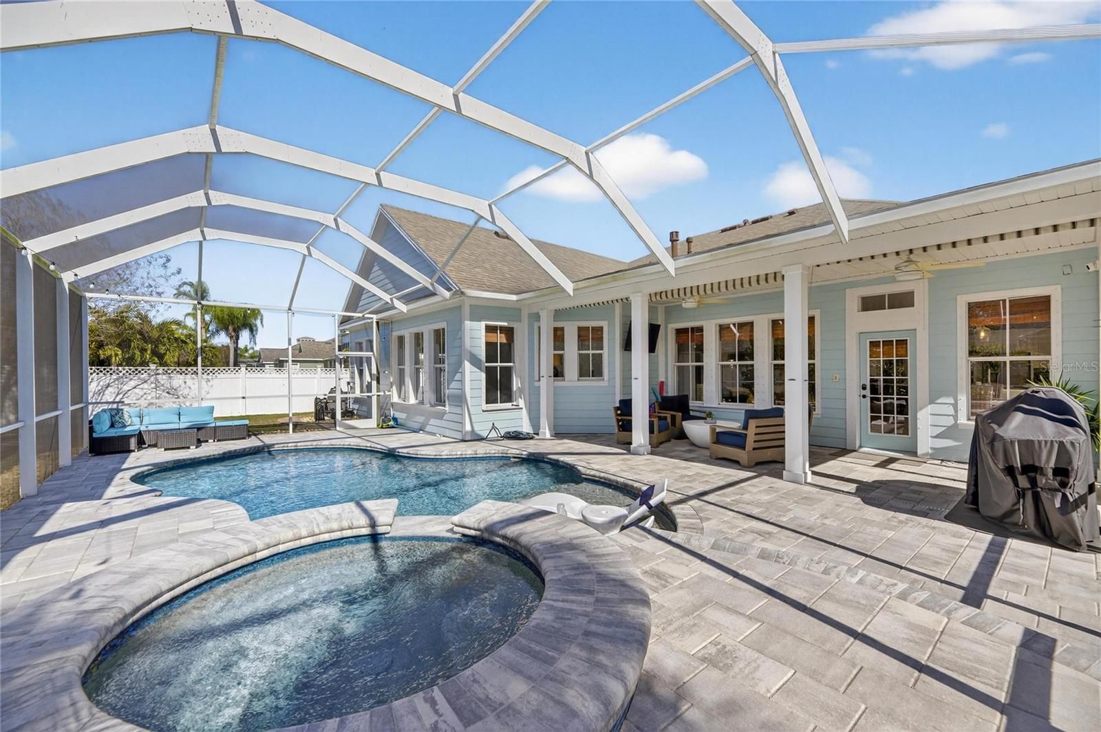 5240 Brighton Shore Drive, Apollo Beach, FL | 4 Bedrooms | 3 Bathrooms | 3,049 Sq Ft | Single-Story | Pool & Spa | Gated MiraBay 5240 Brighton Shore Drive is a single-story, four-bedroom, three-bathroom pool home offering 3,049 square feet of living space, located in the gated waterfront community of MiraBay in Apollo Beach. The home includes a fenced backyard, a two-car garage, and a functional floorplan designed for everyday living and entertaining. Inside luxury vinyl flooring runs throughout complimented by crown molding, tray ceilings, recessed lighting, arched doorways, and custom art niches. The home features a natural gas fireplace, built-in mudroom, ceiling fans, a neutral finishes, attic flooring for added storage, and a whole home water softener and filtration system. The kitchen is a standout featuring quartz countertops, 42-inch upper cabinets with crown molding, new stainless steel appliances, a built-in oven and microwave, natural gas cooktop, wine refrigerator, French-door refrigerator, herringbone backsplash, large basin sink, and a center island with breakfast bar seating. The kitchen opens to the main living areas. Smart-home features include keypad entry, a WiFi-enabled garage door opener, WifFi-enabled thermostat with multi-zone HVAC, Ring doorbell, WiFi irrigation system, and integrated interior and exterior speakers. The primary suite offers a private retreat with a walk-in closet, dual split-sink vanities, a freestanding soaking tub, and a frameless glass shower with a rain shower head and full tile surround. Outdoor living is highlighted by a covered and screened patio with ceiling fans and space for a mounted television, overlooking a pavered pool and heated spa. The pool equipment was fully replaced and the pool was resurfaced in December 2024. The backyard is fully fenced, and additional exterior features include outdoor lighting and hurricane shutters. Major system updates include a roof replacement in August 2023 and replacement of both HVAC units in July 2024. MiraBay offers gated access and amenities including two heated community pools, a two-story 24-hour fitness center, clubhouse, tennis and pickleball courts, walking and biking trails, and golf-cart access to MiraBay Village shopping and dining.