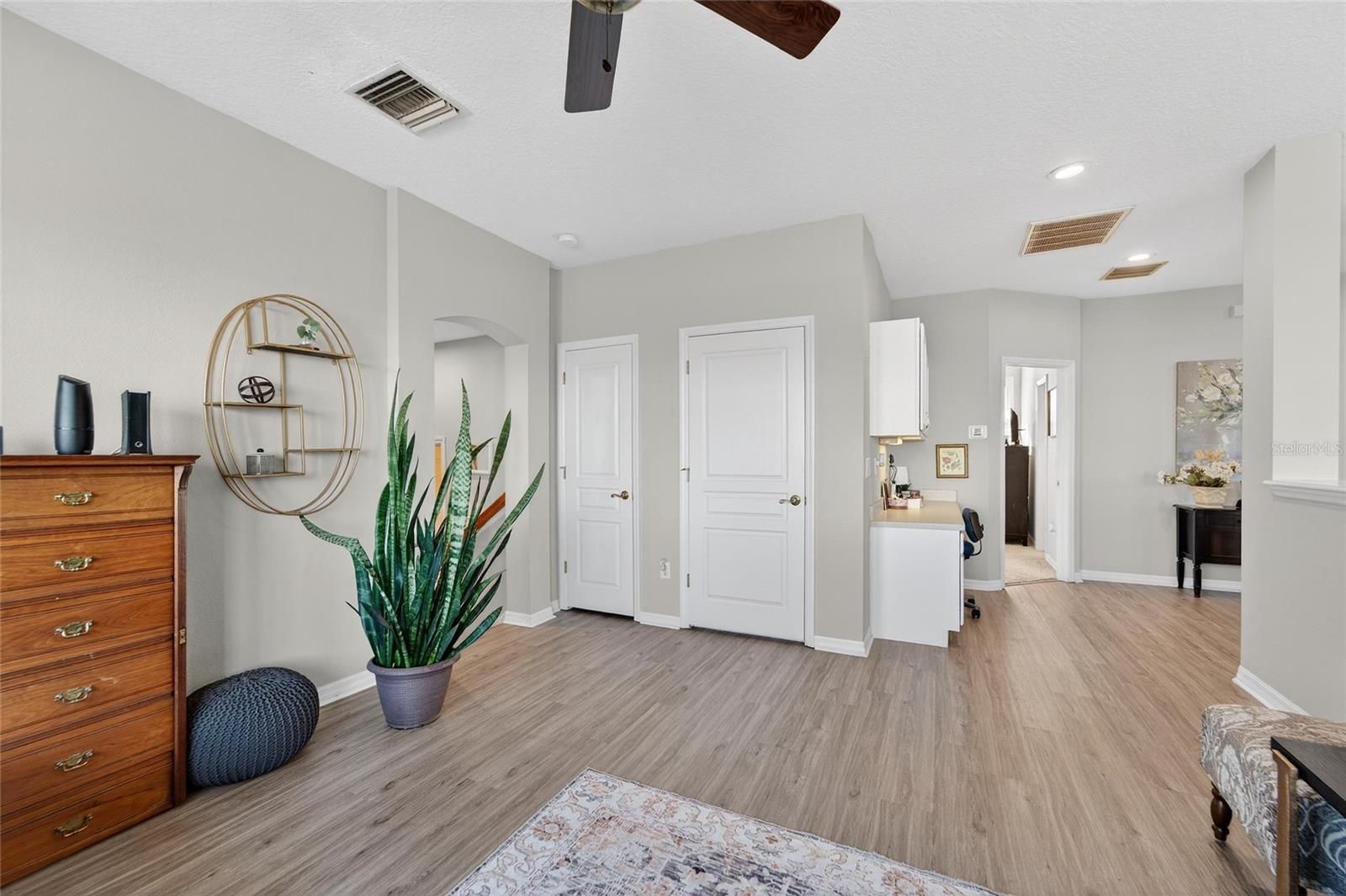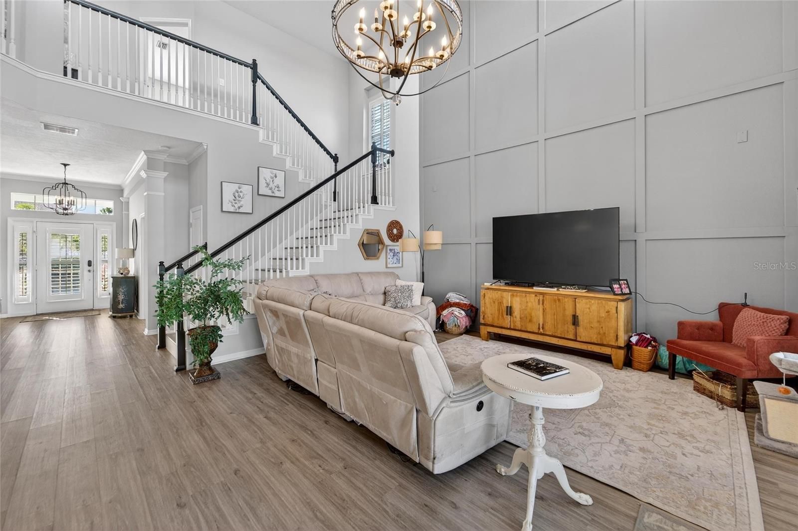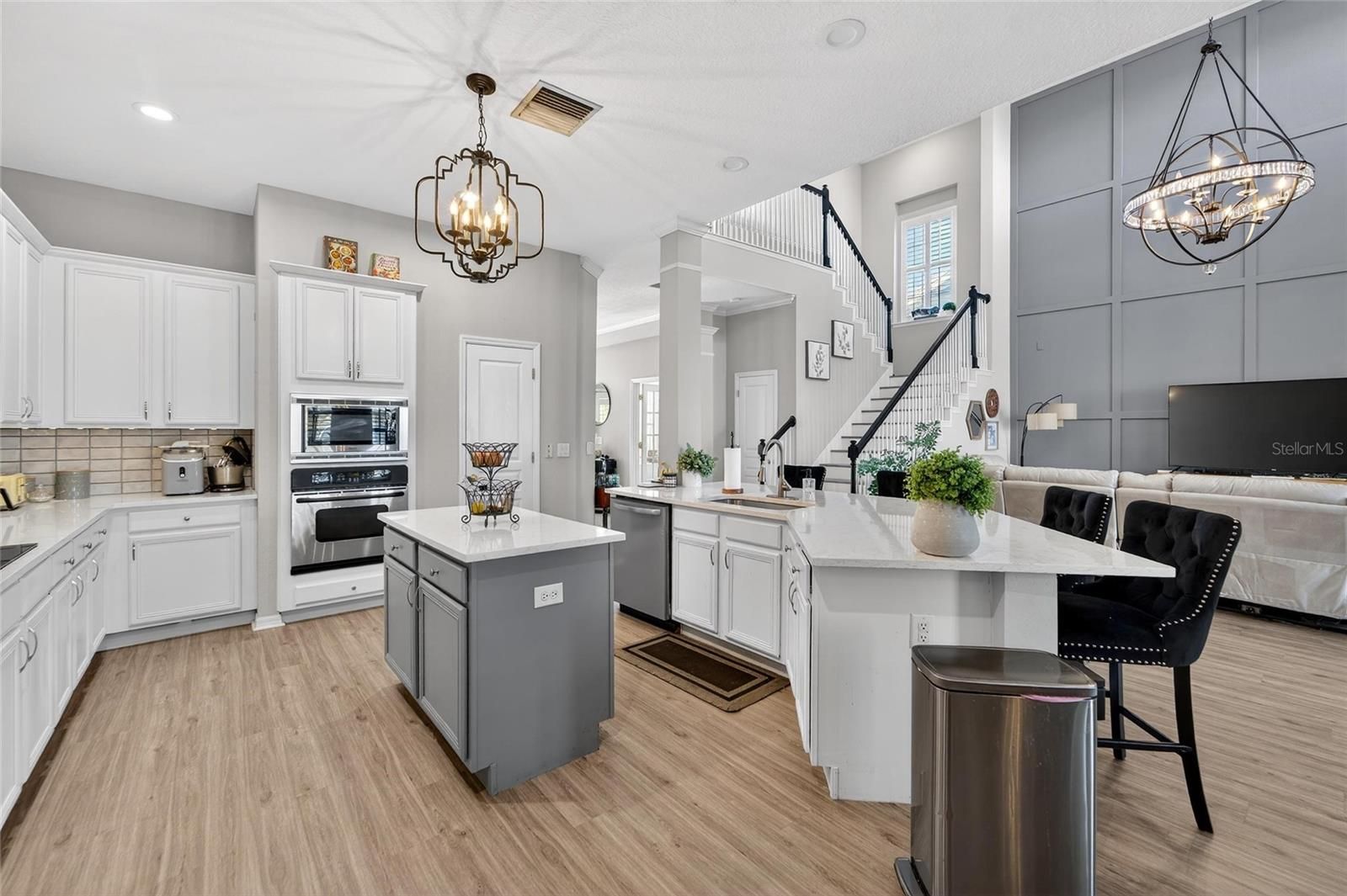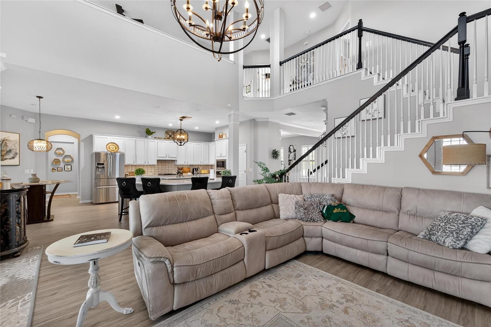 - Cathedral Ceiling(s), High Ceilings, Kitchen/Family Room Combo, Main Level Primary, Stone Counters