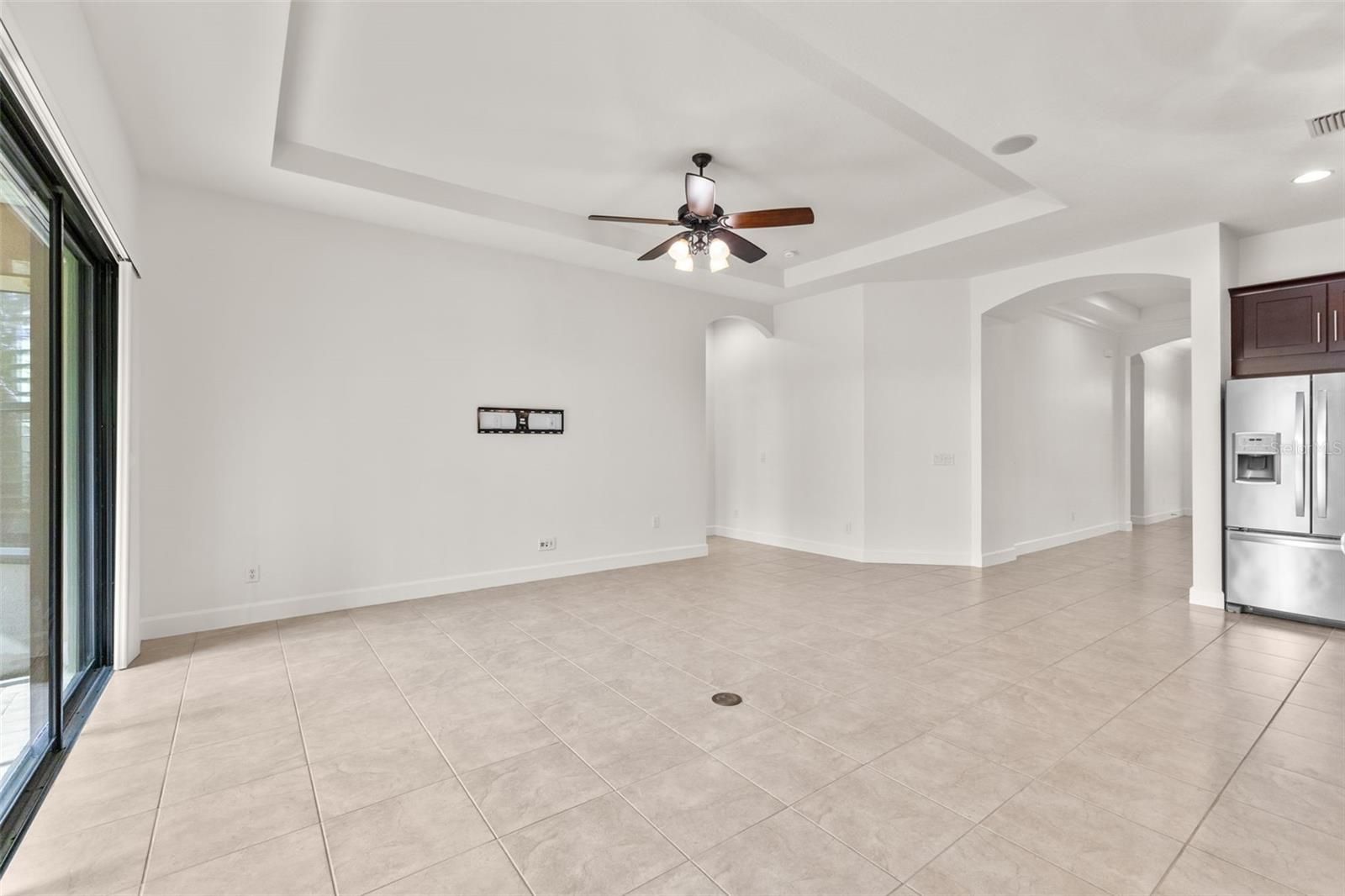 - Ceiling Fan(s), Coffered Ceiling(s), Eat-in Kitchen, High Ceilings, Kitchen/Family Room Combo, Open Floorplan, Main Level Primary, Solid-Wood Cabinets, Stone Counters, Walk-In Closet(s), Window Treatments