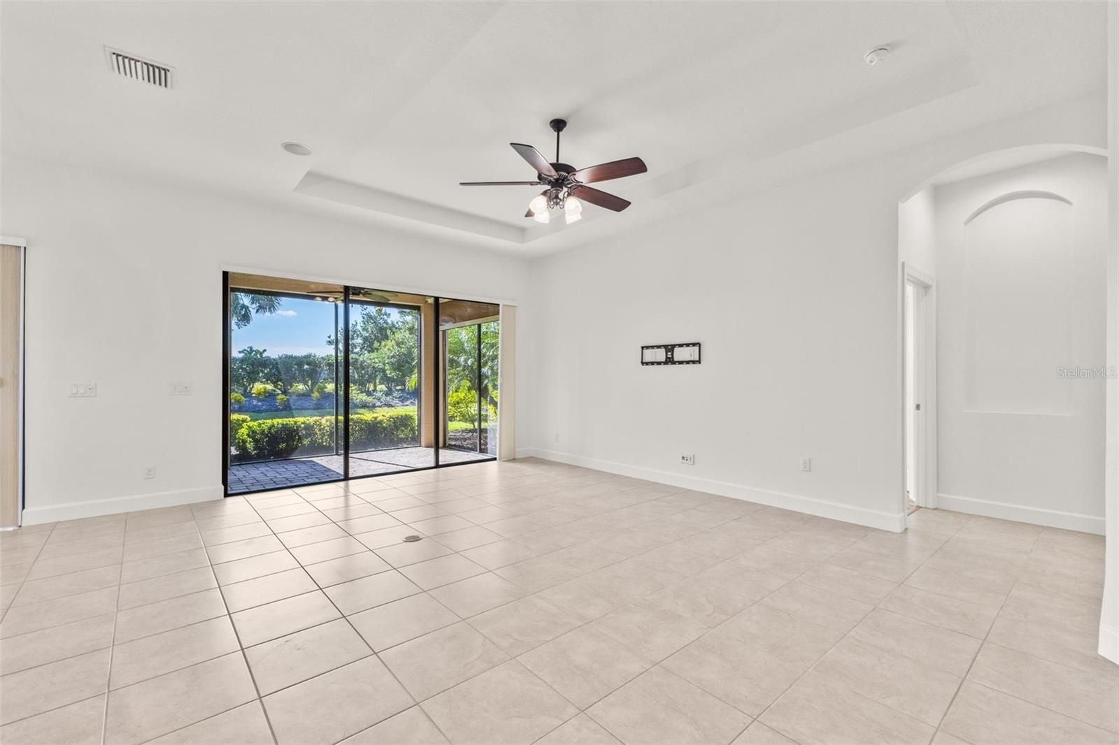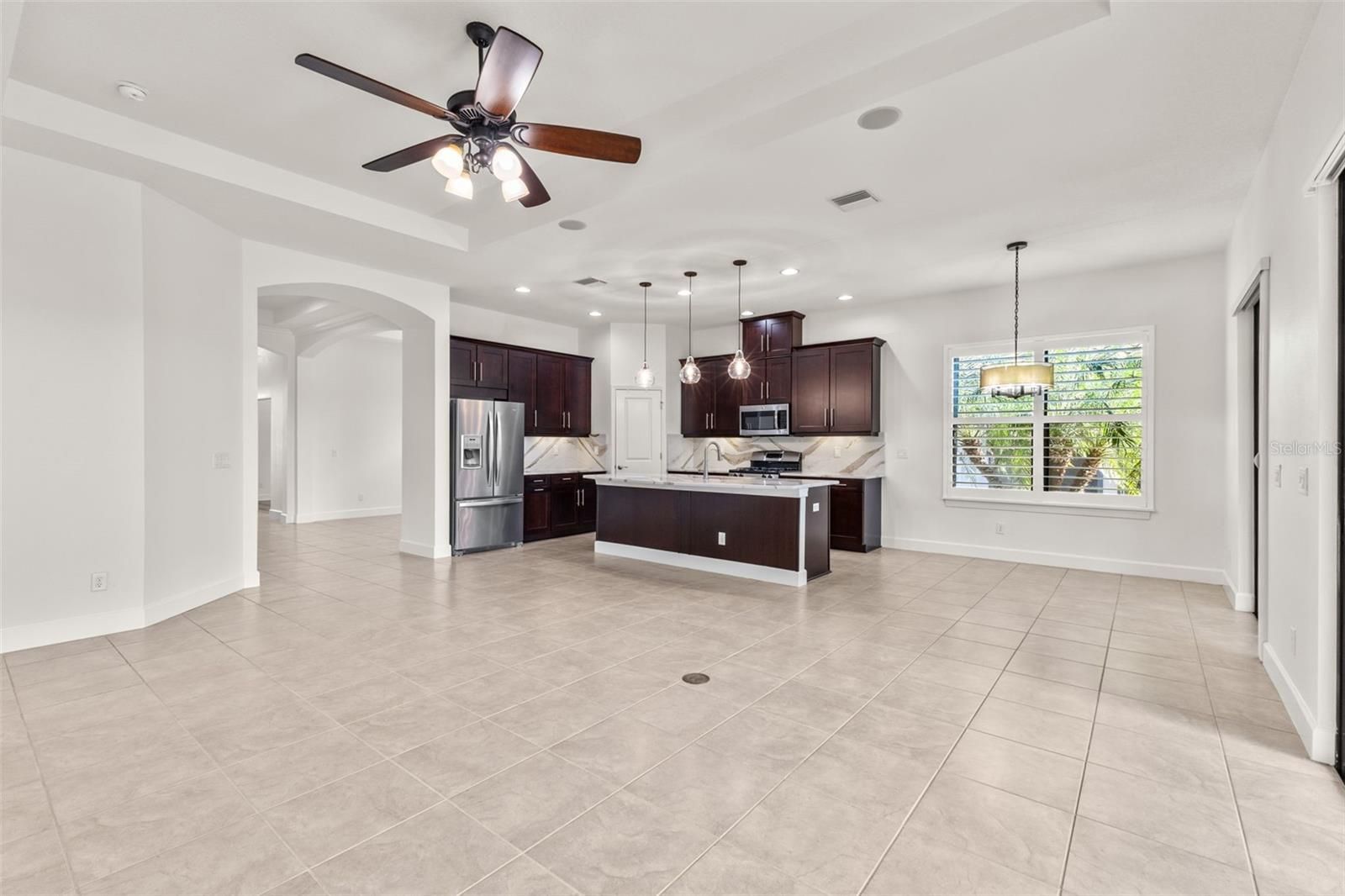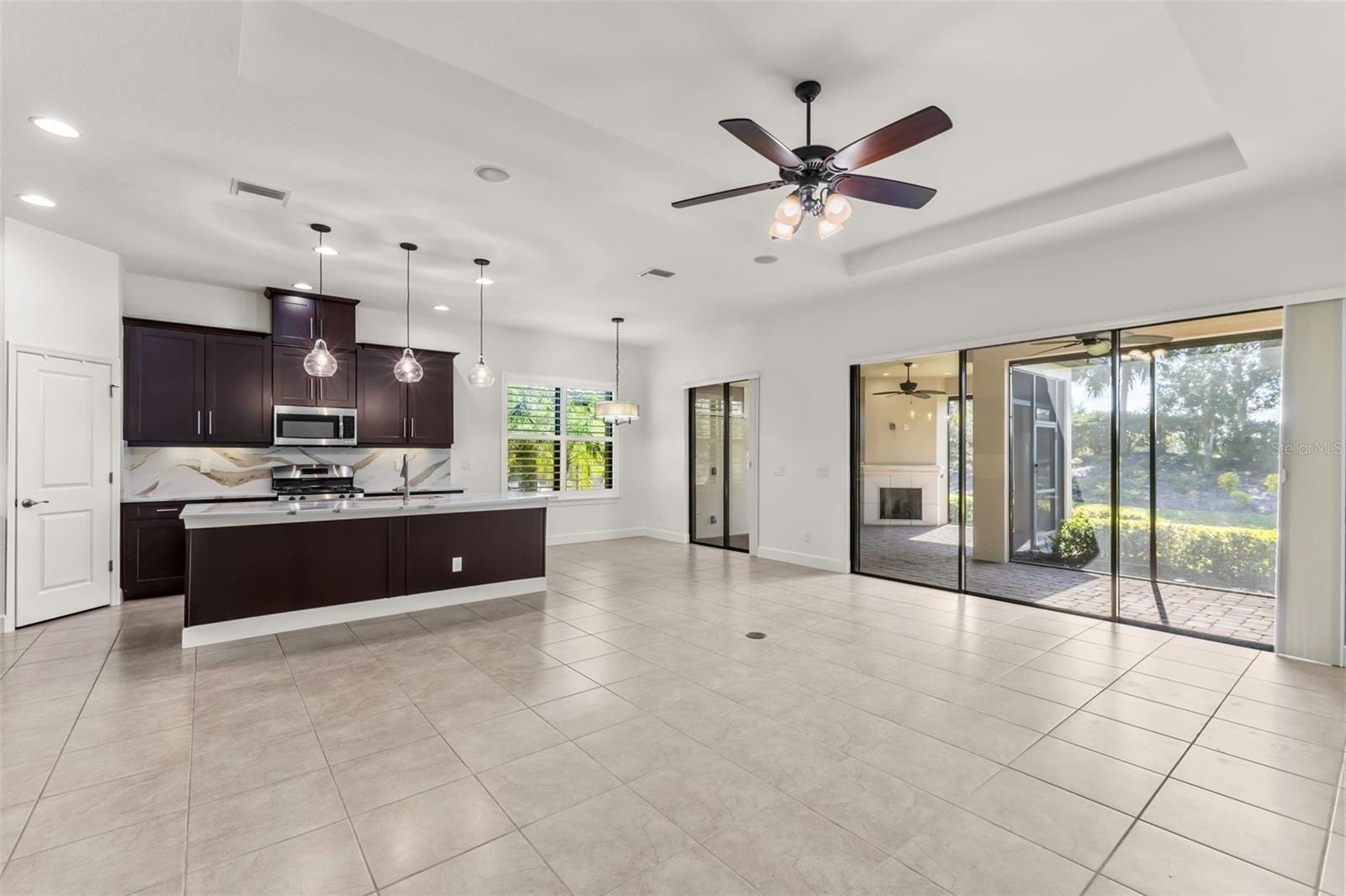 Welcome to 5242 Napoli Run, an exceptional residence located in the highly desirable Esplanade Golf & Country Club in Lakewood Ranch. This beautifully upgraded 2-bedroom plus den/office, 2.5-bath home offers 2,053 sq. ft. of elegant living space and includes a golf-deeded homesite, providing golf membership for two—all included in the HOA fees. Step inside to discover a thoughtfully designed floor plan enhanced by premium upgrades throughout, including stylish flooring, upgraded bathrooms, and custom closets that elevate both comfort and functionality. The spacious gourmet kitchen and open-concept living areas make this home ideal for entertaining or enjoying quiet evenings in. One of the standout features of this property is its expansive screened-in back porch, complete with a built-in outdoor gas fireplace—perfect for year-round relaxation. The backyard offers exceptional privacy with lush landscaping and a tranquil pond view just beyond, creating a serene outdoor retreat. Esplanade is renowned for its amenity-rich lifestyle, featuring a resort-style community pool, tennis courts, pickleball courts, a state-of-the-art fitness center, on-site restaurant, Tiki bar, and beautifully maintained walking paths. With its vibrant community atmosphere and unparalleled amenities, Esplanade remains one of Lakewood Ranch’s most sought-after neighborhoods. Updates completed recently in this home include: New quartz countertops, new showers, LVP flooring in bedrooms and office, custom closets, new light in kitchen/foyeer, plantation shitters, new hot water heater (2025) and hurricane screens on all Lanai/porch openings.
