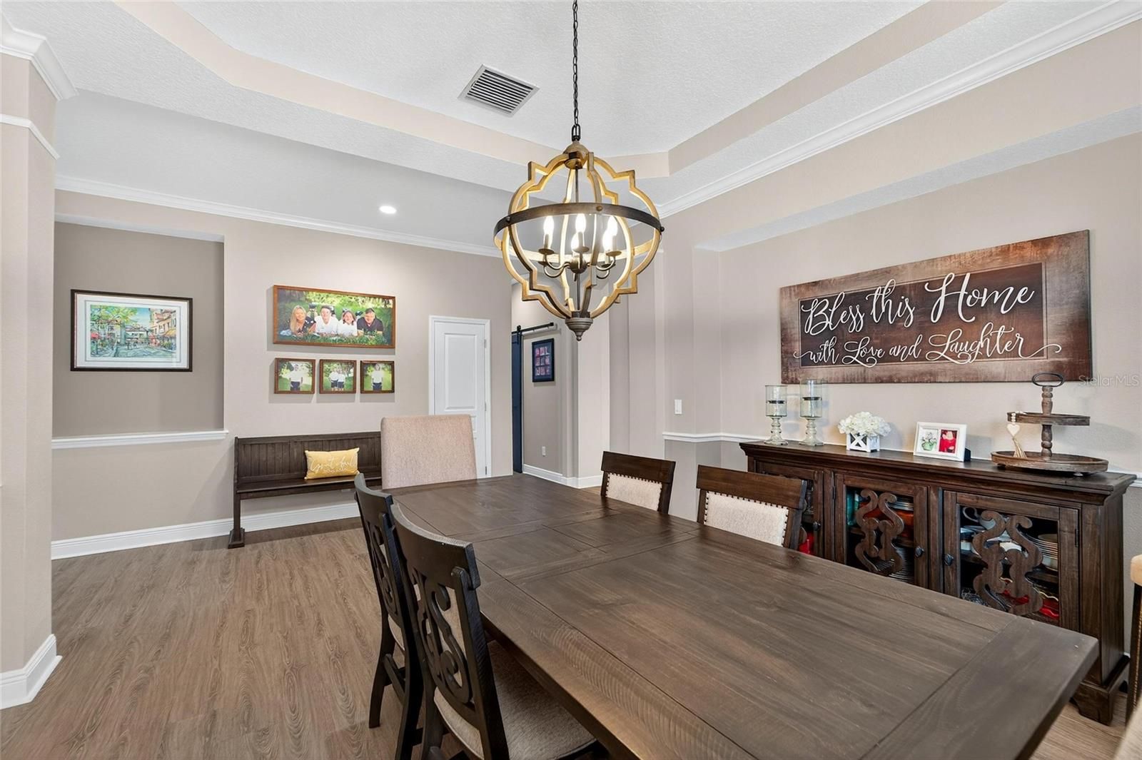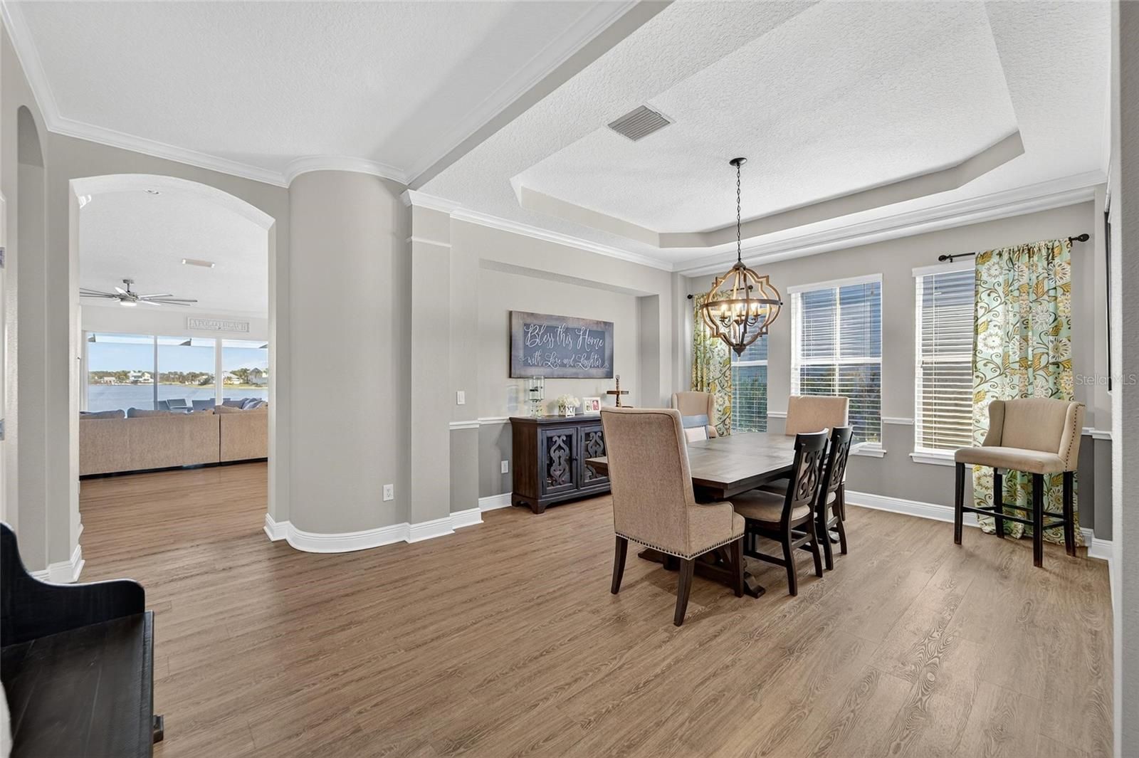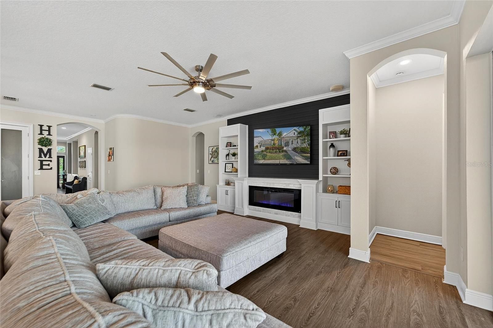 - Ceiling Fan(s), Crown Molding, High Ceilings, Open Floorplan, Solid-Wood Cabinets, Split Bedrooms, Stone Counters, Walk-In Closet(s), Window Treatments