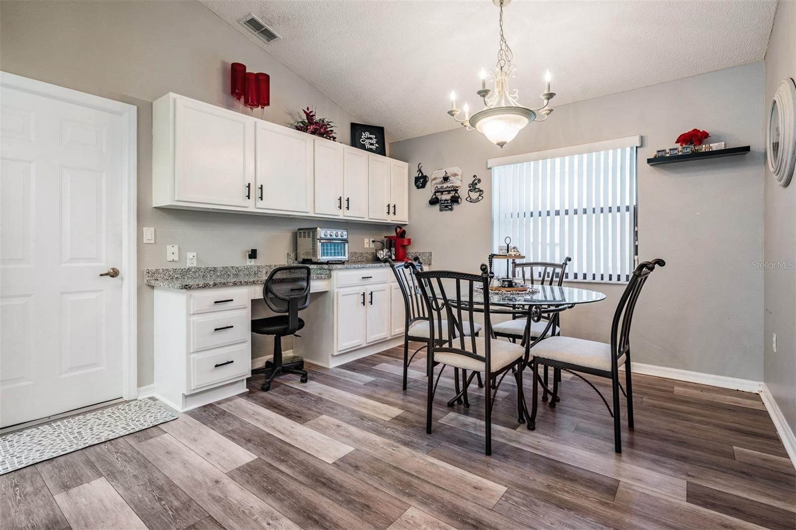 - Ceiling Fan(s), Eat-in Kitchen, Kitchen/Family Room Combo, Open Floorplan, Split Bedrooms, Stone Counters, Thermostat, Vaulted Ceiling(s), Walk-In Closet(s), Window Treatments