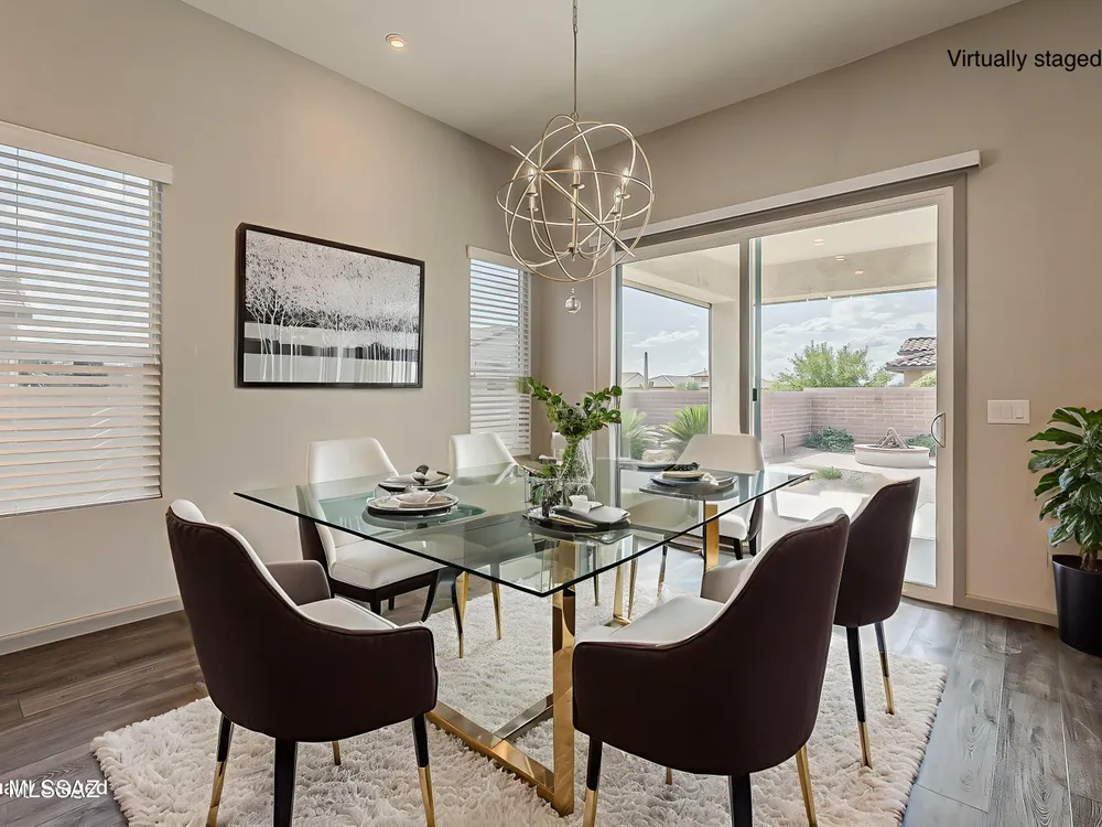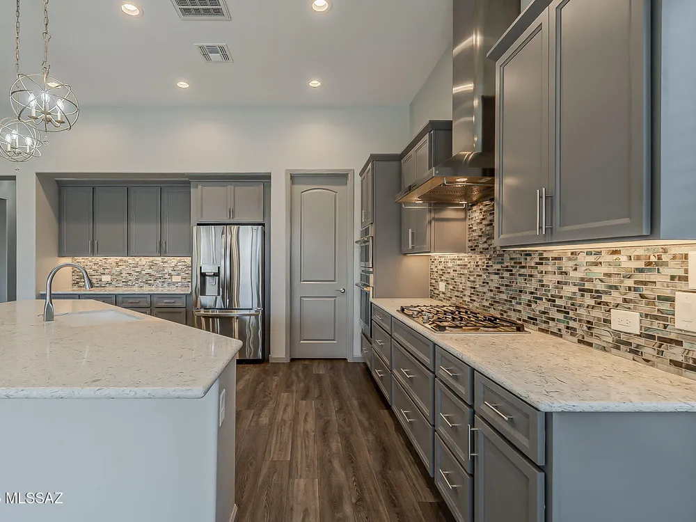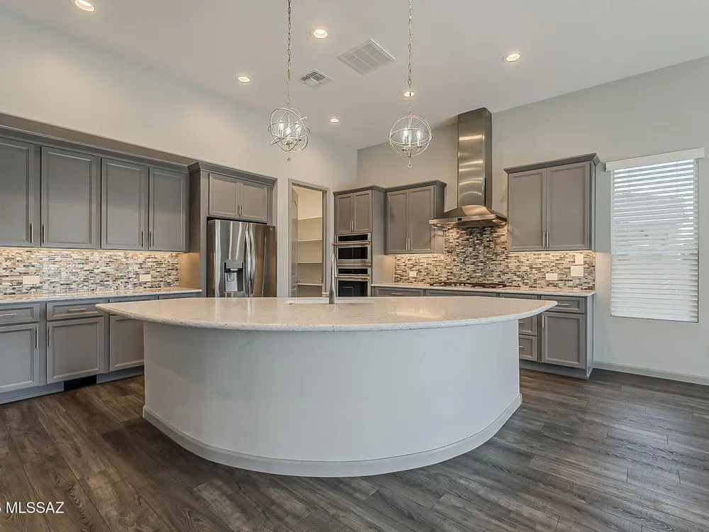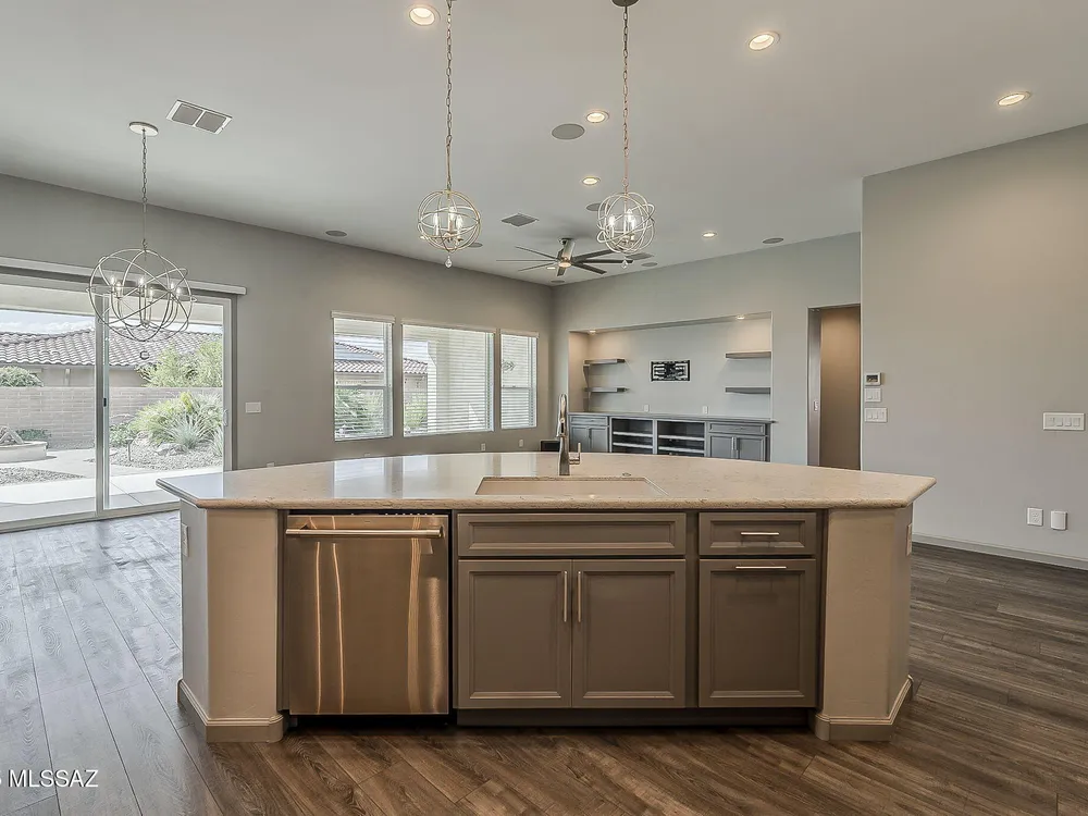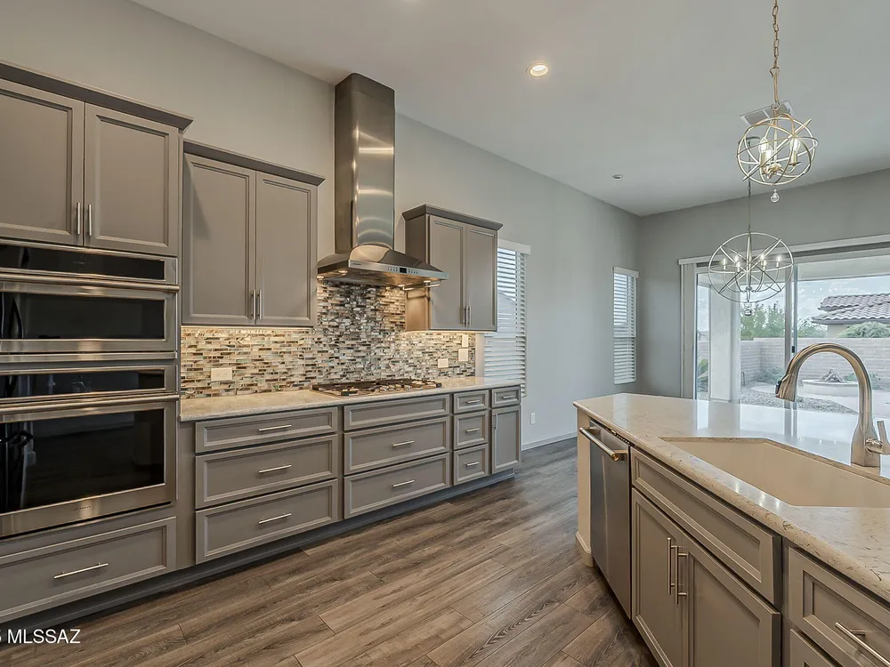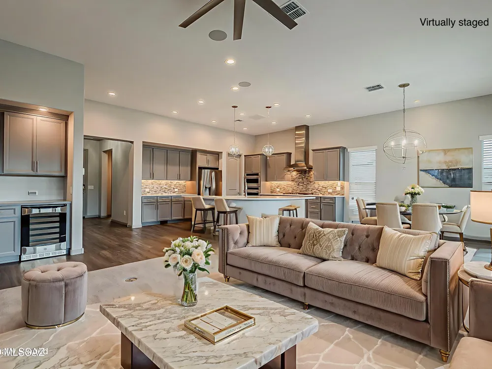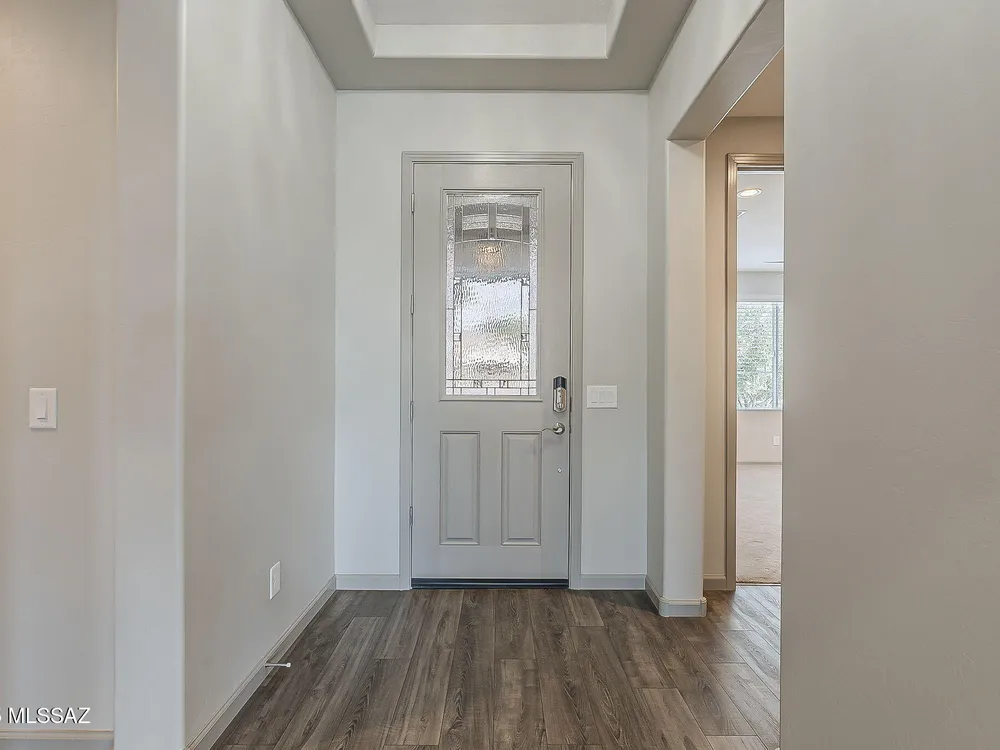 This stunning Vienta model, built by Robson just four years ago, is located in the resort community of Quail Creek. It feels like new and provides access to an incredible array of amenities including pickleball, tennis, golf, clubs, activities, woodworking and so much more, offering endless ways to enjoy every day here. From the moment you arrive, the home's impressive curb appeal sets the tone, featuring beautiful architectural details and well-designed landscaping. A handsome security door leads you into the covered front porch and 8-foot entry door, welcoming you inside. The spacious entry hallway immediately gives a sense of elegance with its luxury vinyl plank flooring, tray ceiling, and clear sight lines that draw your eye all the way through to the backyard. The great room offers