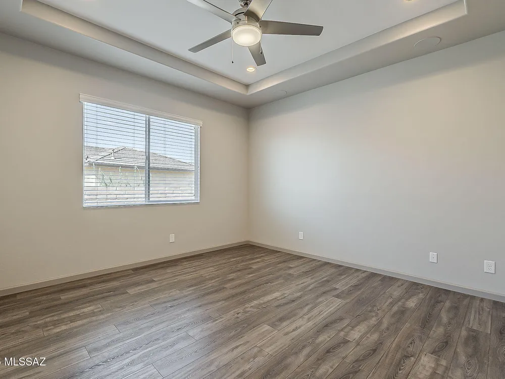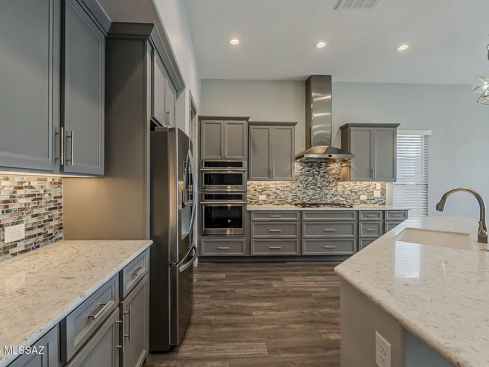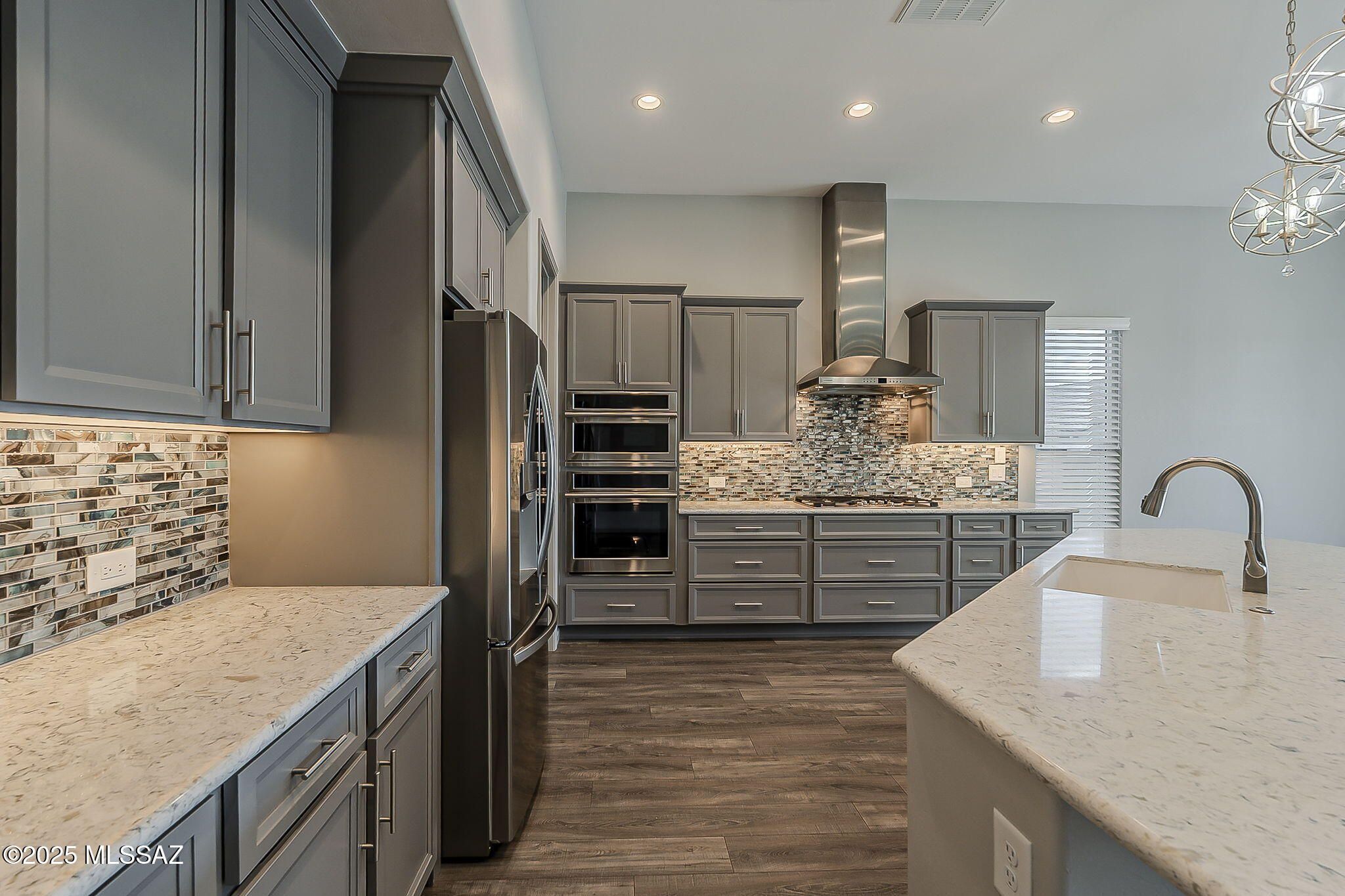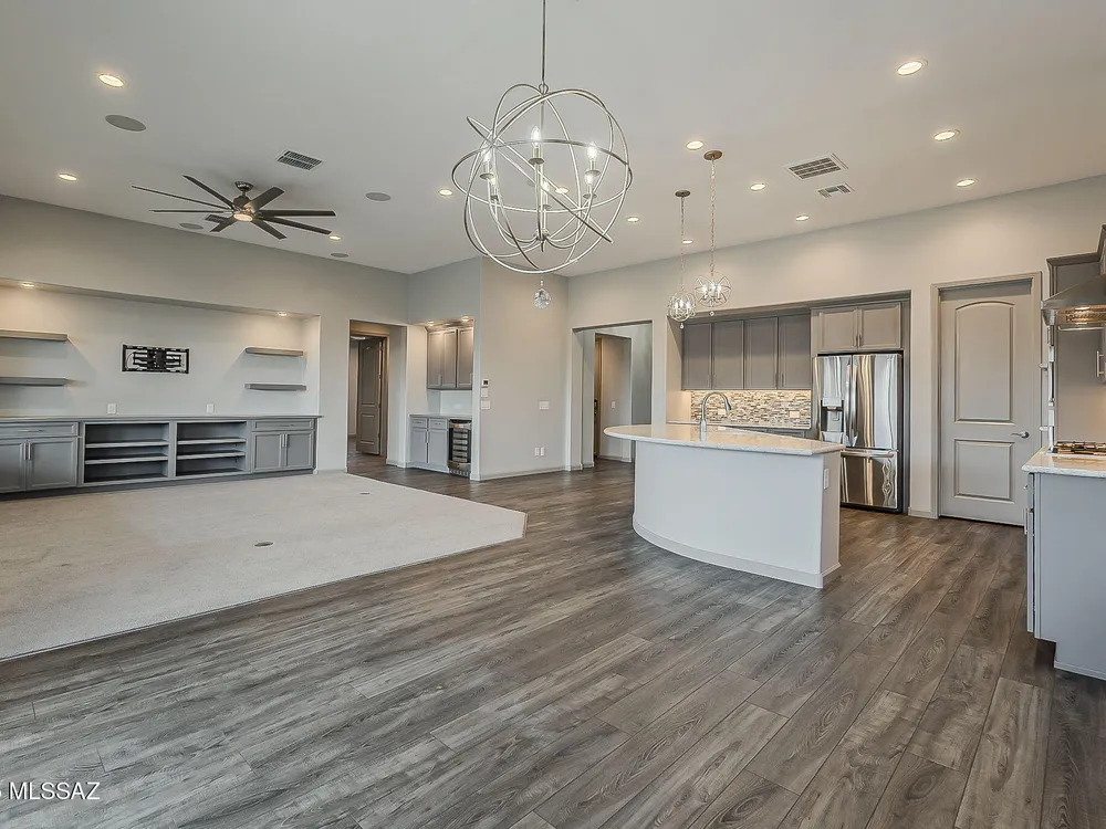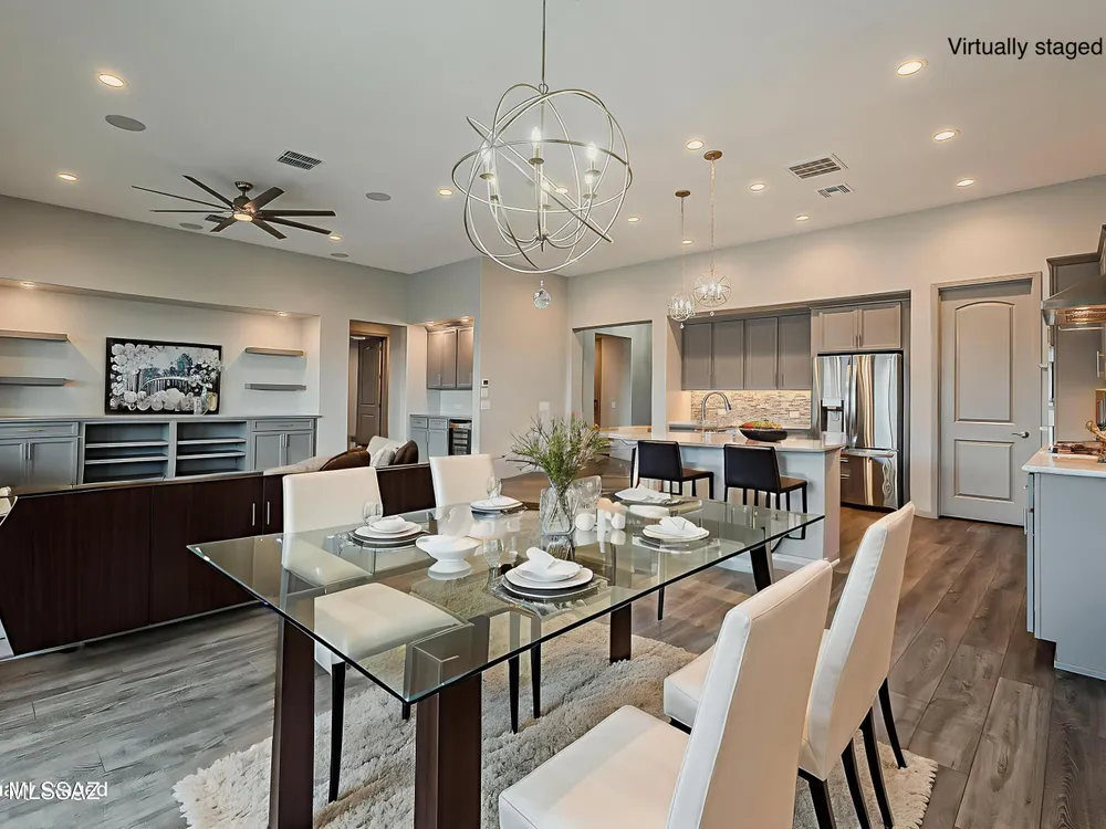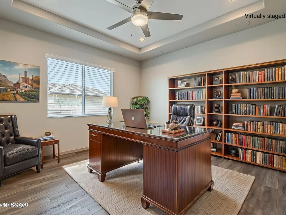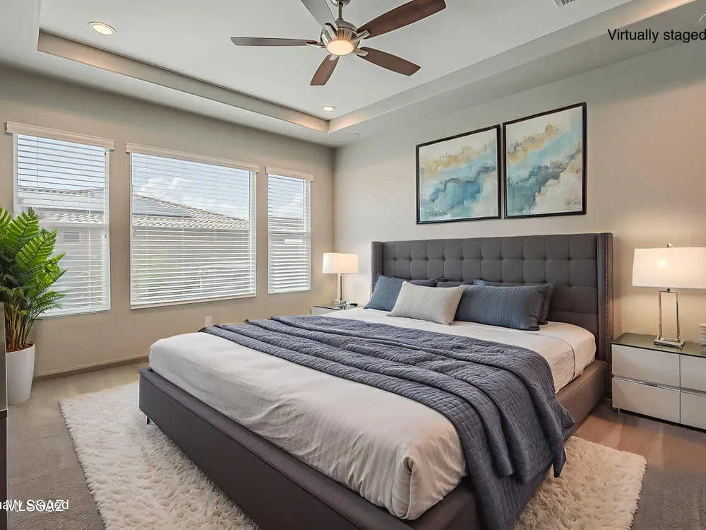 This stunning Vienta model, built by Robson just four years ago, is located in the resort community of Quail Creek. It feels like new and provides access to an incredible array of amenities including pickleball, tennis, golf, clubs, activities, woodworking and so much more, offering endless ways to enjoy every day here. From the moment you arrive, the home's impressive curb appeal sets the tone, featuring beautiful architectural details and well-designed landscaping. A handsome security door leads you into the covered front porch and 8-foot entry door, welcoming you inside. The spacious entry hallway immediately gives a sense of elegance with its luxury vinyl plank flooring, tray ceiling, and clear sight lines that draw your eye all the way through to the backyard. The great room offers