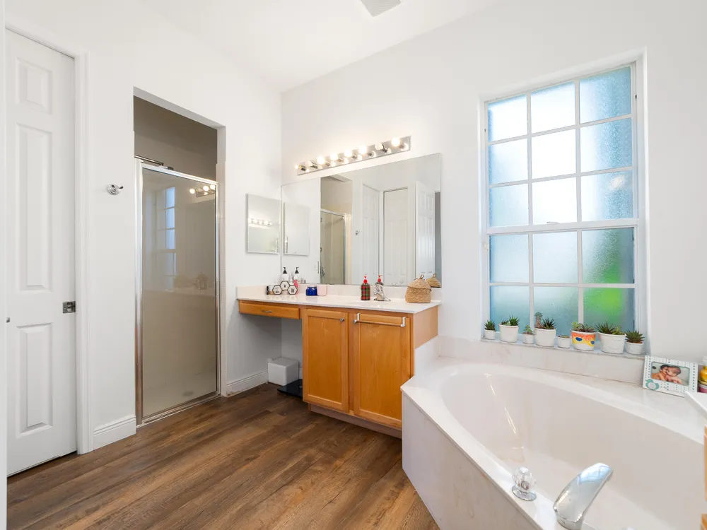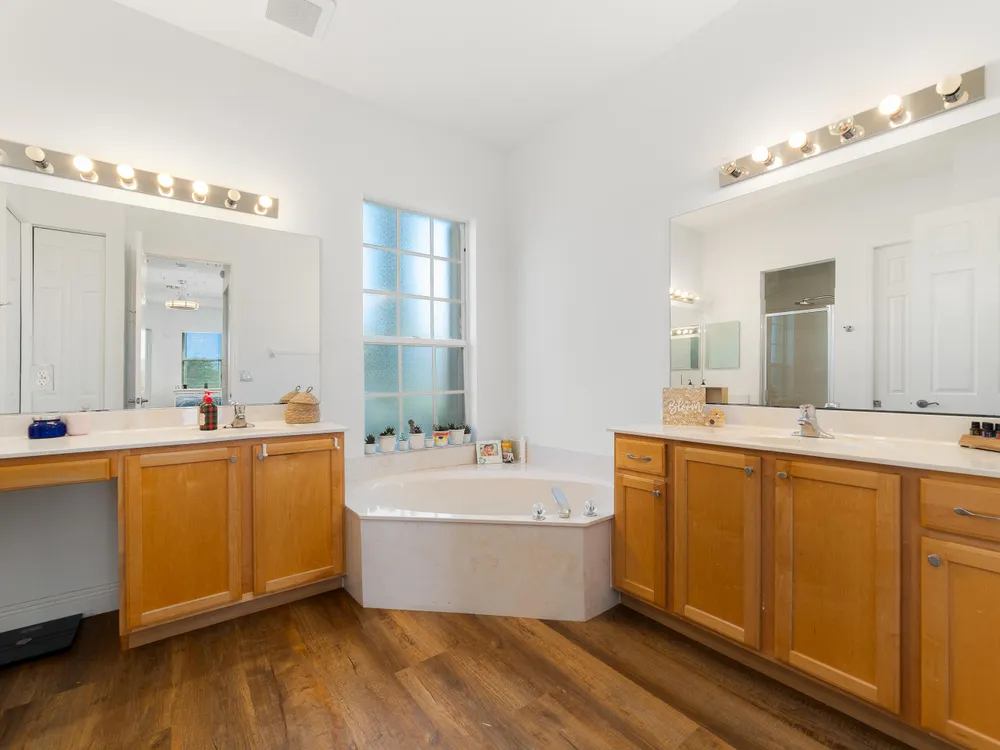 - Entry Level Living Area, French Door(s)/Atrium Door(s), Pantry, Garden Tub/Roman Tub, Split Bedrooms, Walk-In Closet(s), Family Room, Family/Dining Room, Separate/Formal Dining Room, Blinds, Sliding Window(s), Dual Sinks, Primary Downstairs, Separate Shower, Bathtub, Washer/Dryer Hookup