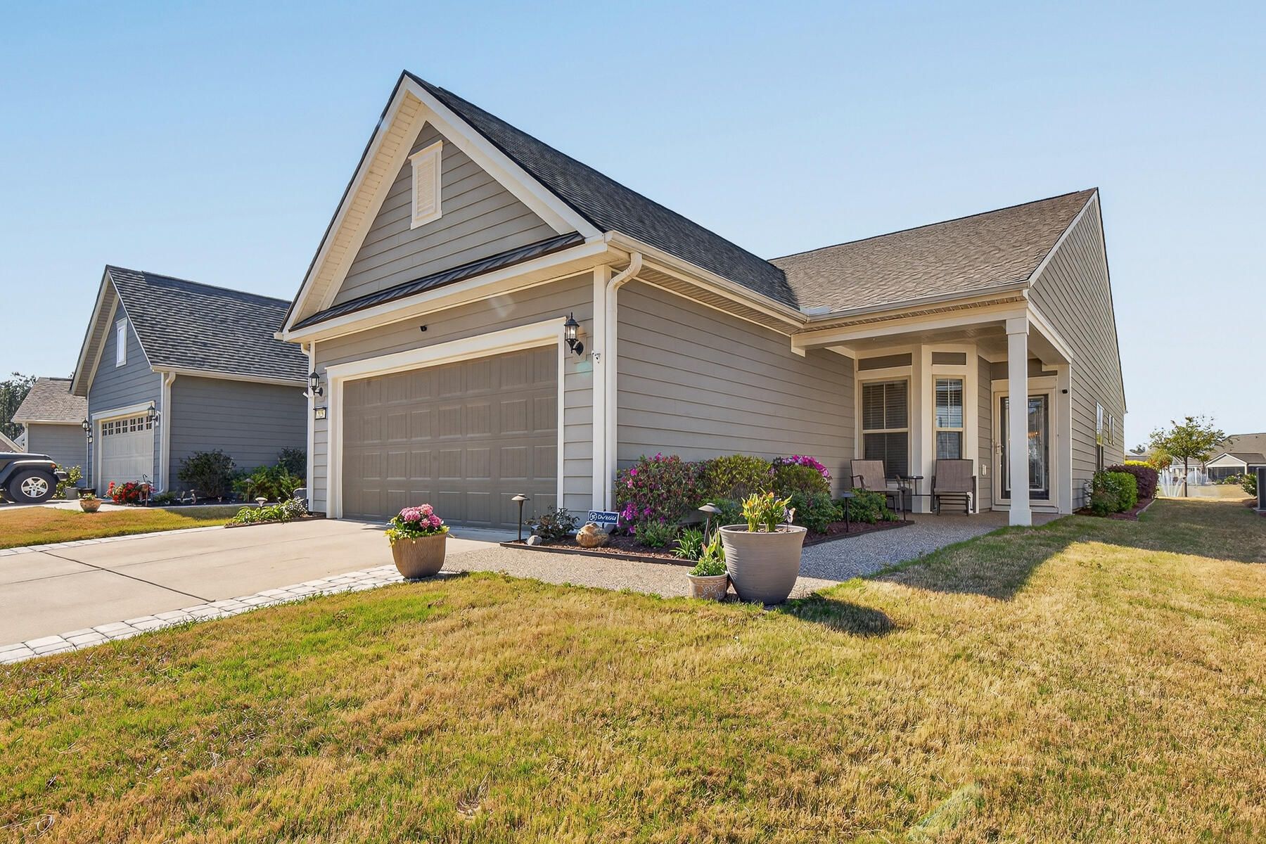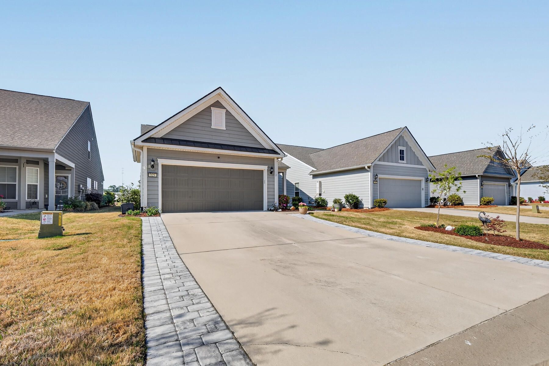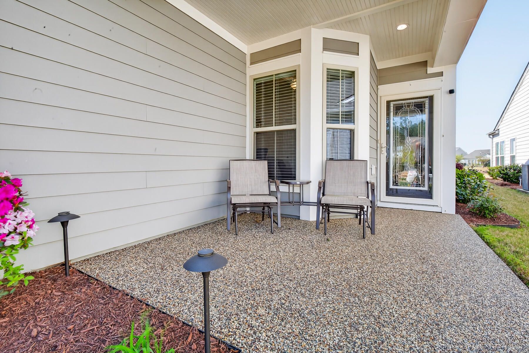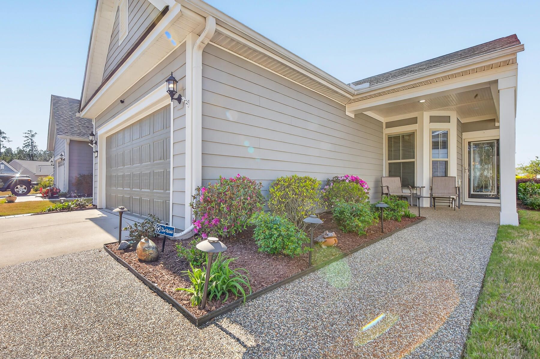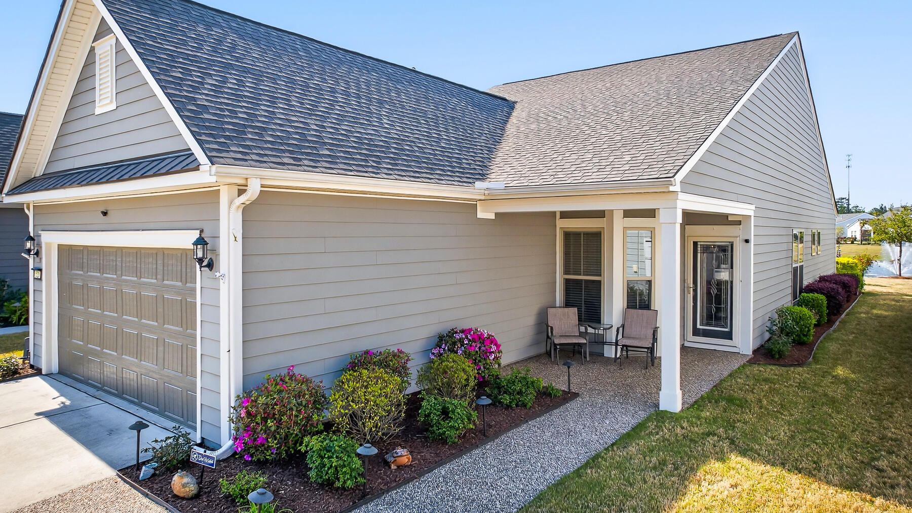 Stunning one-story home featuring 2 bedrooms, a dedicated office, and 1,426 square feet of bright, open living space. This one-owner home has been meticulously maintained and thoughtfully upgraded throughout. Located in the highly desirable gated 55+ community of Del Webb in Nexton, you'll enjoy easy access to I-26 and Midtown Nexton Square--offering shopping, dining, medical facilities, and more just minutes away. Perfectly positioned at the end of a quiet cul-de-sac, this home welcomes you with an extended driveway accented by beautiful sandstone pavers and a custom stone walkway leading to the front door--setting the tone for the quality found inside. Step into a beautifully appointed interior featuring luxury vinyl plank flooring throughout, custom blinds, and a bright, open layout...ideal for both everyday living and entertaining. The upgraded kitchen showcases quartz countertops, a spacious island, and professionally installed built-in glass cabinetry offering both style and added storage. The primary suite is a true retreat, featuring a floor-to-ceiling tiled walk-in shower, dual vanities with a seated vanity space, and a generous walk-in closet. Additional highlights include epoxy-coated garage flooring, added storage racks, and convenient pull-down attic access. Step outside and unwind in your own private oasis. The sun room features sandstone flooring and overlooks an extended stone paver patio with a pergola for shade and a decorative metal privacy screen. Enjoy peaceful mornings or relaxing evenings with serene pond and fountain views--perfect for entertaining or simply soaking in the ambiance.