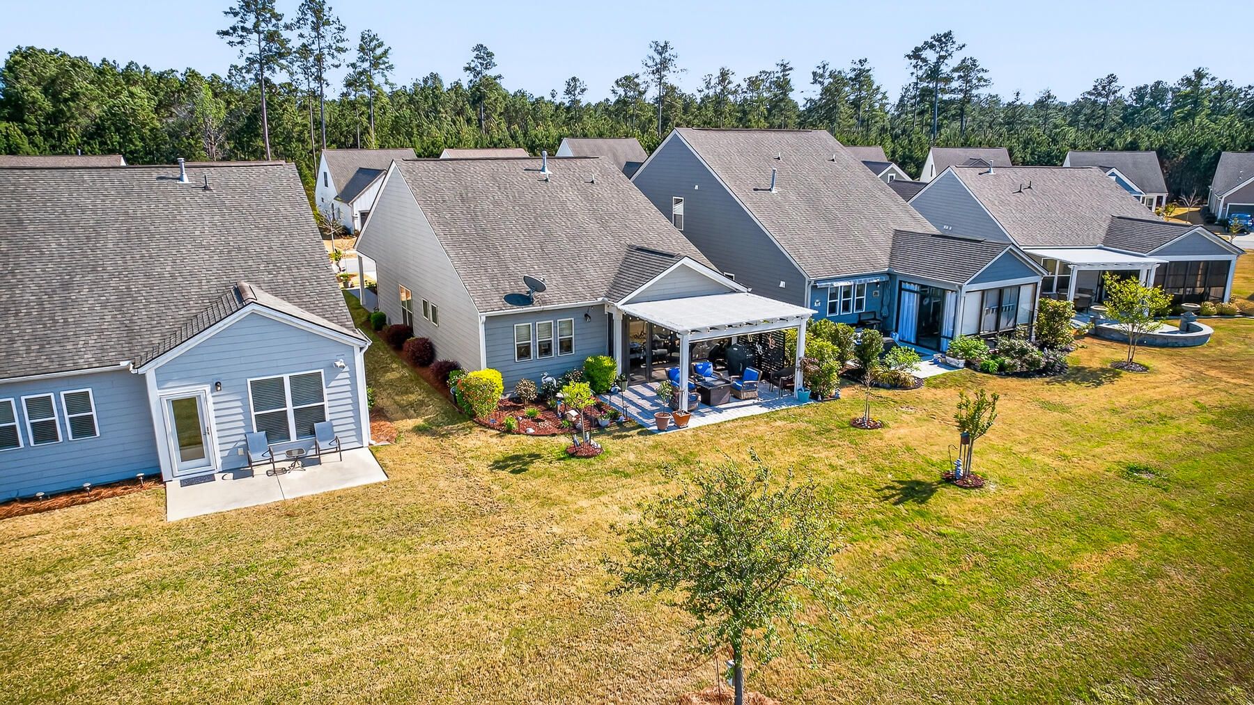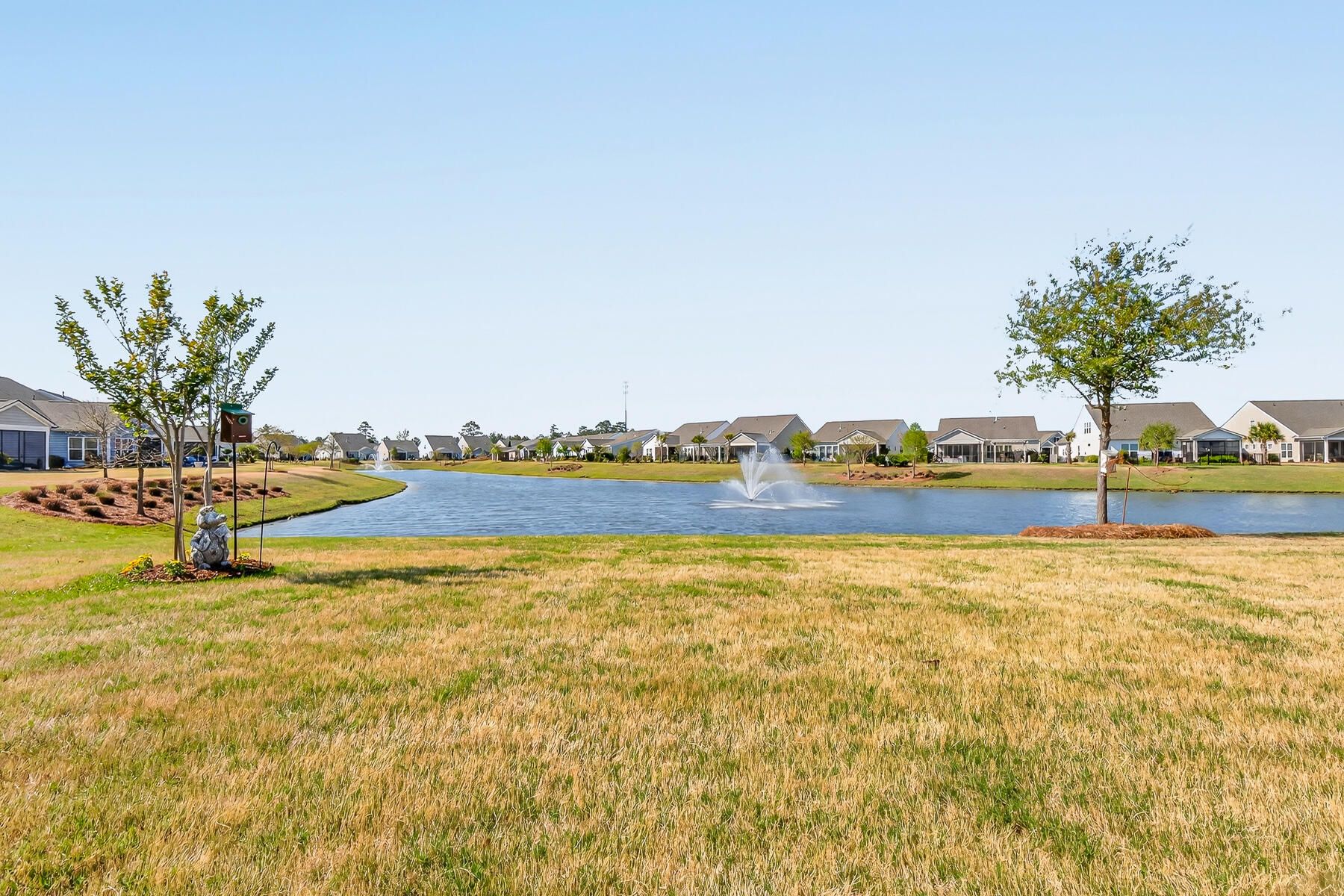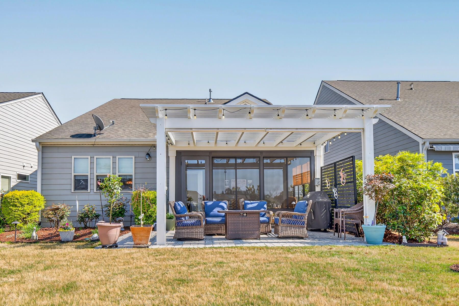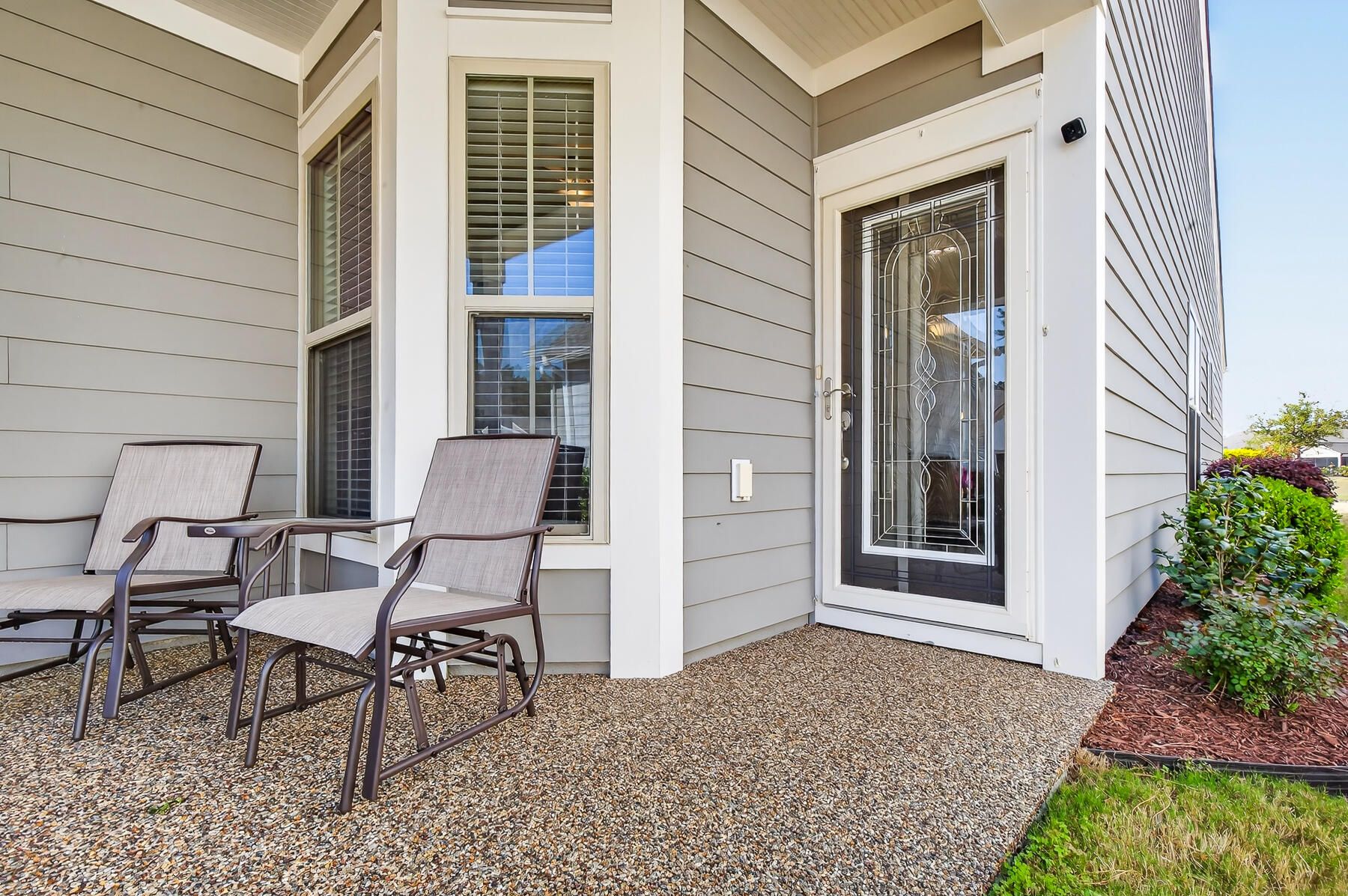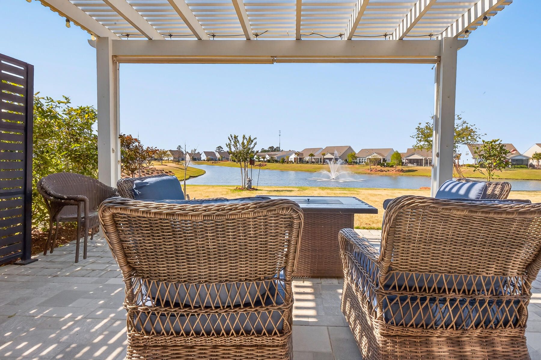 Stunning one-story home featuring 2 bedrooms, a dedicated office, and 1,426 square feet of bright, open living space. This one-owner home has been meticulously maintained and thoughtfully upgraded throughout. Located in the highly desirable gated 55+ community of Del Webb in Nexton, you'll enjoy easy access to I-26 and Midtown Nexton Square--offering shopping, dining, medical facilities, and more just minutes away. Perfectly positioned at the end of a quiet cul-de-sac, this home welcomes you with an extended driveway accented by beautiful sandstone pavers and a custom stone walkway leading to the front door--setting the tone for the quality found inside. Step into a beautifully appointed interior featuring luxury vinyl plank flooring throughout, custom blinds, and a bright, open layout...ideal for both everyday living and entertaining. The upgraded kitchen showcases quartz countertops, a spacious island, and professionally installed built-in glass cabinetry offering both style and added storage. The primary suite is a true retreat, featuring a floor-to-ceiling tiled walk-in shower, dual vanities with a seated vanity space, and a generous walk-in closet. Additional highlights include epoxy-coated garage flooring, added storage racks, and convenient pull-down attic access. Step outside and unwind in your own private oasis. The sun room features sandstone flooring and overlooks an extended stone paver patio with a pergola for shade and a decorative metal privacy screen. Enjoy peaceful mornings or relaxing evenings with serene pond and fountain views--perfect for entertaining or simply soaking in the ambiance.