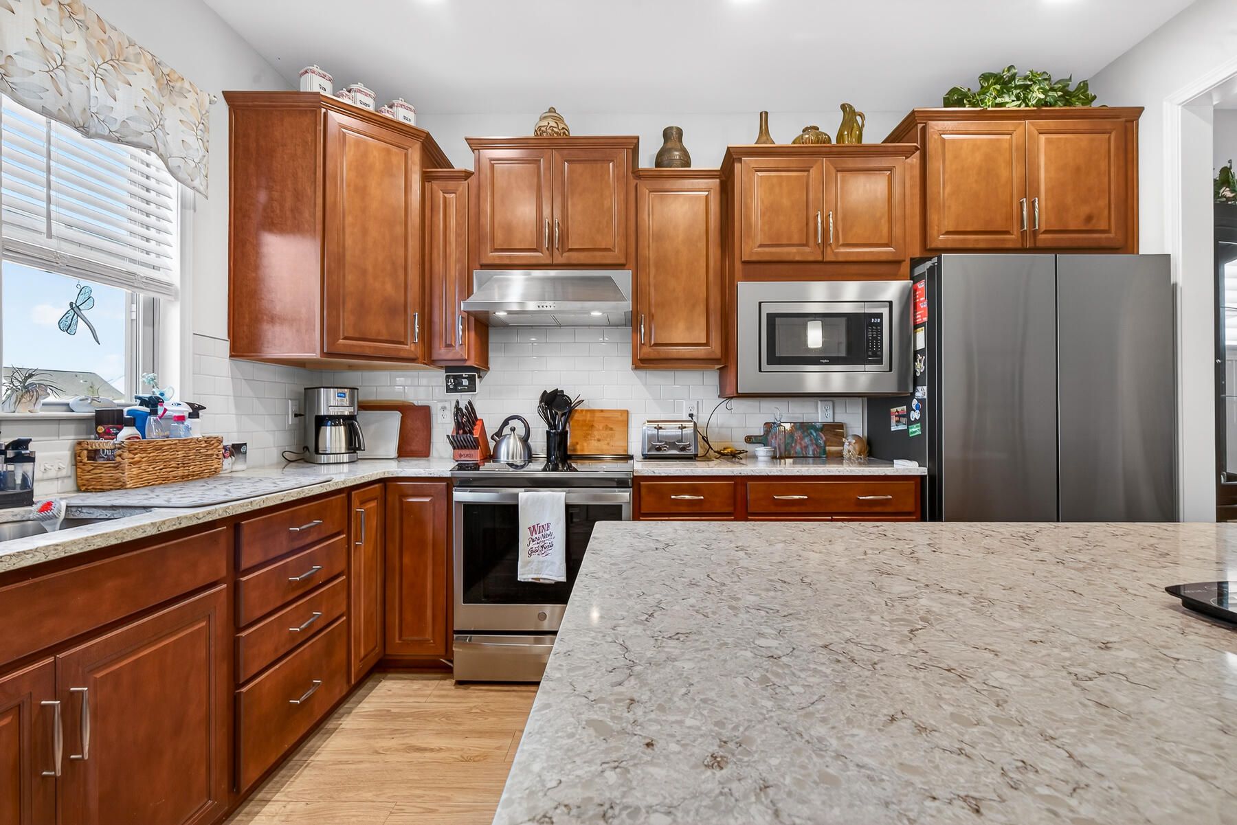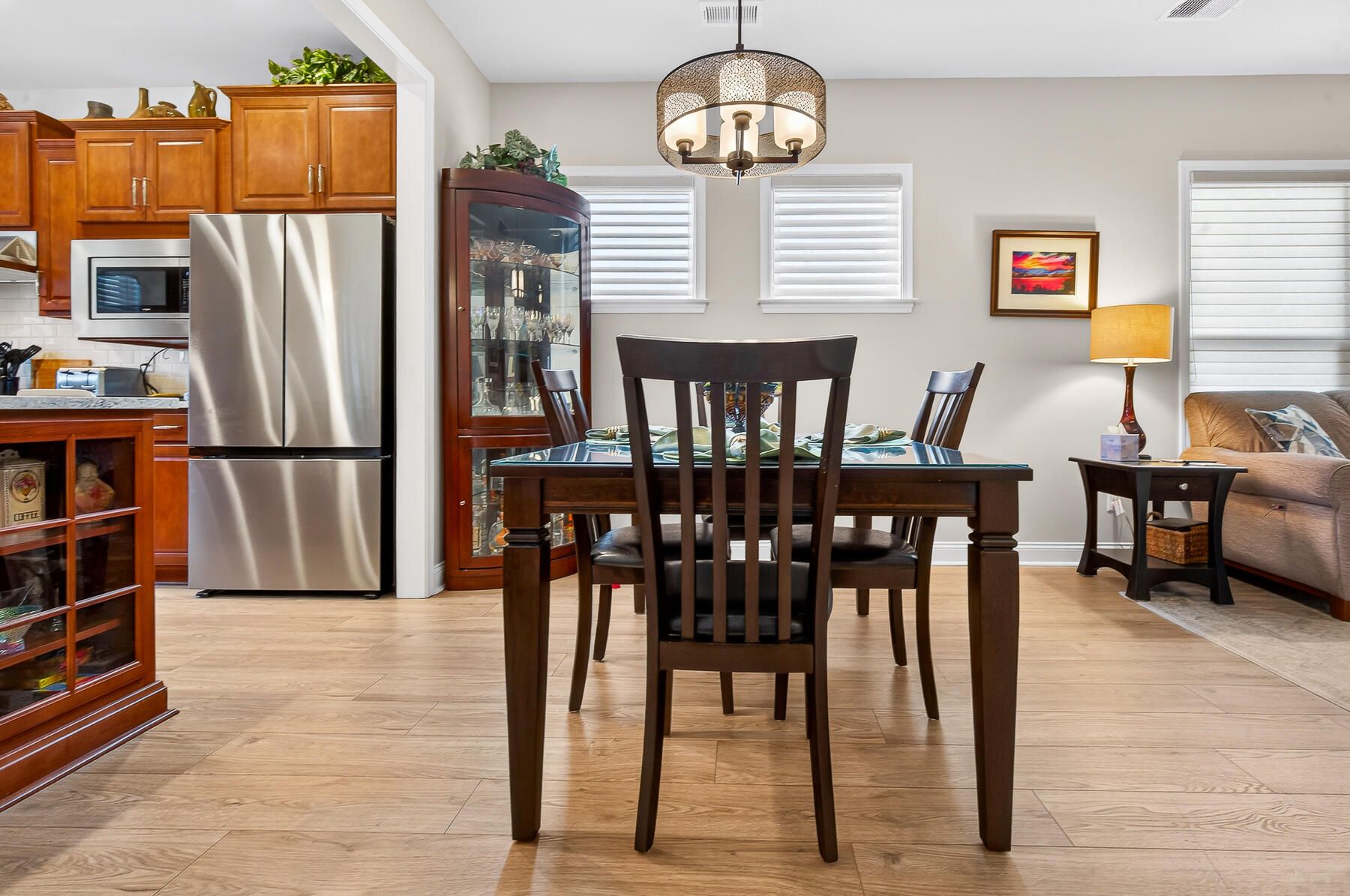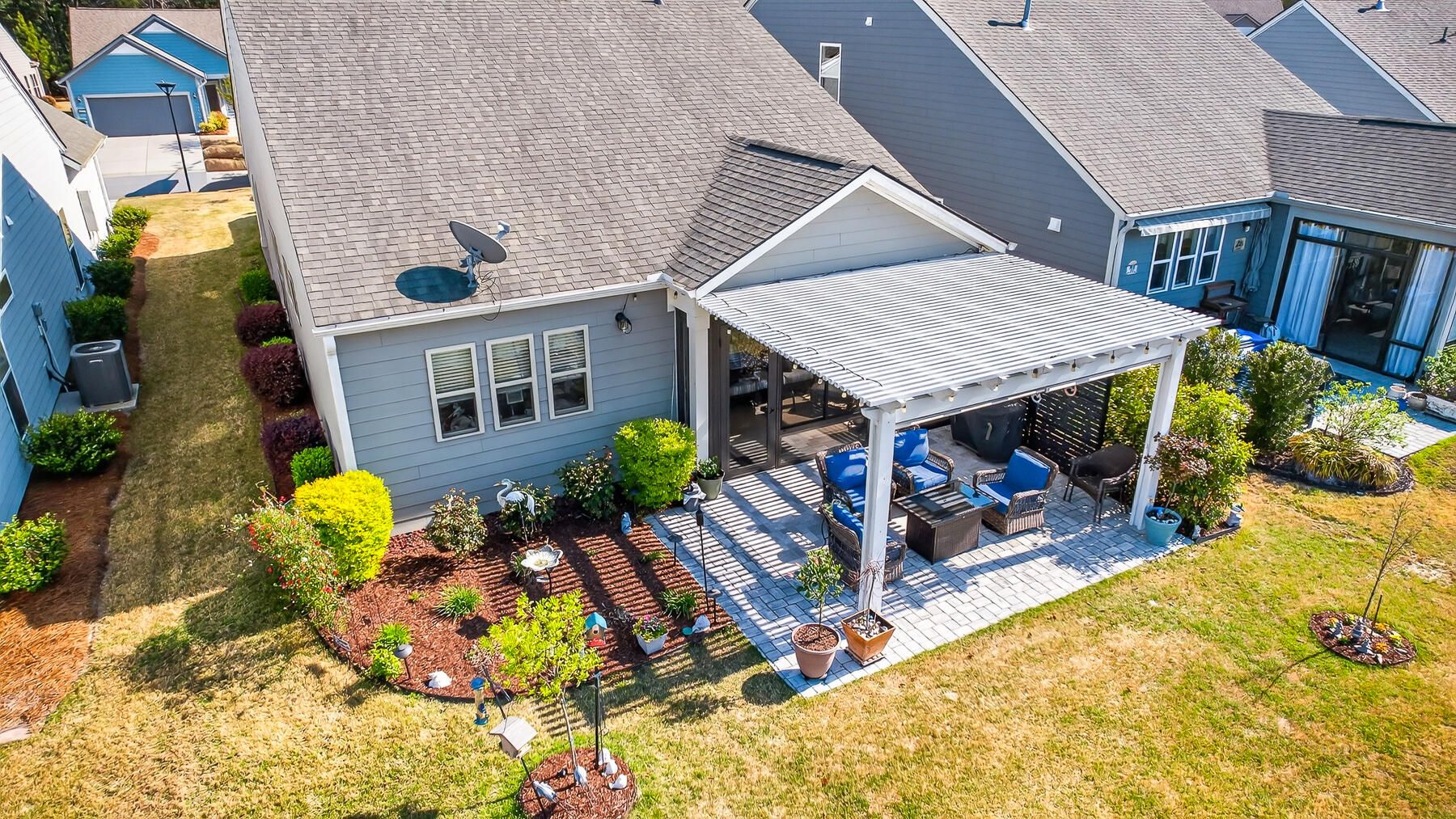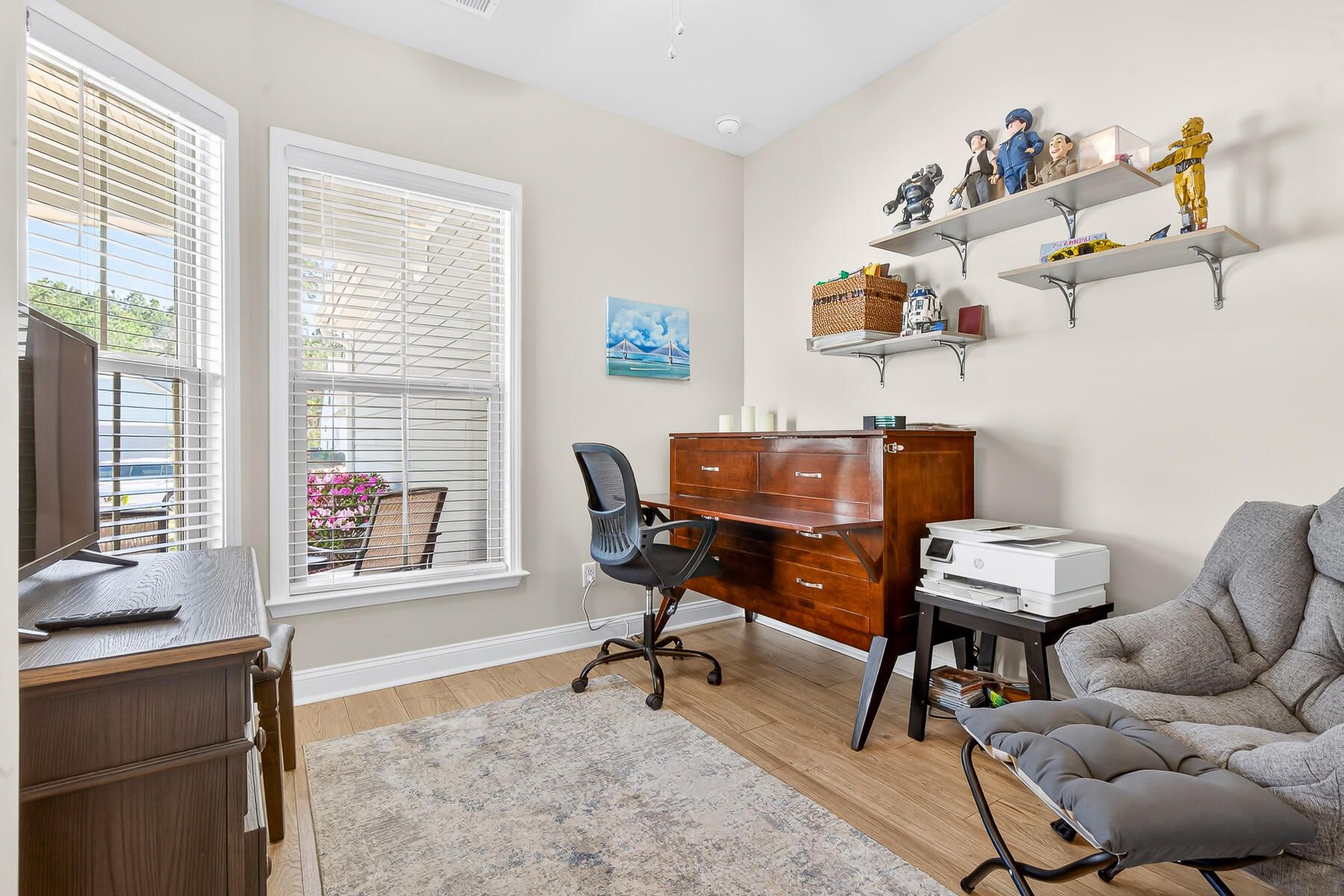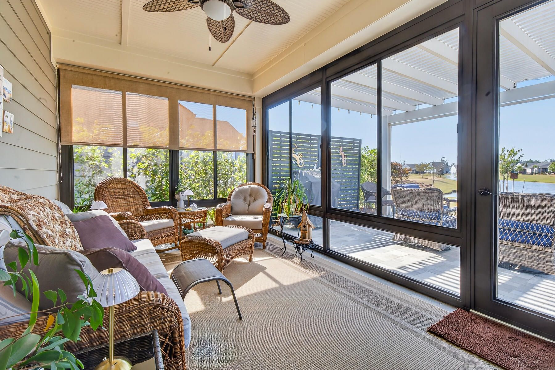 Stunning one-story home featuring 2 bedrooms, a dedicated office, and 1,426 square feet of bright, open living space. This one-owner home has been meticulously maintained and thoughtfully upgraded throughout. Located in the highly desirable gated 55+ community of Del Webb in Nexton, you'll enjoy easy access to I-26 and Midtown Nexton Square--offering shopping, dining, medical facilities, and more just minutes away. Perfectly positioned at the end of a quiet cul-de-sac, this home welcomes you with an extended driveway accented by beautiful sandstone pavers and a custom stone walkway leading to the front door--setting the tone for the quality found inside. Step into a beautifully appointed interior featuring luxury vinyl plank flooring throughout, custom blinds, and a bright, open layout...ideal for both everyday living and entertaining. The upgraded kitchen showcases quartz countertops, a spacious island, and professionally installed built-in glass cabinetry offering both style and added storage. The primary suite is a true retreat, featuring a floor-to-ceiling tiled walk-in shower, dual vanities with a seated vanity space, and a generous walk-in closet. Additional highlights include epoxy-coated garage flooring, added storage racks, and convenient pull-down attic access. Step outside and unwind in your own private oasis. The sun room features sandstone flooring and overlooks an extended stone paver patio with a pergola for shade and a decorative metal privacy screen. Enjoy peaceful mornings or relaxing evenings with serene pond and fountain views--perfect for entertaining or simply soaking in the ambiance.