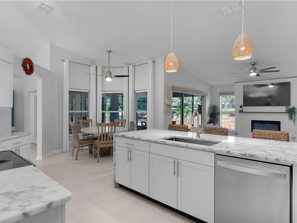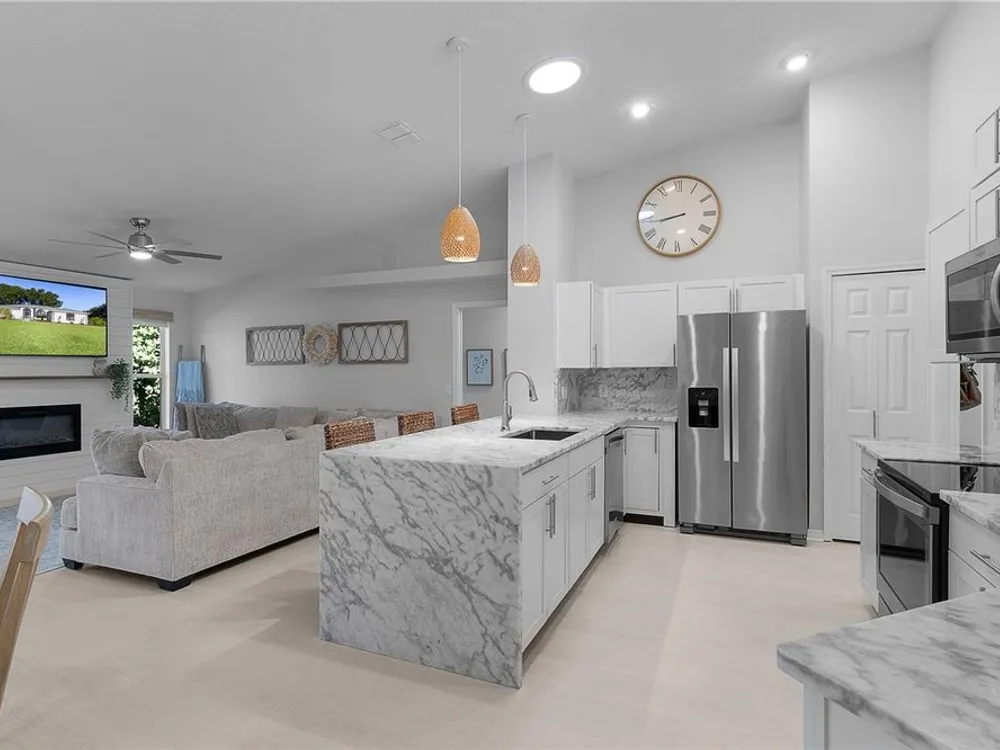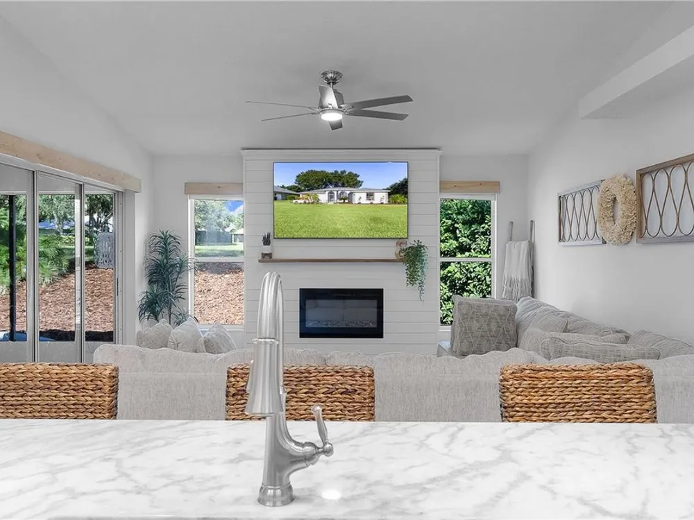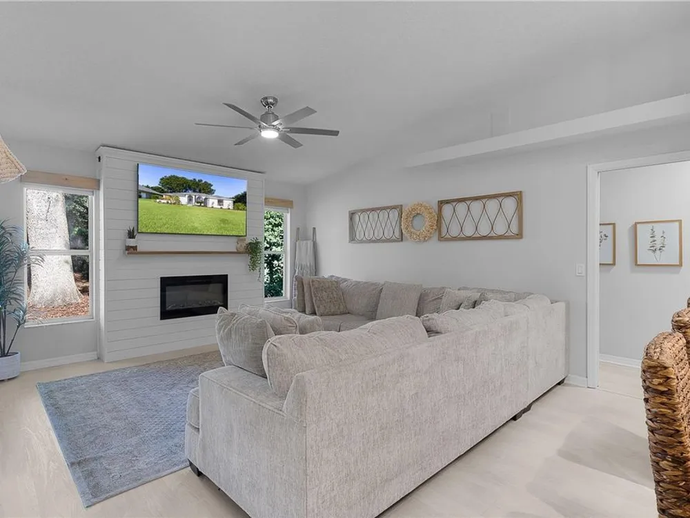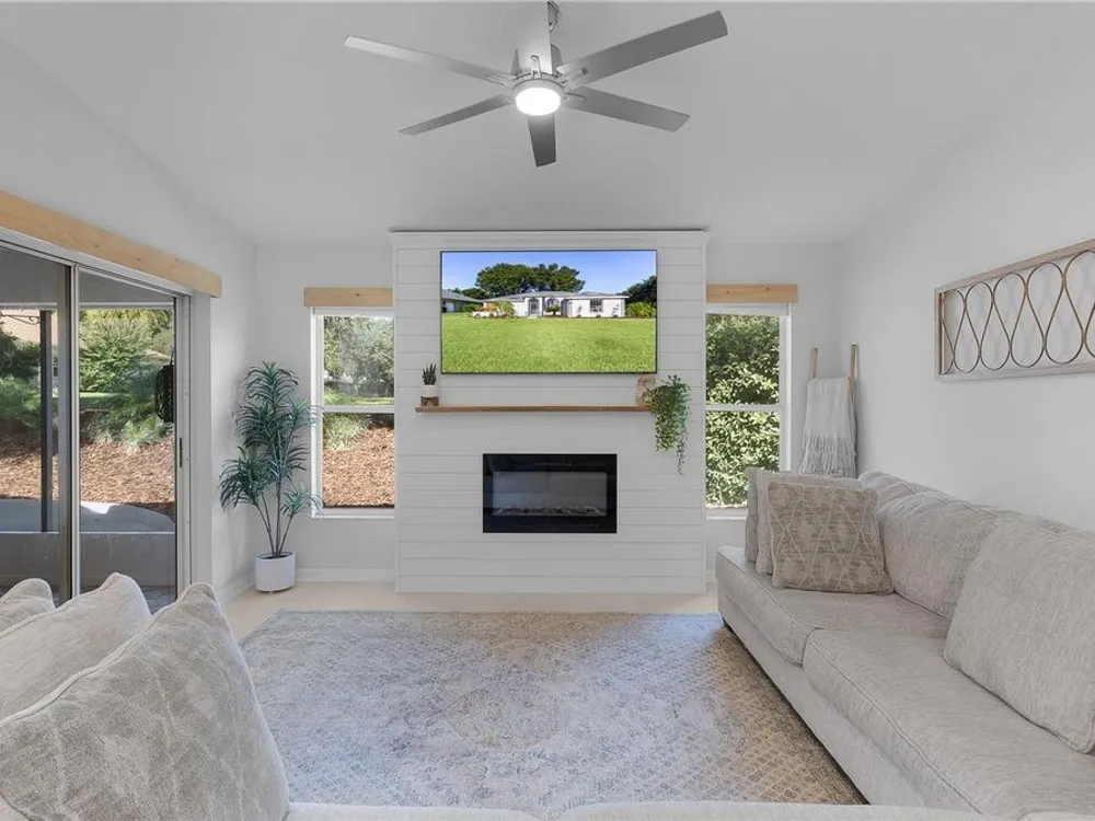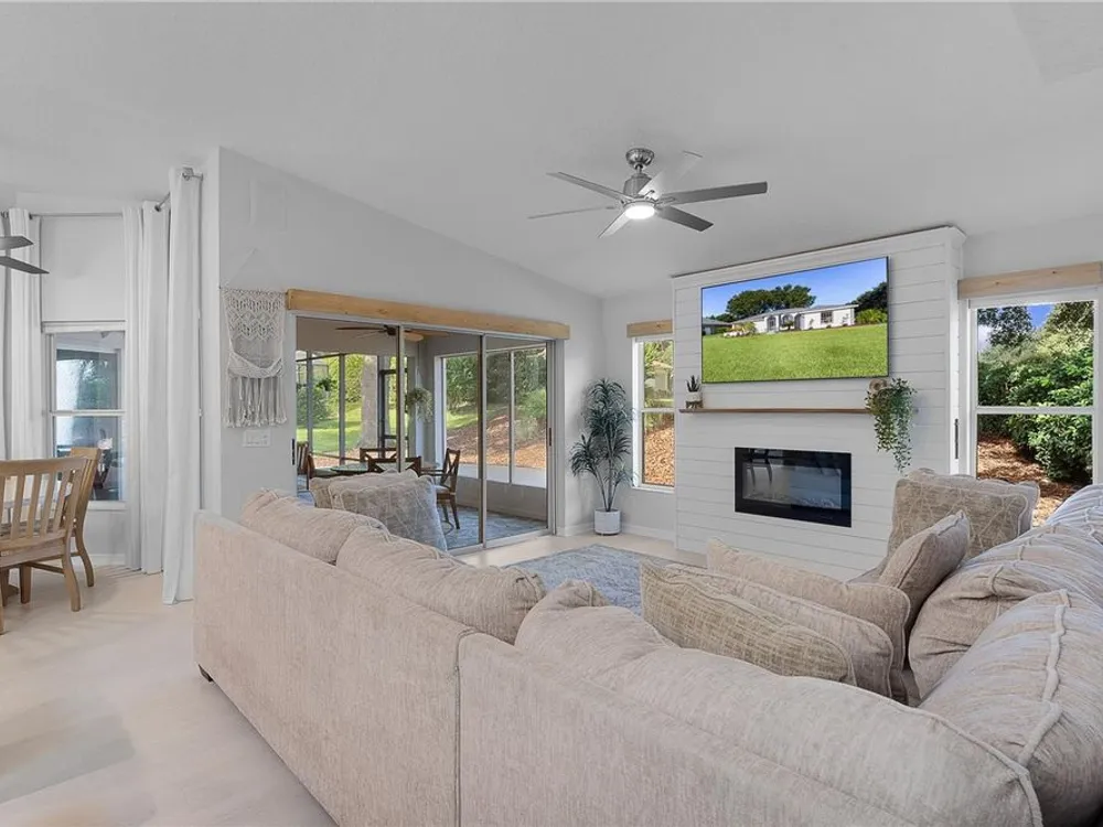 Welcome to The Grove! An HOA Community with fees of only $77/month! This home is move-in ready with too many improvements to list, including a WHOLE HOME water filtration system and a Stanley Steamer Restore UV light system to keep the air ducts clean and healthy from the Florida humidity! There is also a transferable home warranty, which includes the A/C & hot water system! This home has the light, bright look you’ve been looking for with light-colored granite and quartz counters, open floor plan and one continuous flooring throughout the home. The spectacular feature wall with shiplap and an electric fireplace is a great area to get cozy and feel the ambiance created! A spacious Primary bedroom is located on the opposite side of the home from bedrooms 2 & 3 for the utmost privacy. Other aspects of this home to consider are the oversized screen lanai, a side garage (new garage door and system!) with more driveway space that is so convenient! Residents may choose to become social members at the clubhouse for an additional fee. Please call the clubhouse for information on how you can enjoy features such as pickleball, tennis, indoor racquetball, sauna and weight room. The breathtaking views overlooking Lake Griffin from the gorgeous pool might alone just be with the membership! If you would rather be on the lake than observing the view, there is also an opportunity to use the marina! The clubhouse restaurant is just perfect for your needs after golfing, swimming or boating. Roof is 2020. NO BOND, FURNITURE AVAILABLE SEPARATELY!