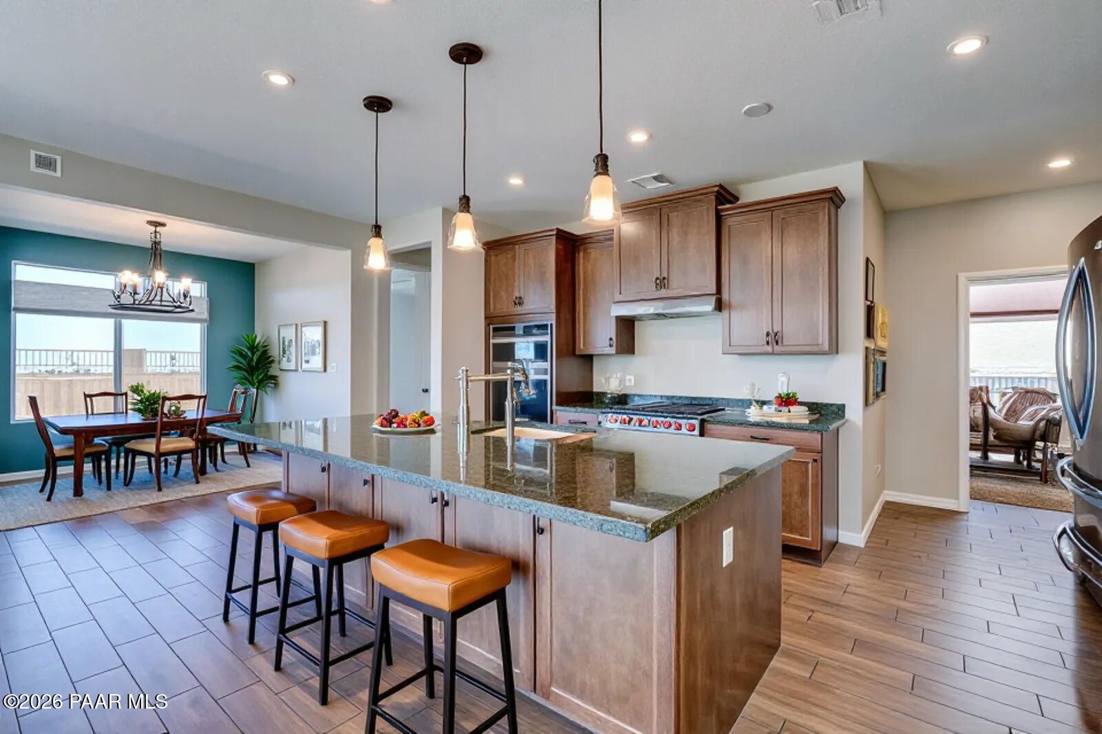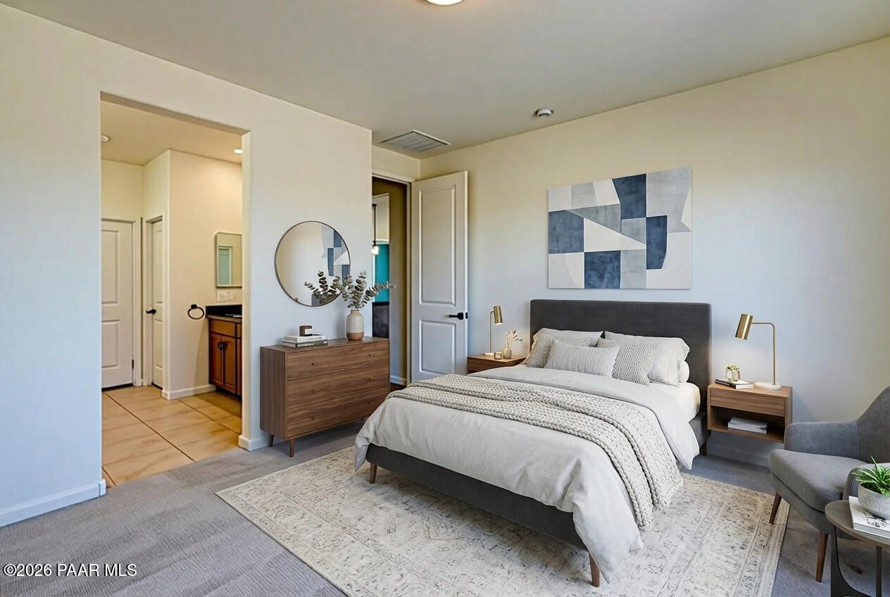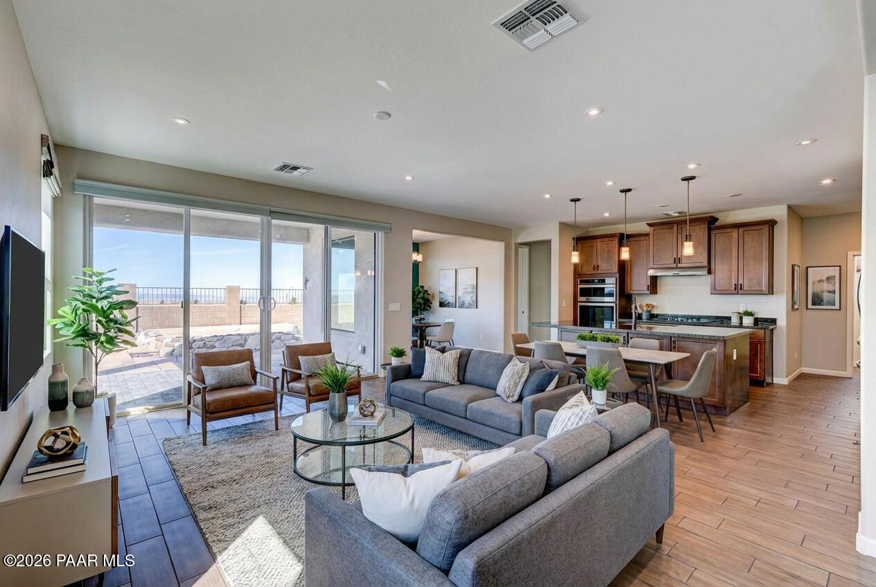 First occupant of this beautifully appointed home in the newer Granite Dells Estates community. Thoughtfully designed with blinds, soft-close cabinetry, and expansive stacking slider doors that seamlessly connect indoor and outdoor living. The spacious laundry room is plumbed for a utility sink, and the garage features durable epoxy flooring. Enjoy the benefits of owned solar panels and a private backyard with a view fence and no rear neighbors, offering breathtaking views of Thumb Butte, Granite Mountain, and the San Francisco Peaks. A walking trail is located just behind the home, adding to the peaceful, outdoor-oriented lifestyle this community is known for!