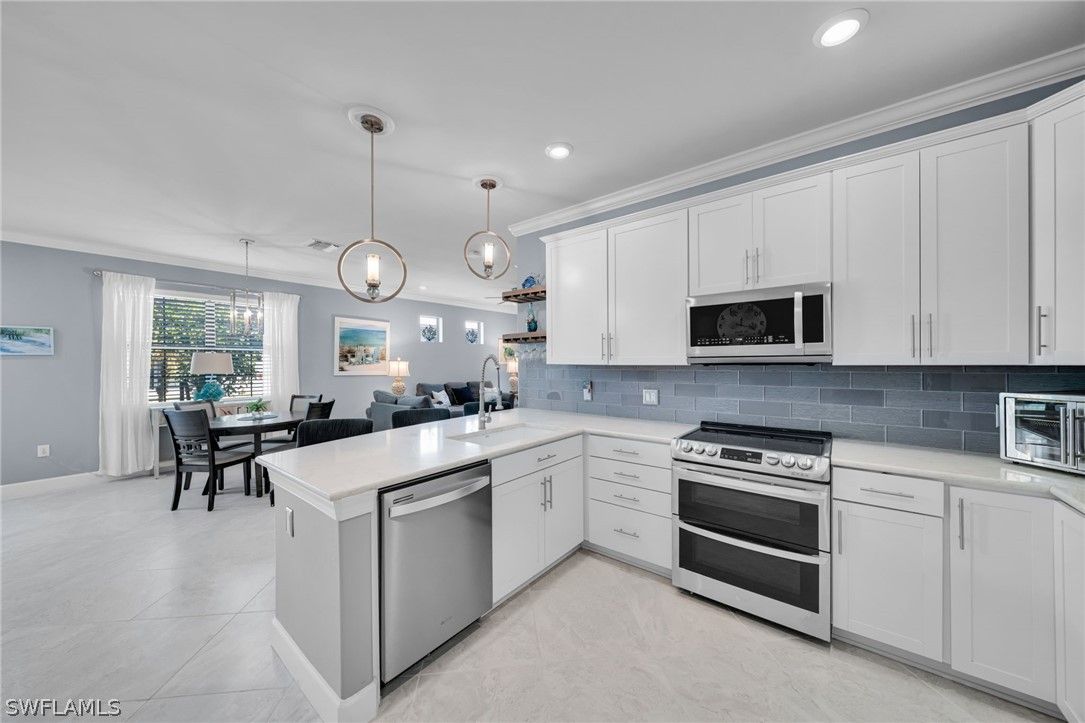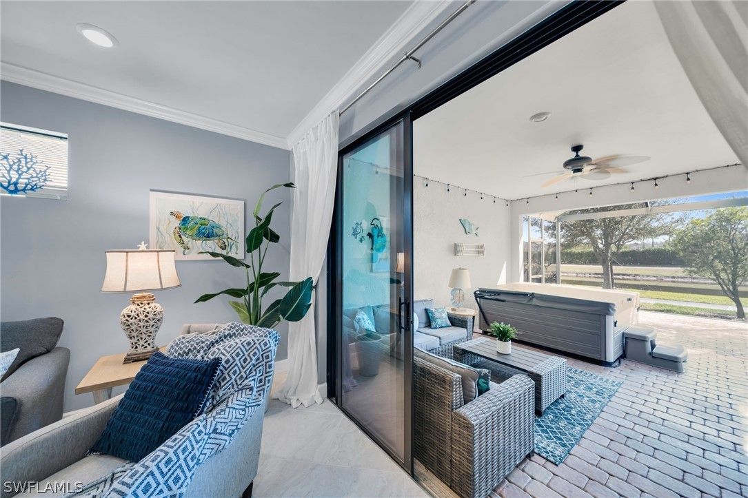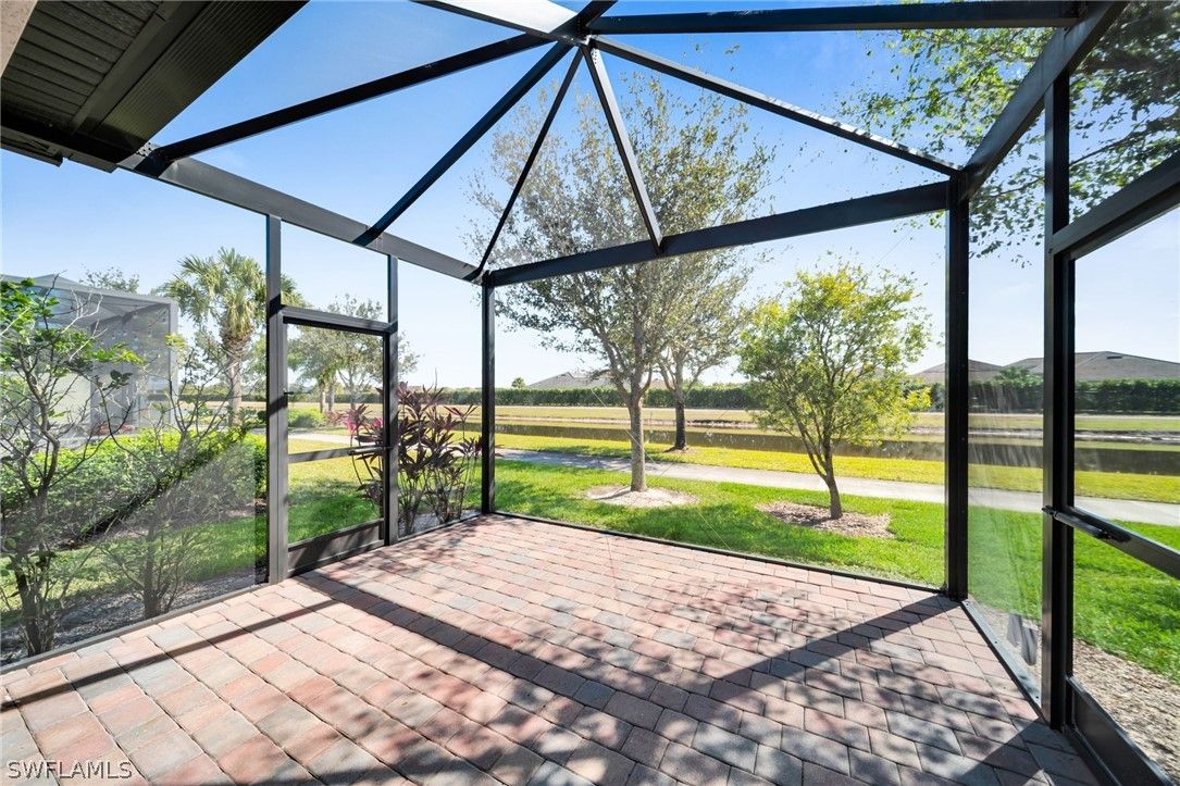 Welcome to this beautifully upgraded Serenity Model villa located in the sought-after Bellera / Del Webb neighborhood of Ave Maria. Built in 2018 and tucked away on a quiet cul-de-sac, this 2-bedroom + den, 2-bath home offers peaceful lake views and a serene Florida lifestyle. The open-concept living space is filled with natural light and enhanced by diagonal tile flooring, crown molding, and premier wiring for modern accessibility. The well-appointed kitchen features 42” white cabinetry, granite countertops, a stylish backsplash, stainless steel appliances including a double-oven range, and a multi-door refrigerator—perfect for everyday living and entertaining. Step outside to the extended screened lanai with pavers and relax while enjoying tranquil water views. The private spa is included, creating the perfect space to unwind. Additional upgrades include custom window treatments, upgraded carpet in the bedrooms, tray ceiling in the primary suite, and a spacious walk-in closet with added storage. The primary bath offers dual sinks for added comfort. The versatile den features elegant double doors, making it ideal for a home office or guest space. Other thoughtful touches include upgraded lighting and ceiling fans throughout, a laundry room with sink and cabinetry, retractable garage screen, and keypad garage entry. Residents of Del Webb enjoy an active 55+ lifestyle with two clubhouses and optional golf membership. Community amenities include pickleball, bocce, tennis, resort-style and lap pools, and more. Beyond the community, Ave Maria offers a charming small-town atmosphere with dining, events, and beautiful surroundings. This home blends comfort, style, and resort living—ready to welcome you home.