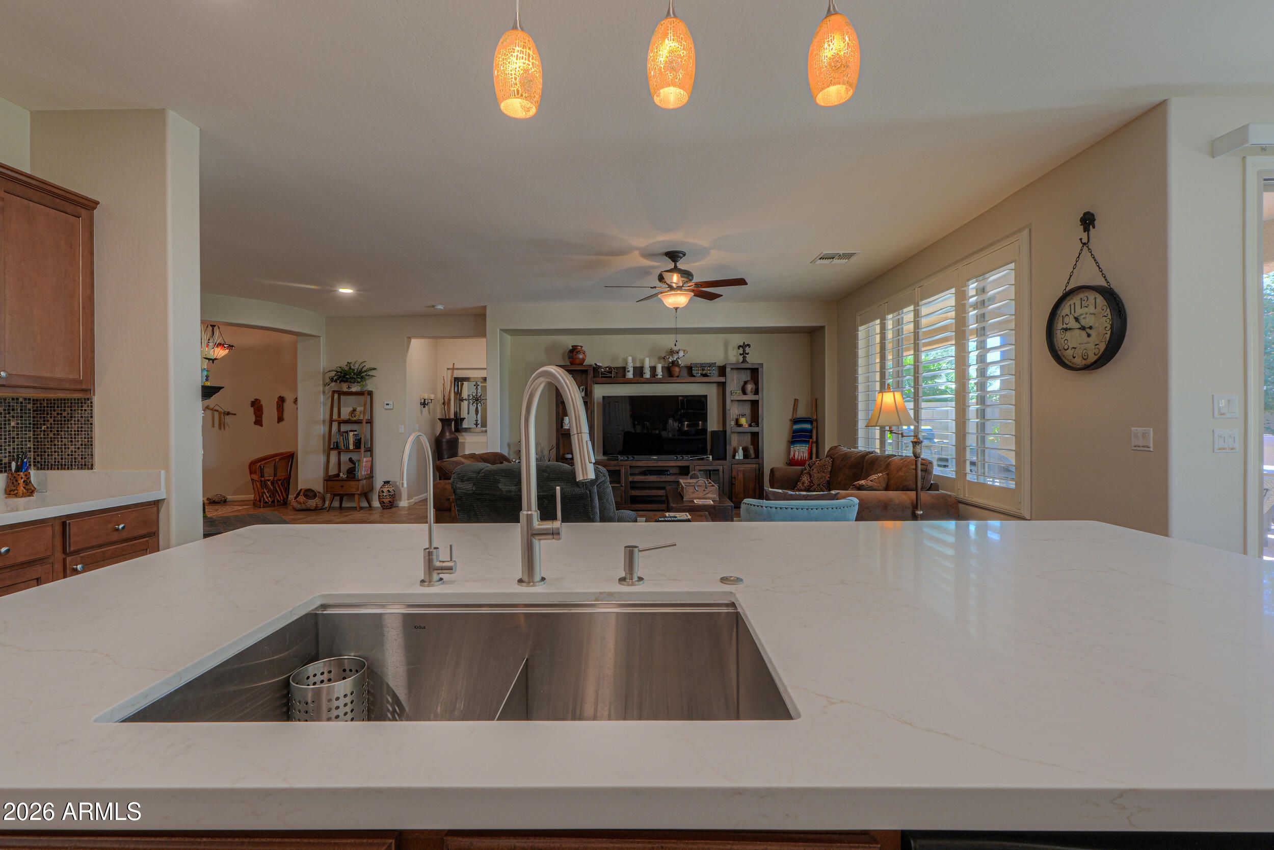 FULLY FURNISHED — including the GOLF CART! This stunning 1,890 sq ft home offers 2 bedrooms, 2 baths, plus a den, & is beautiful from the front paver sitting area to the serene backyard oasis. The newly updated kitchen features quartz countertops, a spacious 103'' x 48'' single-level island, SS appliances, maple cabinets w/hardware, stylish backsplash, new sink, gas range, roll-out shelves, & under-cabinet & pendant lighting. Bay windows in both Primary suite & dining area. AC REPLACED in 2021, 4'' shutters throughout, interior painted 2025. Garage includes a 4-ft extension, sink, cabinets, & workbench. Step outside to a covered paver patio perfect for entertaining, surrounded by lush landscaping, Navel orange, Meyer lemon, & lime trees, a tranquil fountain, & new PVC irrigation. AC/furnace replaced 2021,Gas line to stove 2015,New landscaping pvc 2025,New kitchen counters, 103" x 48" (w/15" overhang for seating) sink, recessed lighting march 2025, Garbage disposal 2025,Pavers in front seating area 2022, washer and dryer 2023, refrigerator 2025,microwave 2020,interior paint 2025,landscaping lighting and fan 2022. Dimmer switch on all ceiling lighting and bathroom lights.
