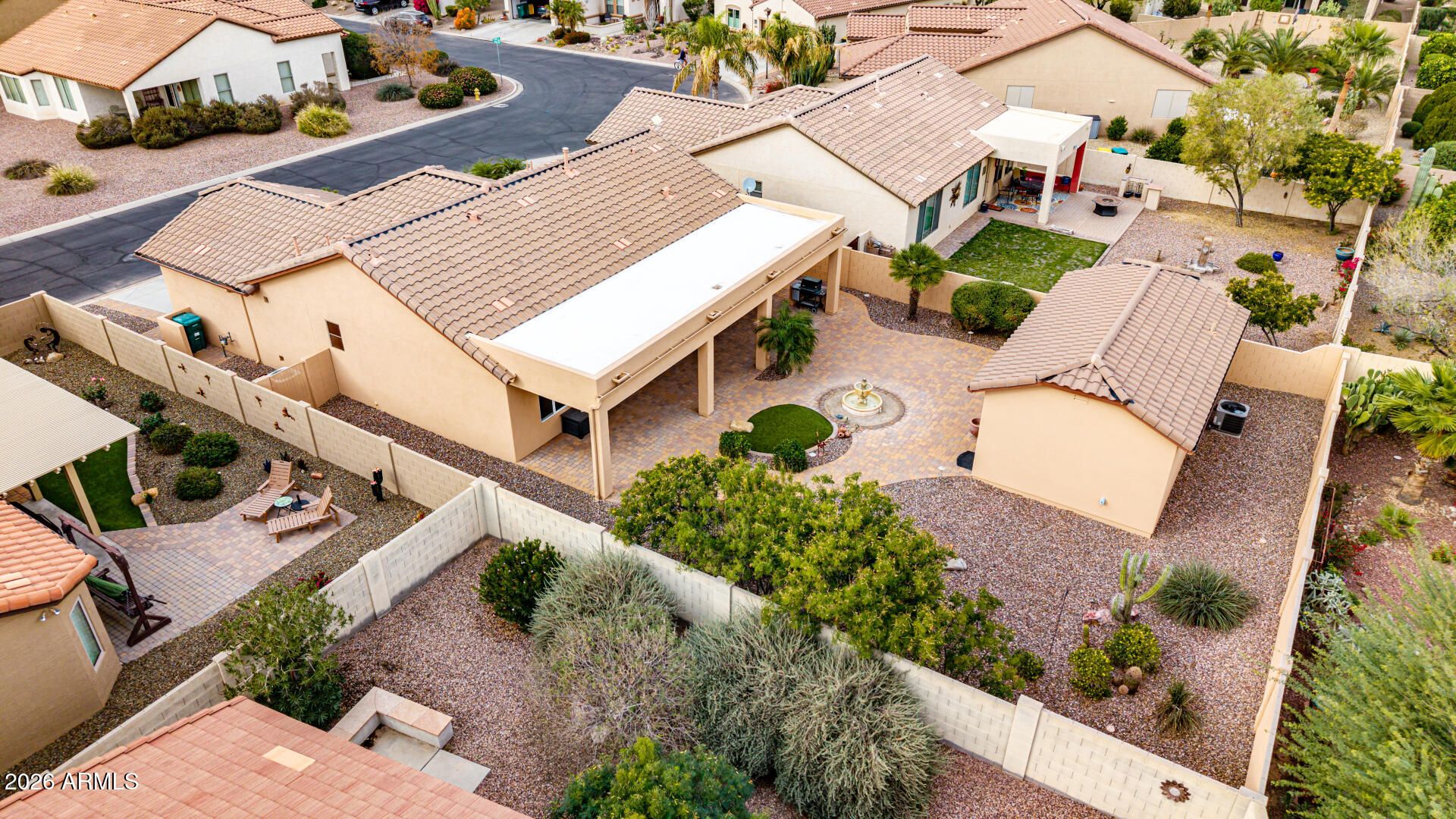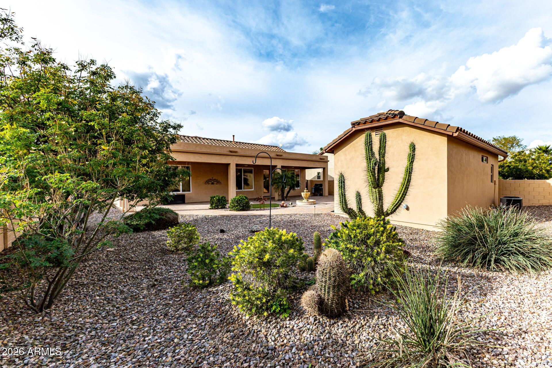 One of a kind in Robson Ranch—featuring a rare detached casita in the backyard! From the moment you arrive, you'll appreciate the inviting brick paver front courtyard and freshly painted exterior. This home is pristine inside and out. The main home offers a 2-bdrm, 2-bath split floor plan with granite countertops, stainless appliances (2019),large pantry, entry closet, hall linen closet, and walk-in closets in both bedrooms. Primary suite includes a walk-in shower and dual vanities. The back of the home is filled with windows overlooking a beautifully designed backyard with a large covered patio, gas BBQ, water fountain, and desert landscaping with a touch of artificial turf. This space flows seamlessly to the stand-alone casita (built 2011)with all-tile flooring, walk-in shower, closet, large flex/storage area ideal for a future kitchenette, new AC (2023), and water heater (2020). So many thoughtful featuressee document tab for details. Main home sq ft 1355 casita 390
