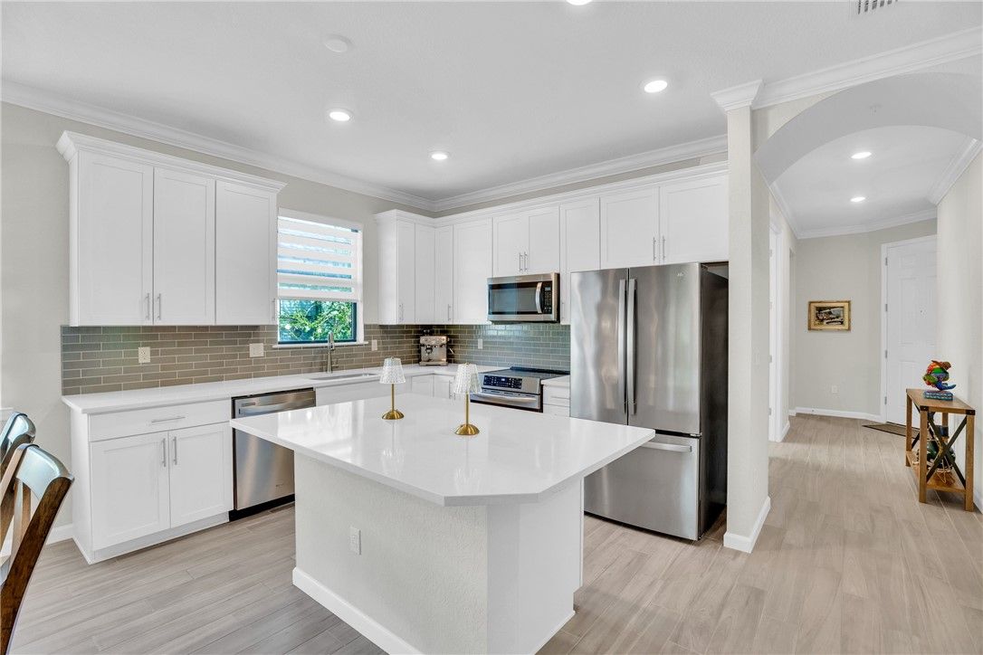 Like-new 2022 DiVosta-built Ellenwood model featuring mature landscaping and an expanded lanai with outdoor kitchen and retractable screen enclosure. Interior highlights open-concept floorplan, crown molding, induction range, motorized shades. Enjoy a charming garden view and a low-maintenance, modern lifestyle.