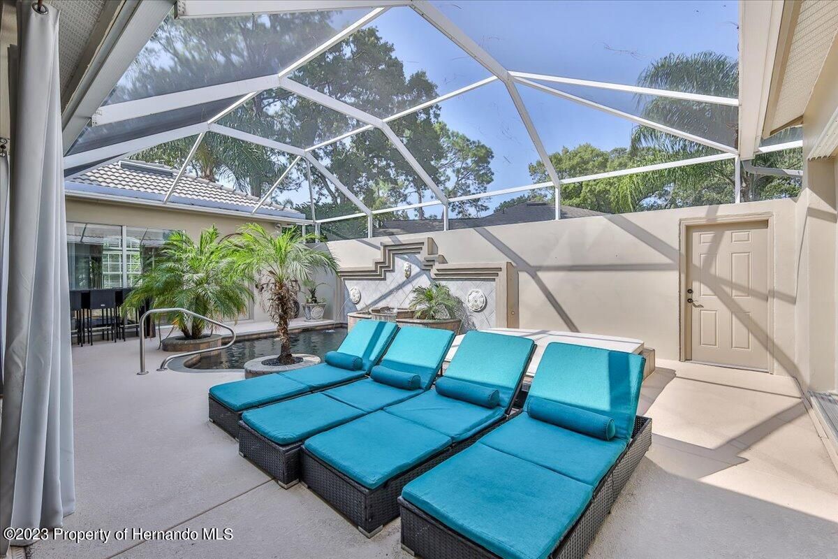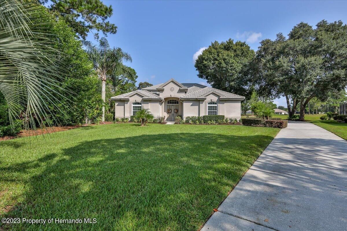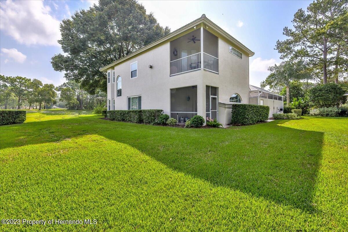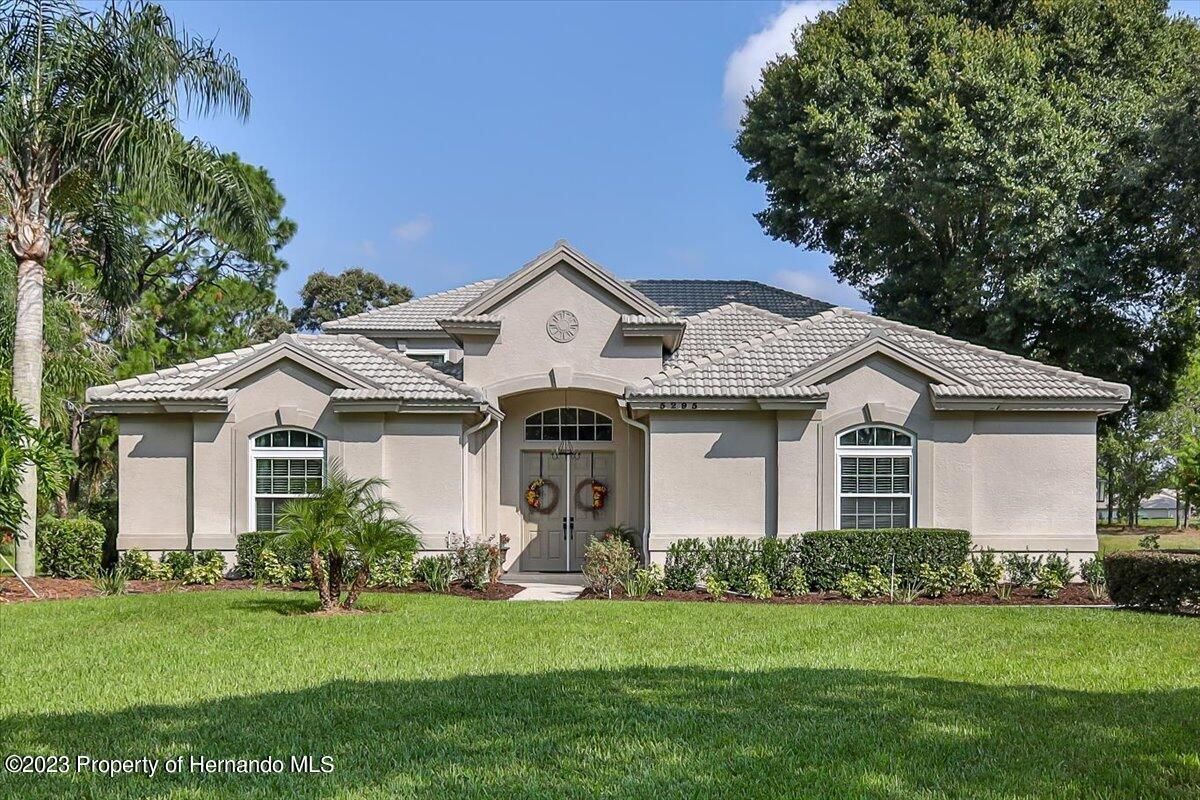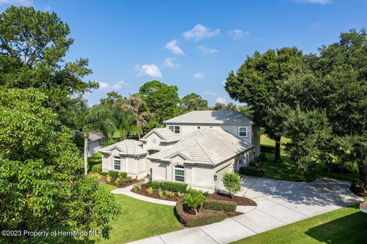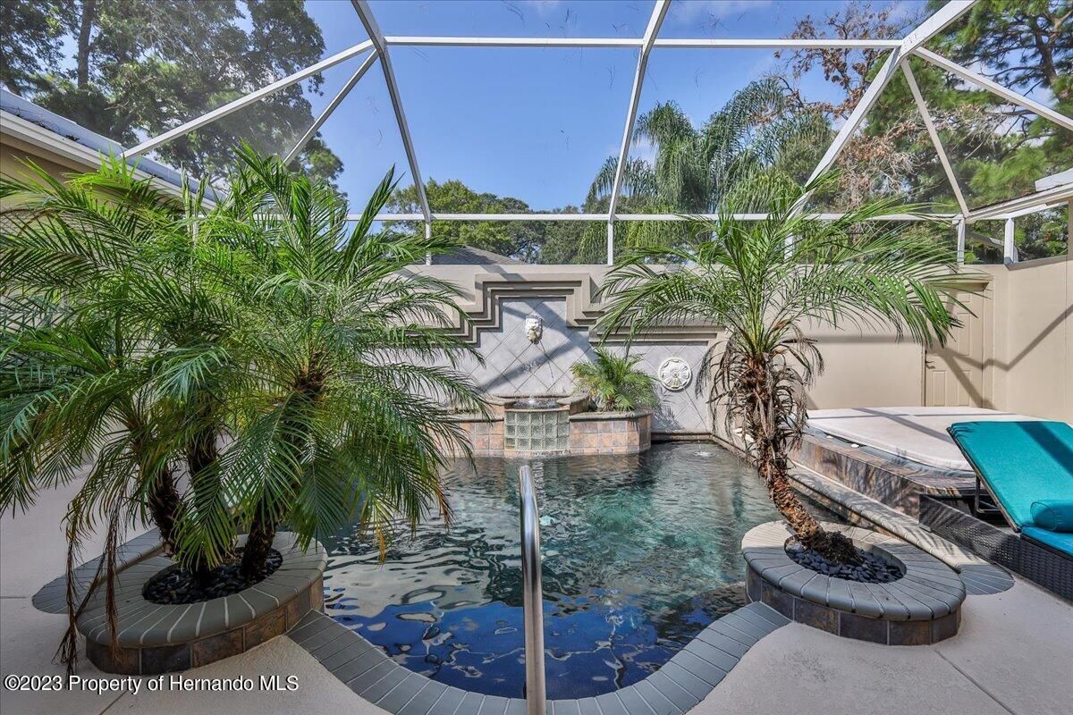 Paradise calls - will you be the one who answers? An exquisite experience from the tiled roof to the brand new dual pane windows, this spectacular 2-story home sits on the Silverthorn golf course. The secure gated neighborhood is a vivacious community with incredible amenities, including a clubhouse and The Legends restaurant, a community center, a jr-Olympic sized pool, fitness center, library, tennis courts, pickleball courts, and much more; plus, the HOA fees include cable and internet. Double front doors on this custom-built Rutenberg home reveal a dreamy courtyard featuring an in-ground pool with a fountain and an in-ground spa. Summer days call for lounging around the granite-topped tiki bar, sipping cool drinks from the mini fridge. Visitors can stay in the sizable cabana suite with beautiful laminate flooring, a walk-in closet, and a bathroom with a step-in shower. A functional floor plan in the main home offers flexibility for your living needs. The formal dining room has a built-in mirrored hutch and wet bar, so it could easily double as a formal sitting area or living room. The spacious family room is for game night, or cooler evenings curled up in front of the flickering glow of the gas fireplace, which is surrounded by a built-in entertainment center. You can slip out of another set of glass doors to the screened porch to take in the birdsong and the views of the backyard with your morning beverage. Overlooking the courtyard, you'll also find a guest bedroom with dual closets on the main floor, along with a full bathroom. Cooking for 2 or 20? Doesn't matter; the immaculate island kitchen is equipped with every modern convenience and elegant finish a cook could want, like granite counters, gray subway tile backsplash, a huge walk-in pantry, and gleaming stainless steel appliances. There's even a built-in double oven and a sleek flat cooktop, along with designer light fixtures. Tucked back by the large eating nook is the staircase that leads to sanctuary: the primary suite and study. The massive primary suite dominates most of the upstairs space, containing dual walk-in closets, a large sitting area, another cozy gas fireplace, and a private balcony with a sweeping view of the course out back. Experience spa-like luxury in the primary bath with its dual sink vanities, large soaking tub, and glass walk-in shower. And just off the stairs, an impressive room/study with built-in shelves and a desk awaits; it would make an excellent den, library, or even a home office. It also contains the entrance to a substantially-sized storage room, where you can safely stow your belongings in a temperature-controlled environment. The 2.5 car garage downstairs offers even more storage space in the form of a workbench and cabinets — now freshly painted along with the floor, walls, ceiling, and cabinets for a crisp, updated look. Both AC units have been recently replaced (2018 and 2022). Silverthorn is centrally located to plenty of shopping and dining options, and minutes from the Gulf of Mexico; access to Tampa via the Suncoast Parkway is quick and easy. Anderson Snow Park, with its amazing sports complex, and Veterans Memorial Park, with its popular walking trails, are both less than 6 miles away. Don't forget to check out the world-famous mermaids at Weeki Wachee Springs State Park, which also has a canoe/kayak launch and a waterpark in the summer months. Make your dream life a reality, and schedule your tour to see this beauty today!