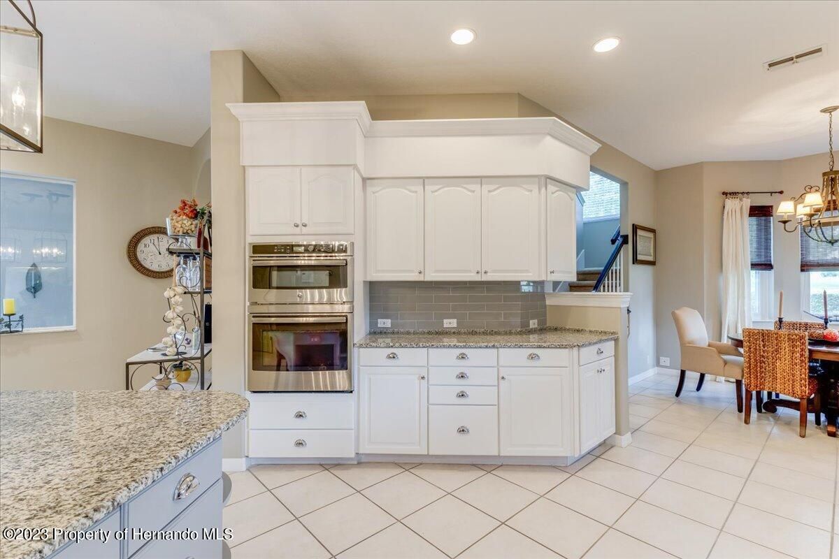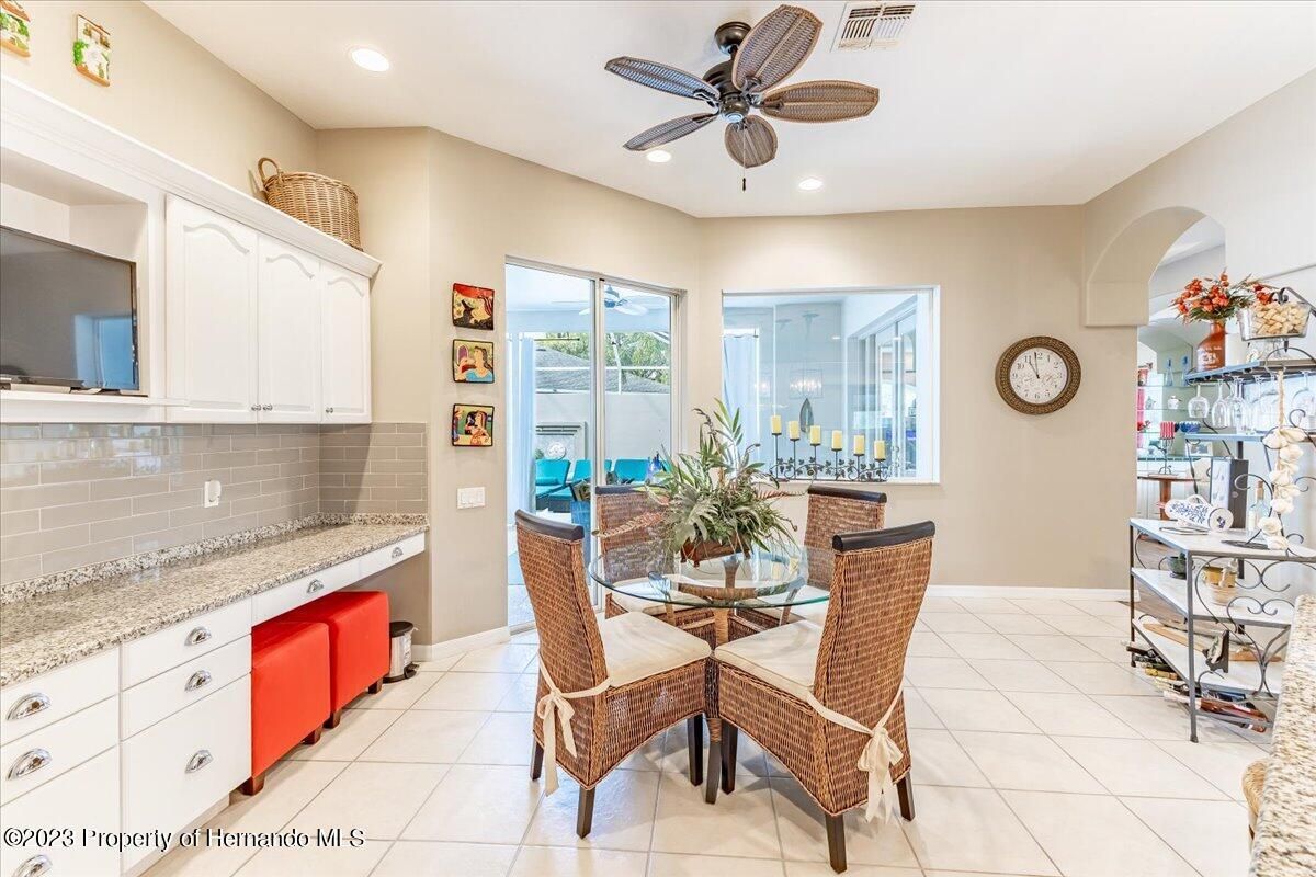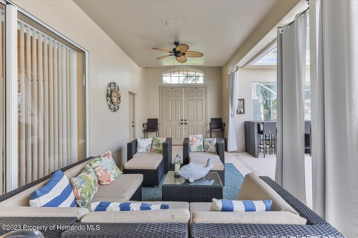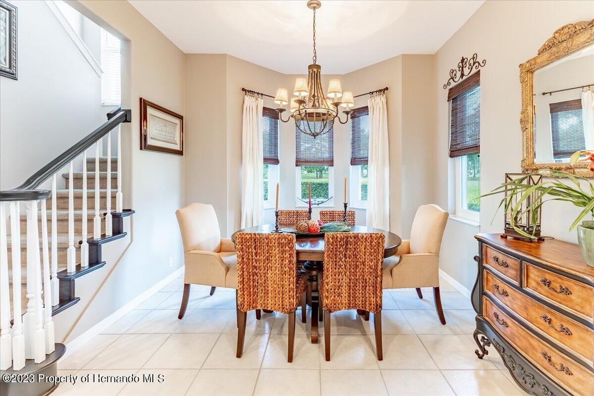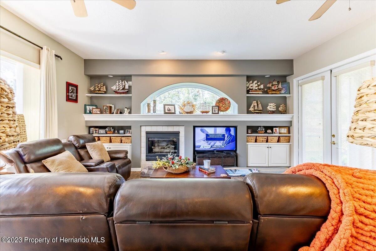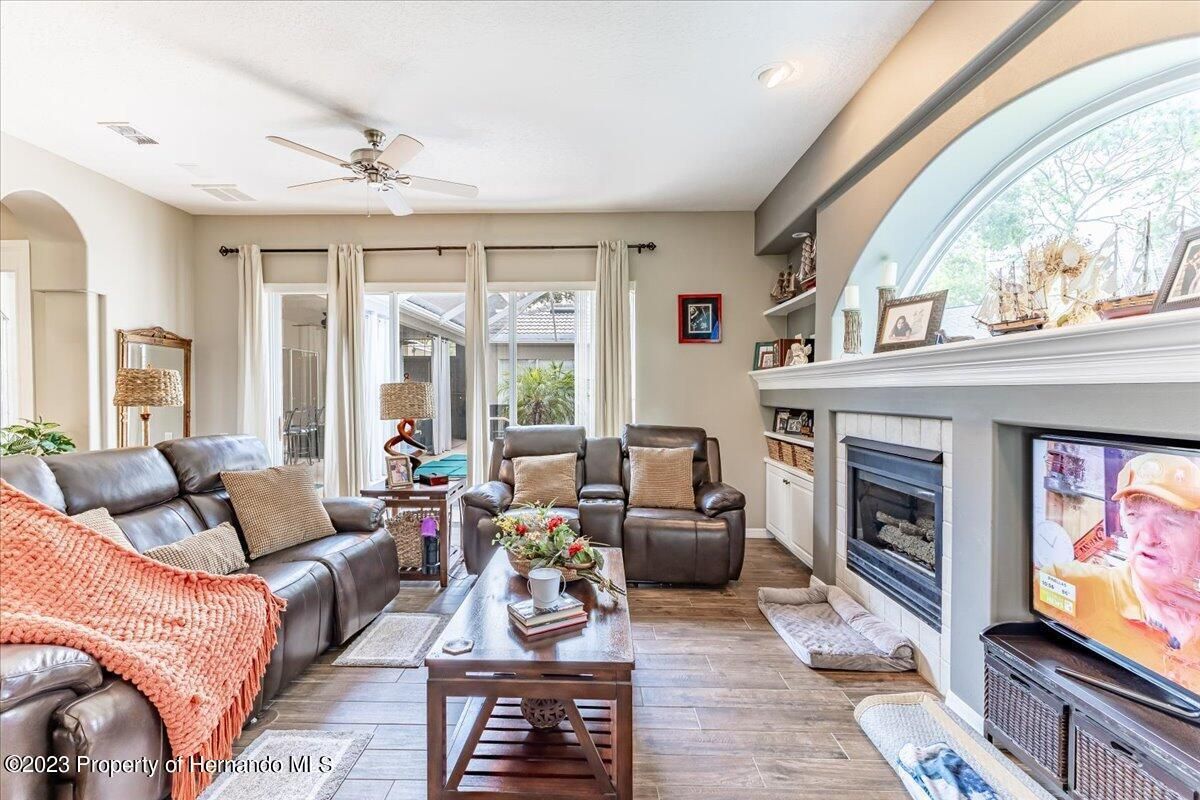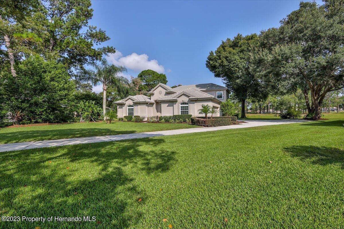 Paradise calls - will you be the one who answers? An exquisite experience from the tiled roof to the brand new dual pane windows, this spectacular 2-story home sits on the Silverthorn golf course. The secure gated neighborhood is a vivacious community with incredible amenities, including a clubhouse and The Legends restaurant, a community center, a jr-Olympic sized pool, fitness center, library, tennis courts, pickleball courts, and much more; plus, the HOA fees include cable and internet. Double front doors on this custom-built Rutenberg home reveal a dreamy courtyard featuring an in-ground pool with a fountain and an in-ground spa. Summer days call for lounging around the granite-topped tiki bar, sipping cool drinks from the mini fridge. Visitors can stay in the sizable cabana suite with beautiful laminate flooring, a walk-in closet, and a bathroom with a step-in shower. A functional floor plan in the main home offers flexibility for your living needs. The formal dining room has a built-in mirrored hutch and wet bar, so it could easily double as a formal sitting area or living room. The spacious family room is for game night, or cooler evenings curled up in front of the flickering glow of the gas fireplace, which is surrounded by a built-in entertainment center. You can slip out of another set of glass doors to the screened porch to take in the birdsong and the views of the backyard with your morning beverage. Overlooking the courtyard, you'll also find a guest bedroom with dual closets on the main floor, along with a full bathroom. Cooking for 2 or 20? Doesn't matter; the immaculate island kitchen is equipped with every modern convenience and elegant finish a cook could want, like granite counters, gray subway tile backsplash, a huge walk-in pantry, and gleaming stainless steel appliances. There's even a built-in double oven and a sleek flat cooktop, along with designer light fixtures. Tucked back by the large eating nook is the staircase that leads to sanctuary: the primary suite and study. The massive primary suite dominates most of the upstairs space, containing dual walk-in closets, a large sitting area, another cozy gas fireplace, and a private balcony with a sweeping view of the course out back. Experience spa-like luxury in the primary bath with its dual sink vanities, large soaking tub, and glass walk-in shower. And just off the stairs, an impressive room/study with built-in shelves and a desk awaits; it would make an excellent den, library, or even a home office. It also contains the entrance to a substantially-sized storage room, where you can safely stow your belongings in a temperature-controlled environment. The 2.5 car garage downstairs offers even more storage space in the form of a workbench and cabinets — now freshly painted along with the floor, walls, ceiling, and cabinets for a crisp, updated look. Both AC units have been recently replaced (2018 and 2022). Silverthorn is centrally located to plenty of shopping and dining options, and minutes from the Gulf of Mexico; access to Tampa via the Suncoast Parkway is quick and easy. Anderson Snow Park, with its amazing sports complex, and Veterans Memorial Park, with its popular walking trails, are both less than 6 miles away. Don't forget to check out the world-famous mermaids at Weeki Wachee Springs State Park, which also has a canoe/kayak launch and a waterpark in the summer months. Make your dream life a reality, and schedule your tour to see this beauty today!
