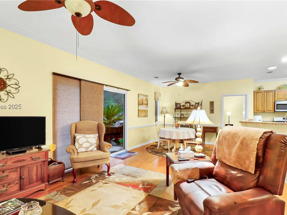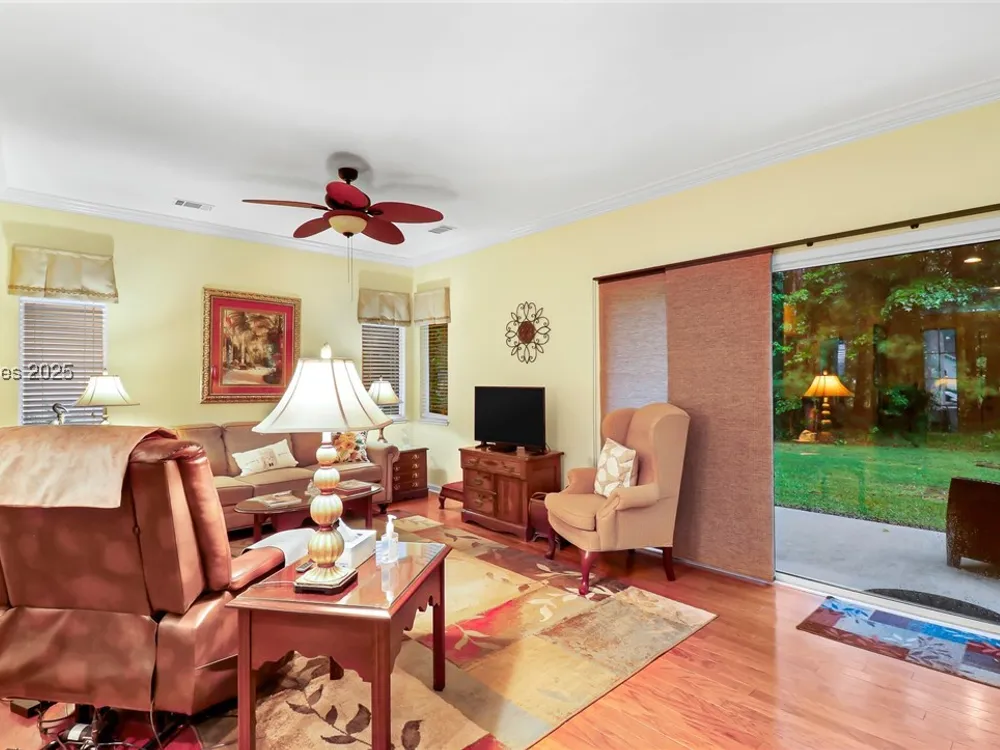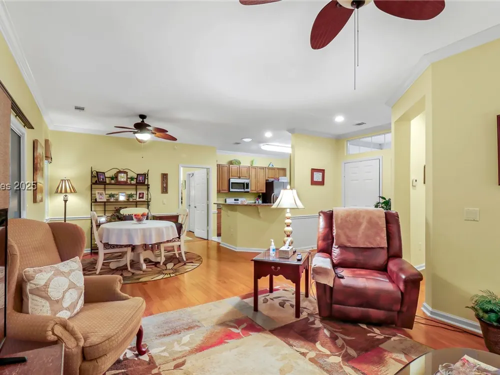 This well-appointed 2 BR/ 2 BA Jamestown/Savannah model home has a lot to offer! Beautiful wood flooring in the living, dining area and primary bedroom. The spacious updated kitchen features granite counters, stainless steel appliances and nice cabinetry. Smooth ceilings and crown molding throughout add to the charming feel. Primary bedroom has a walk-in closet and both bathrooms have been updated. Two car garage and the tree lined street make this home a 'must see'! Enjoy the many World Class amenities that Sun City is known for.