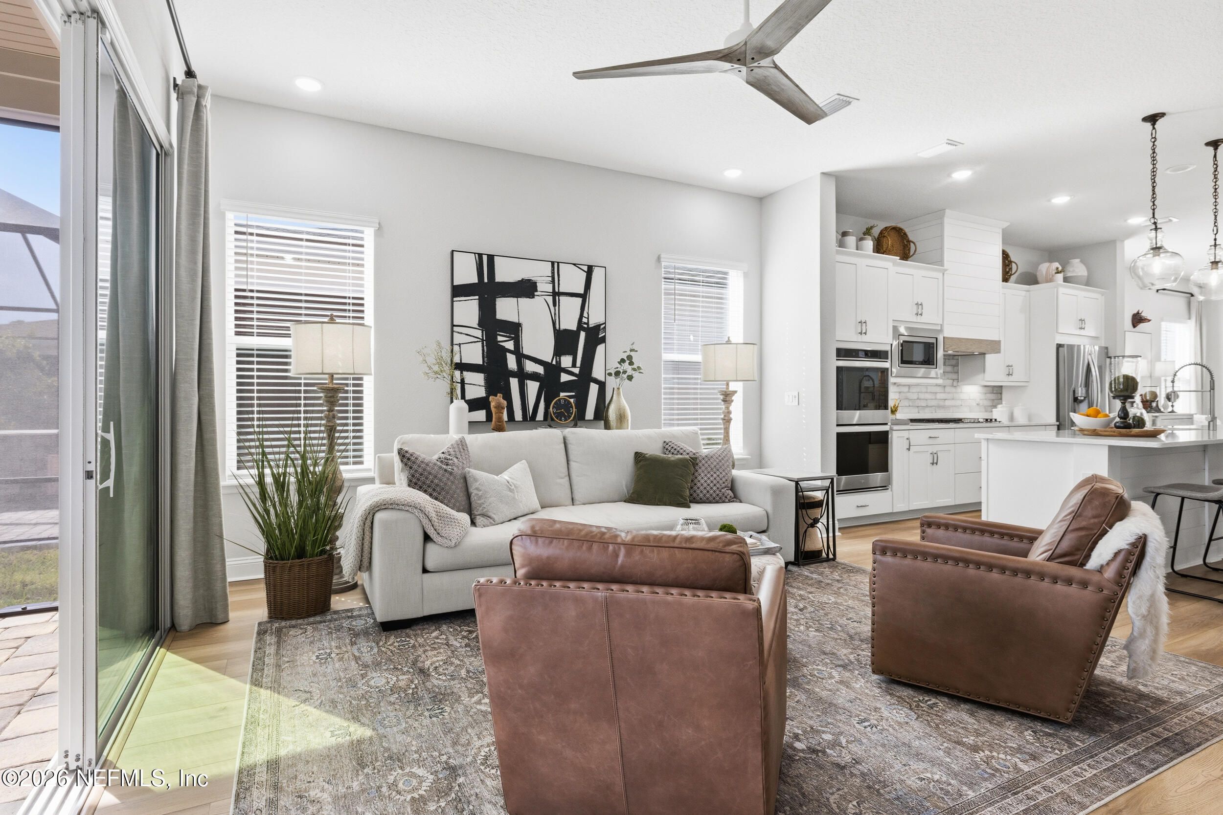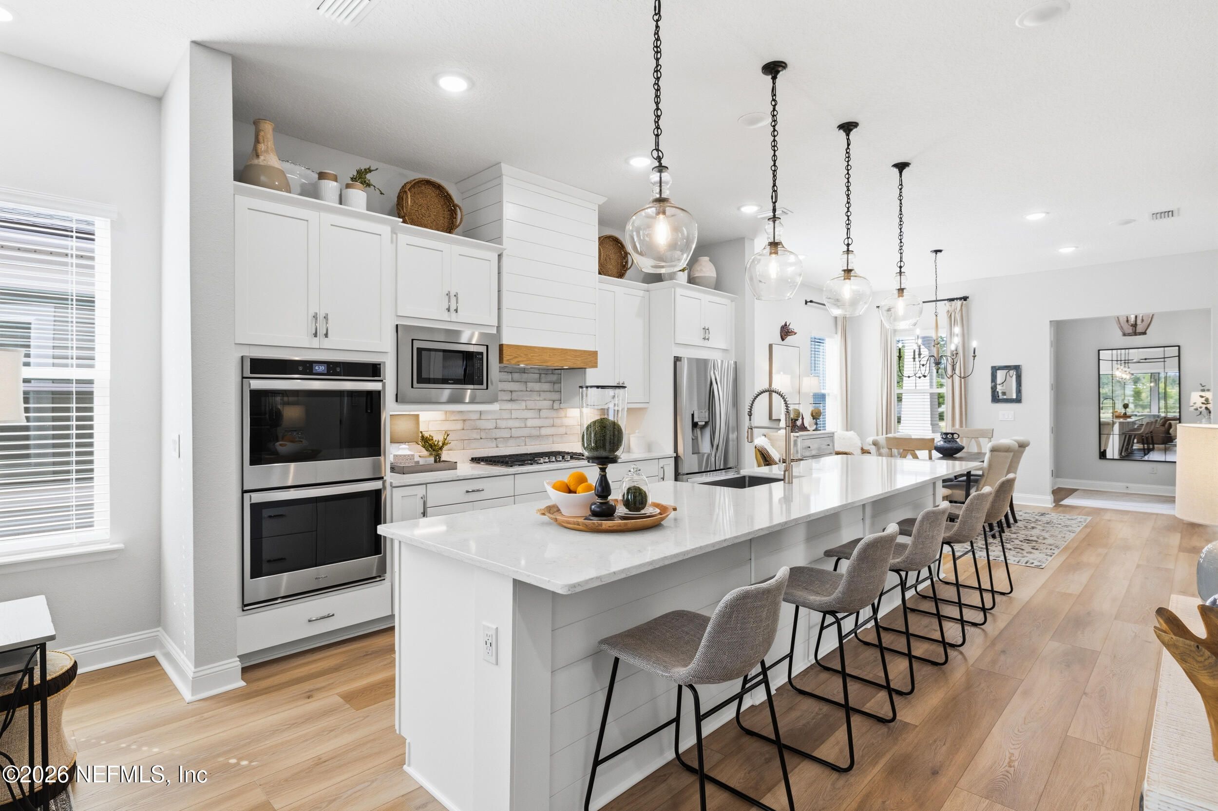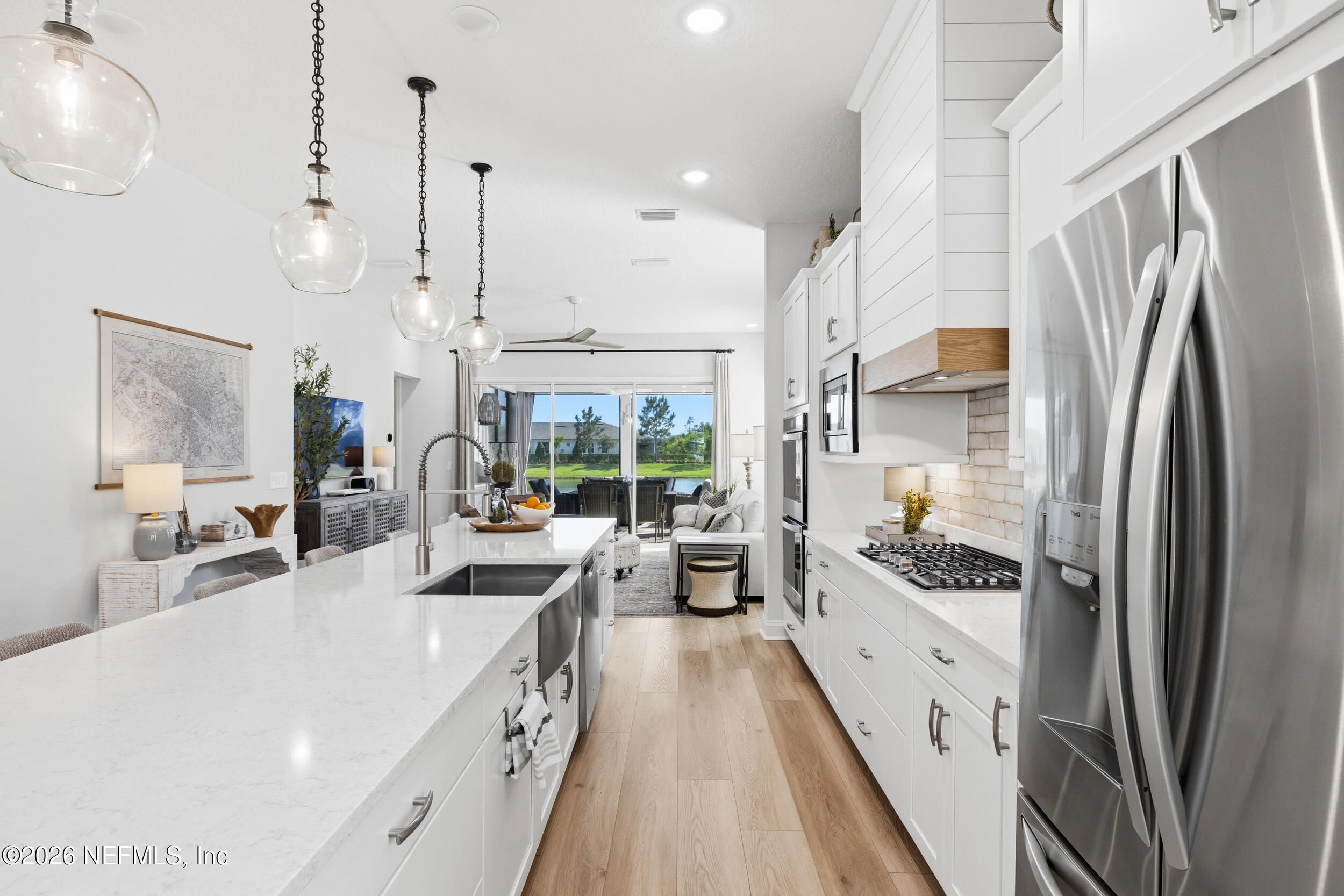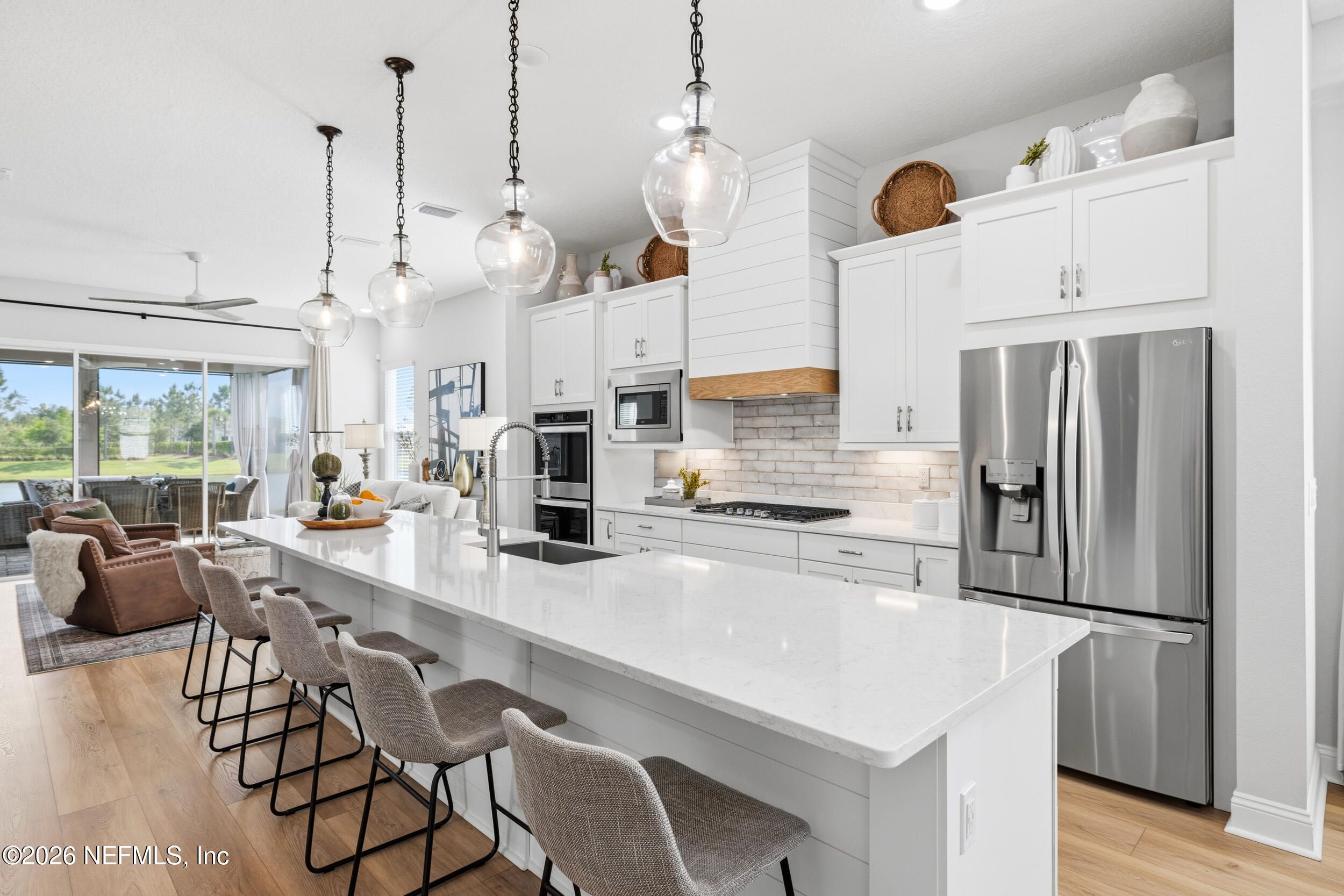 Set within the gated 55+ community of WaterSong at RiverTown, 53 Kellet Way is a magazine-worthy Lane Model that blends coastal craftsmanship with effortless indoor-outdoor living. Built in 2021 and offering 1,811 sq ft with 2 bedrooms plus an office/den and 2 baths, the home showcases warm luxury vinyl plank flooring, custom shiplap accents, designer lighting, and a thoughtfully designed open layout that captures breathtaking wide pond views from the main living spaces and lanai. The kitchen was designed with entertaining in mind, centered around a long dining island topped with gray-veined white quartz, illuminated by seeded glass globe pendants. White cabinetry, antiqued textured subway tile backsplash, stainless appliances including a gas cooktop and double wall ovens, and a farmhouse sink create a space that is both beautiful and functional. Just off the kitchen, a wet bar with beverage refrigerator and sink makes hosting effortless while the dining area and stacking sliding glass doors extend the living space seamlessly to the screened lanai. The primary suite is a serene retreat, featuring a tray ceiling, clerestory windows that fill the room with natural light, and a barn-door entry to the spa-inspired bath. Inside, you'll find a zero-entry spa shower, quartz counters, rustic framed mirrors, a shiplap vanity accent wall, and a large walk-in closet complete with luggage racks and direct access to the laundry room for everyday convenience. Outdoor living truly shines here. The screen-enclosed lanai captures tranquil pond views and includes dual ceiling fans, privacy curtains, and paver flooring, creating the perfect setting for morning coffee or evening gatherings. The summer kitchen with grill, sink, refrigerator, and woven pendant lighting elevates outdoor entertaining and landscaped screening enhances privacy and relaxation. Additional features include a welcoming foyer with shiplap accent wall, a drop zone with bench and cubbies, an office/den ideal for working or hobbies, a 2-car garage plus dedicated golf cart bay, smart keyless entry, and a tankless water heater. Residents of WaterSong at RiverTown enjoy an exclusive active-adult lifestyle with resort-style amenities including two amenity centers, a pool, lap pool, outdoor spa, pickleball and bocce courts, fitness centers, biergarten, dog park, event lawn, and a full-time lifestyle director hosting community activities while just a short drive from Jacksonville, beaches, shopping, dining, and top medical facilities.