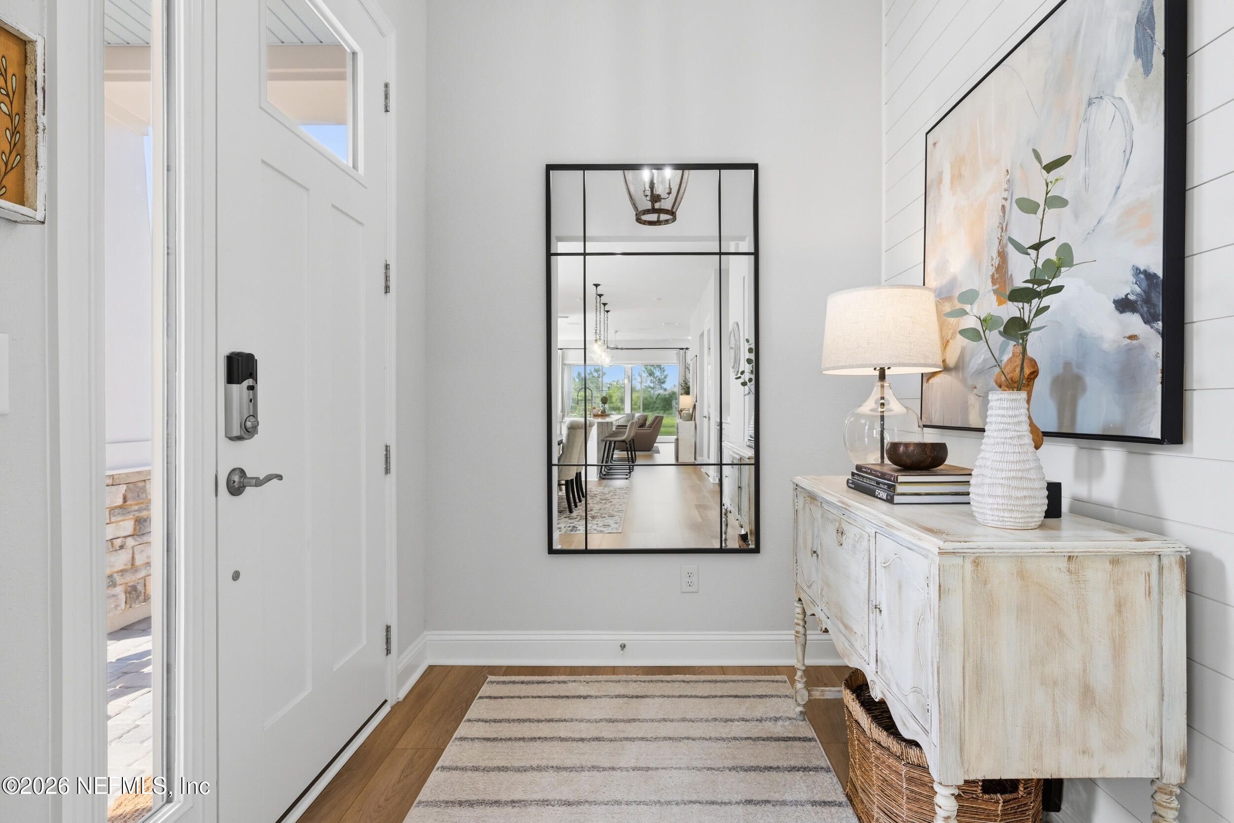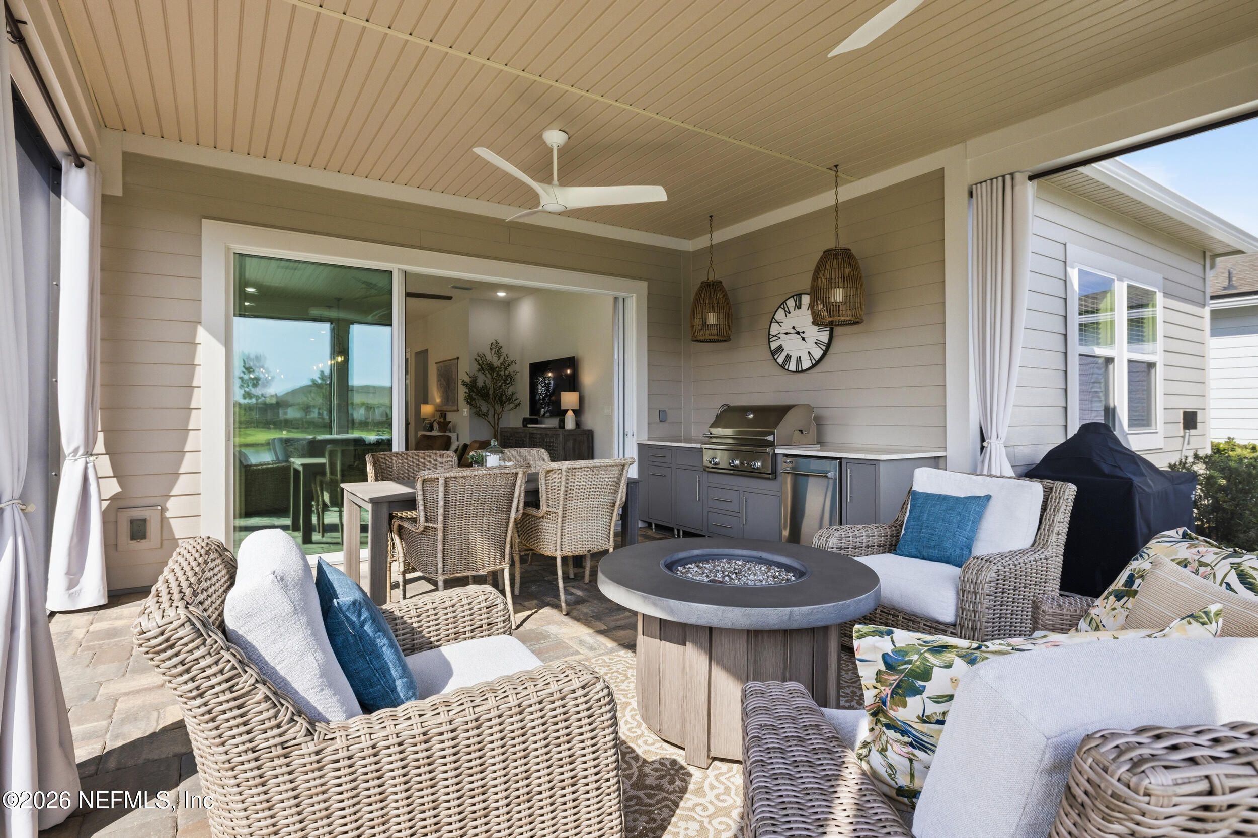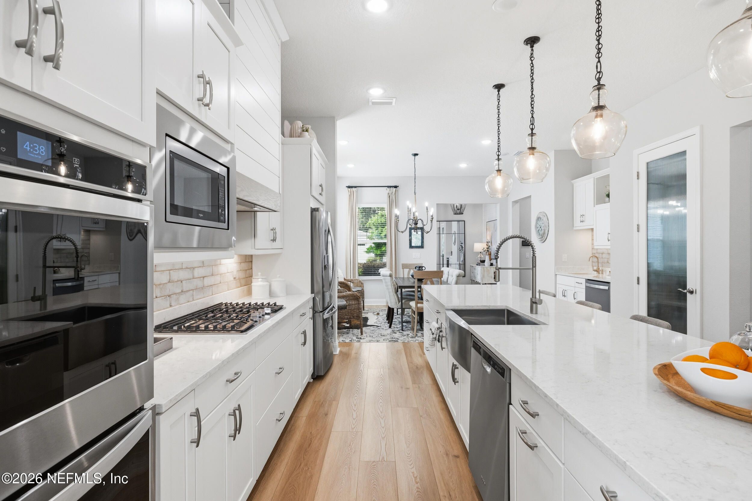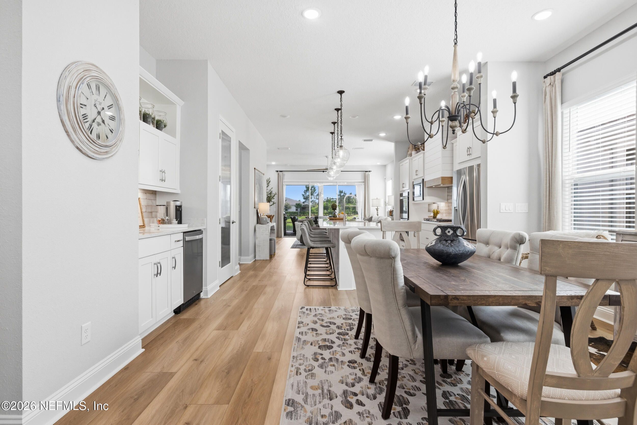 Set within the gated 55+ community of WaterSong at RiverTown, 53 Kellet Way is a magazine-worthy Lane Model that blends coastal craftsmanship with effortless indoor-outdoor living. Built in 2021 and offering 1,811 sq ft with 2 bedrooms plus an office/den and 2 baths, the home showcases warm luxury vinyl plank flooring, custom shiplap accents, designer lighting, and a thoughtfully designed open layout that captures breathtaking wide pond views from the main living spaces and lanai. The kitchen was designed with entertaining in mind, centered around a long dining island topped with gray-veined white quartz, illuminated by seeded glass globe pendants. White cabinetry, antiqued textured subway tile backsplash, stainless appliances including a gas cooktop and double wall ovens, and a farmhouse sink create a space that is both beautiful and functional. Just off the kitchen, a wet bar with beverage refrigerator and sink makes hosting effortless while the dining area and stacking sliding glass doors extend the living space seamlessly to the screened lanai. The primary suite is a serene retreat, featuring a tray ceiling, clerestory windows that fill the room with natural light, and a barn-door entry to the spa-inspired bath. Inside, you'll find a zero-entry spa shower, quartz counters, rustic framed mirrors, a shiplap vanity accent wall, and a large walk-in closet complete with luggage racks and direct access to the laundry room for everyday convenience. Outdoor living truly shines here. The screen-enclosed lanai captures tranquil pond views and includes dual ceiling fans, privacy curtains, and paver flooring, creating the perfect setting for morning coffee or evening gatherings. The summer kitchen with grill, sink, refrigerator, and woven pendant lighting elevates outdoor entertaining and landscaped screening enhances privacy and relaxation. Additional features include a welcoming foyer with shiplap accent wall, a drop zone with bench and cubbies, an office/den ideal for working or hobbies, a 2-car garage plus dedicated golf cart bay, smart keyless entry, and a tankless water heater. Residents of WaterSong at RiverTown enjoy an exclusive active-adult lifestyle with resort-style amenities including two amenity centers, a pool, lap pool, outdoor spa, pickleball and bocce courts, fitness centers, biergarten, dog park, event lawn, and a full-time lifestyle director hosting community activities while just a short drive from Jacksonville, beaches, shopping, dining, and top medical facilities.