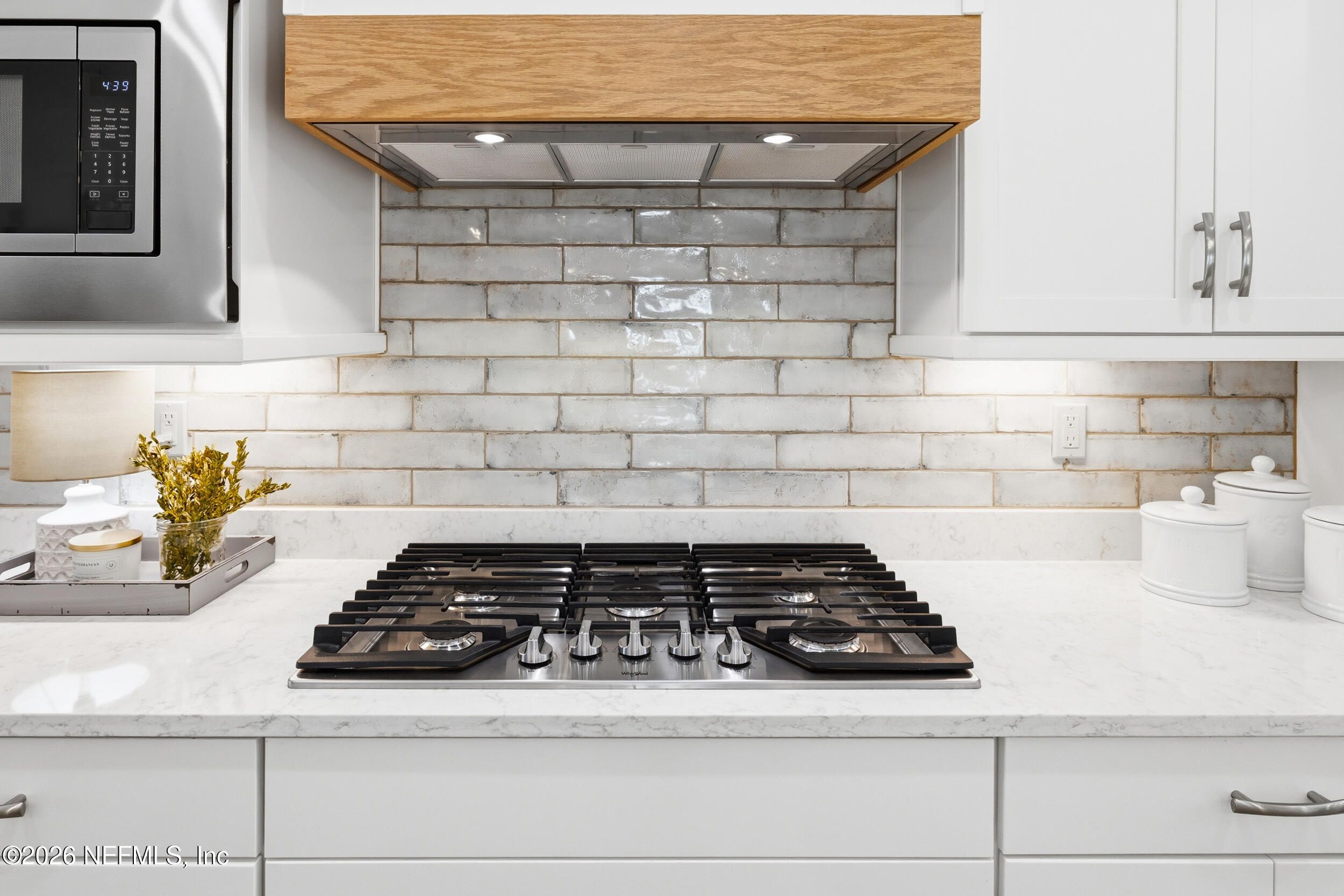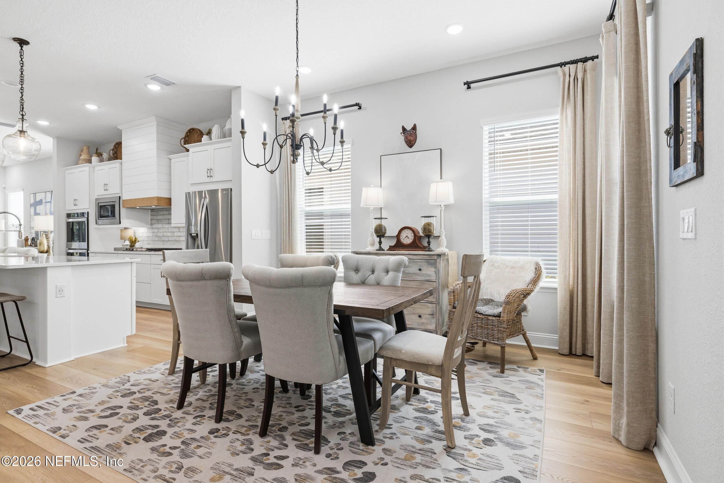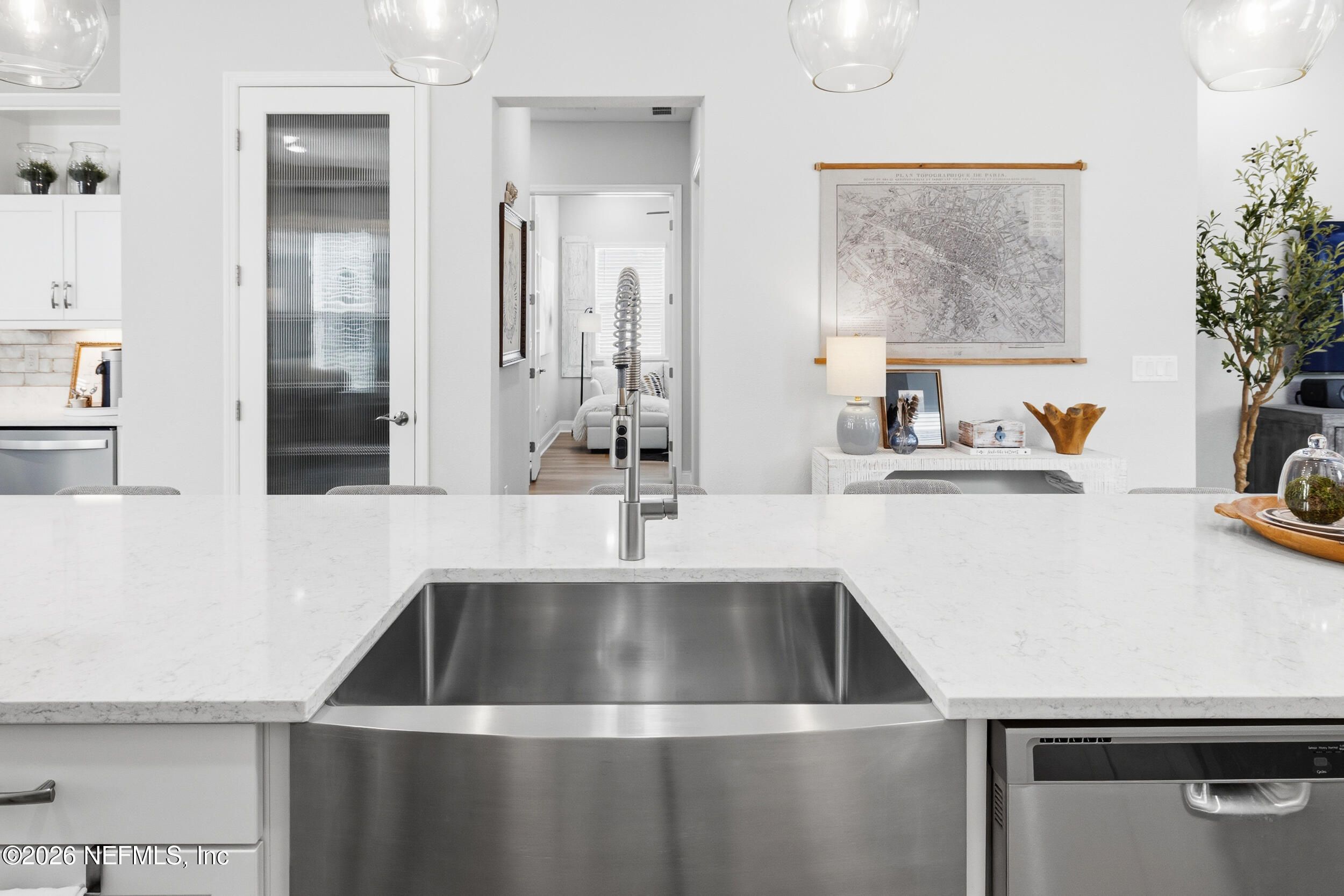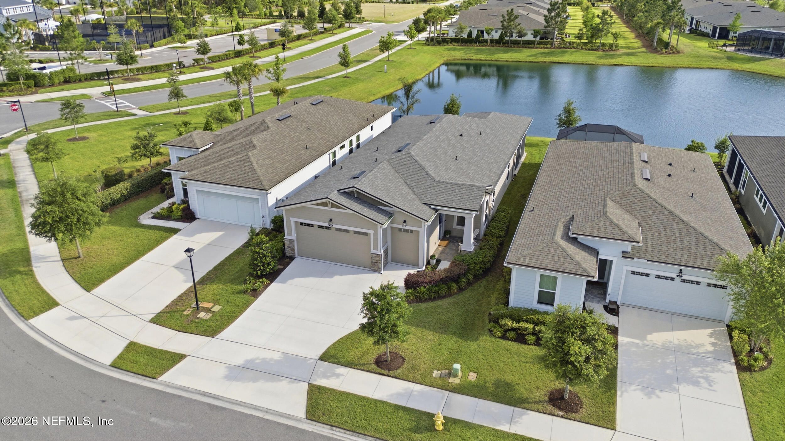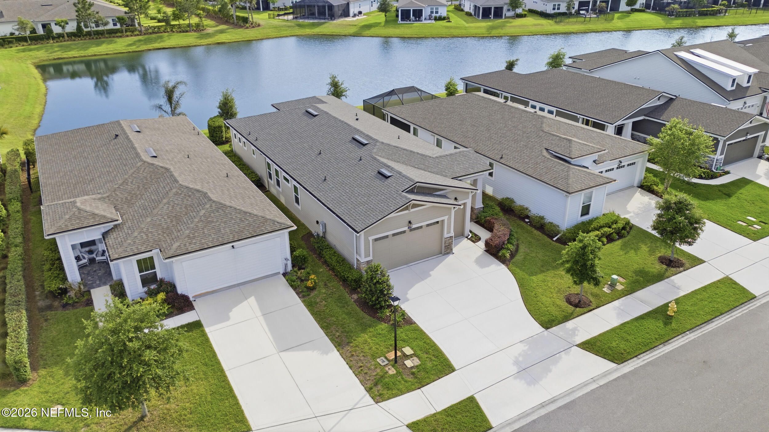 Set within the gated 55+ community of WaterSong at RiverTown, 53 Kellet Way is a magazine-worthy Lane Model that blends coastal craftsmanship with effortless indoor-outdoor living. Built in 2021 and offering 1,811 sq ft with 2 bedrooms plus an office/den and 2 baths, the home showcases warm luxury vinyl plank flooring, custom shiplap accents, designer lighting, and a thoughtfully designed open layout that captures breathtaking wide pond views from the main living spaces and lanai. The kitchen was designed with entertaining in mind, centered around a long dining island topped with gray-veined white quartz, illuminated by seeded glass globe pendants. White cabinetry, antiqued textured subway tile backsplash, stainless appliances including a gas cooktop and double wall ovens, and a farmhouse sink create a space that is both beautiful and functional. Just off the kitchen, a wet bar with beverage refrigerator and sink makes hosting effortless while the dining area and stacking sliding glass doors extend the living space seamlessly to the screened lanai. The primary suite is a serene retreat, featuring a tray ceiling, clerestory windows that fill the room with natural light, and a barn-door entry to the spa-inspired bath. Inside, you'll find a zero-entry spa shower, quartz counters, rustic framed mirrors, a shiplap vanity accent wall, and a large walk-in closet complete with luggage racks and direct access to the laundry room for everyday convenience. Outdoor living truly shines here. The screen-enclosed lanai captures tranquil pond views and includes dual ceiling fans, privacy curtains, and paver flooring, creating the perfect setting for morning coffee or evening gatherings. The summer kitchen with grill, sink, refrigerator, and woven pendant lighting elevates outdoor entertaining and landscaped screening enhances privacy and relaxation. Additional features include a welcoming foyer with shiplap accent wall, a drop zone with bench and cubbies, an office/den ideal for working or hobbies, a 2-car garage plus dedicated golf cart bay, smart keyless entry, and a tankless water heater. Residents of WaterSong at RiverTown enjoy an exclusive active-adult lifestyle with resort-style amenities including two amenity centers, a pool, lap pool, outdoor spa, pickleball and bocce courts, fitness centers, biergarten, dog park, event lawn, and a full-time lifestyle director hosting community activities while just a short drive from Jacksonville, beaches, shopping, dining, and top medical facilities.