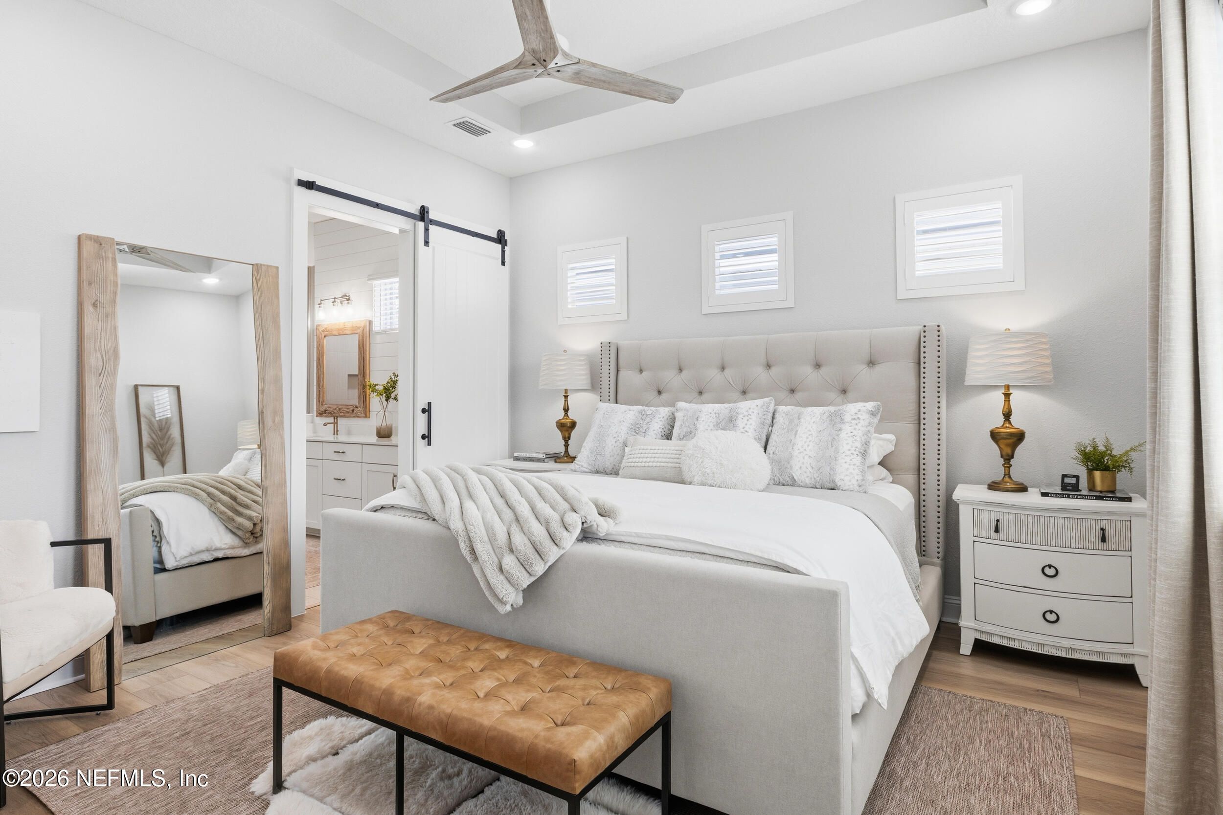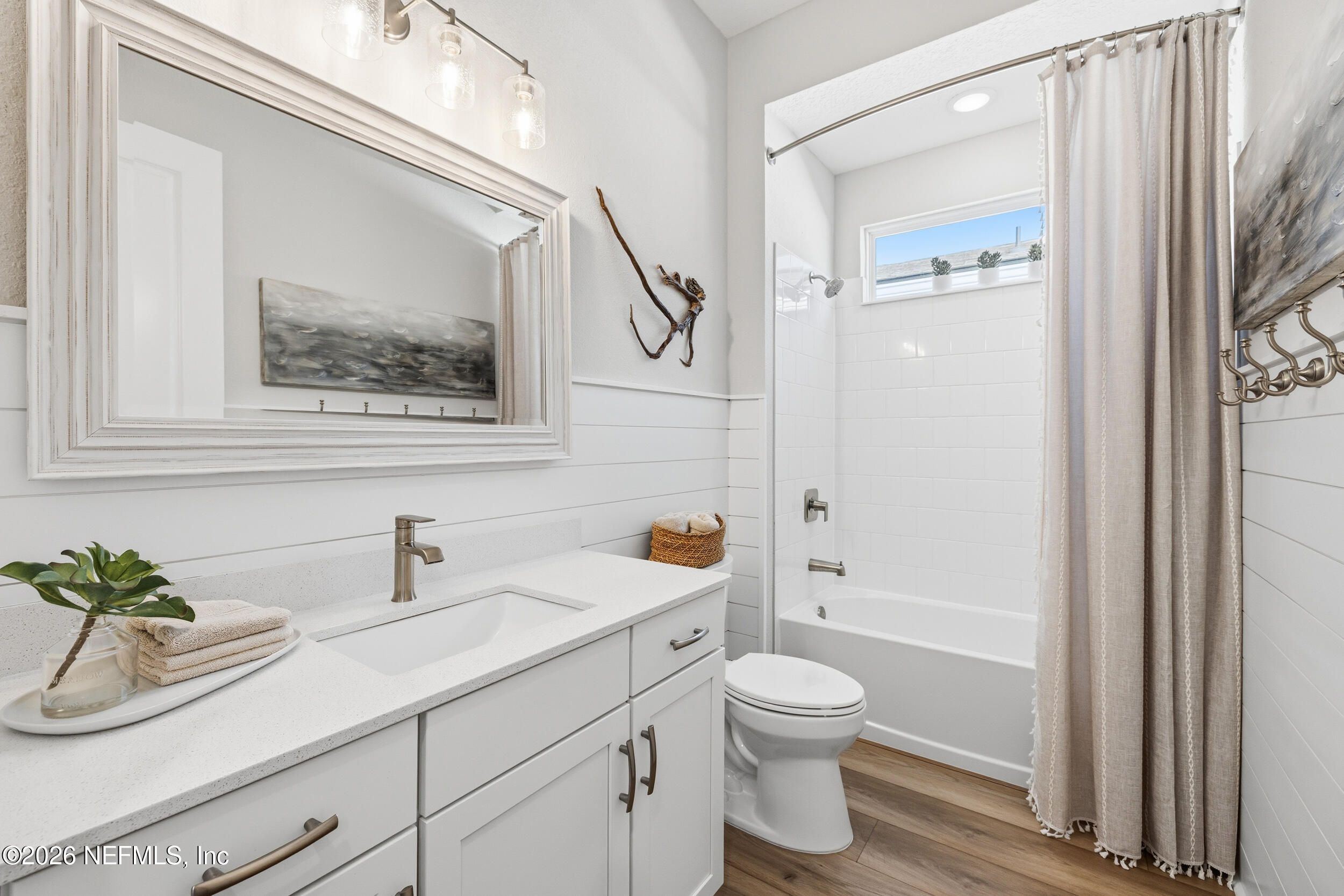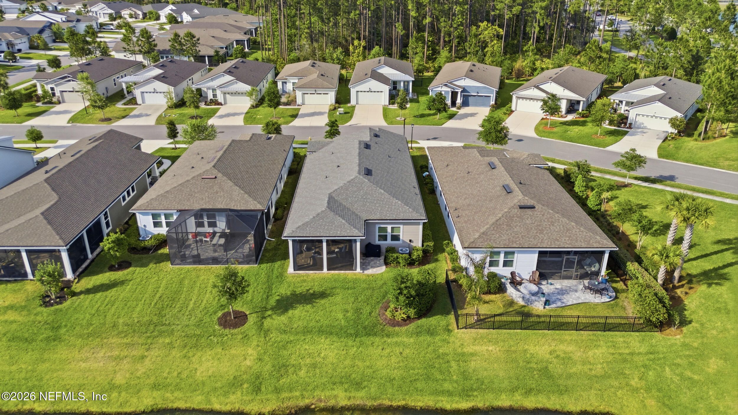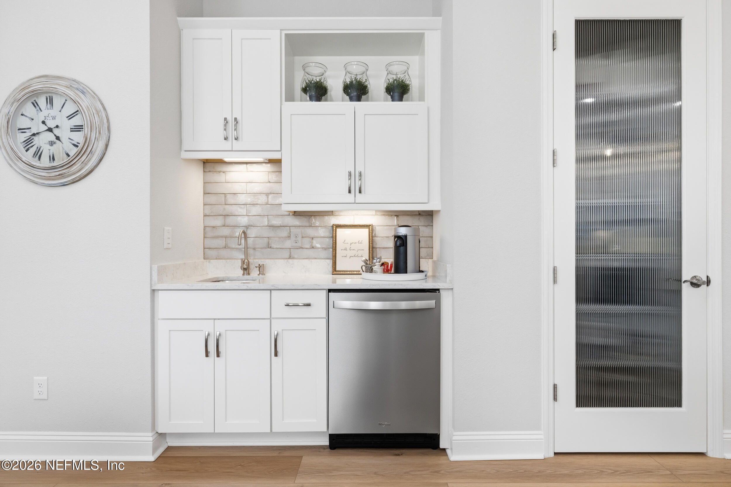 Set within the gated 55+ community of WaterSong at RiverTown, 53 Kellet Way is a magazine-worthy Lane Model that blends coastal craftsmanship with effortless indoor-outdoor living. Built in 2021 and offering 1,811 sq ft with 2 bedrooms plus an office/den and 2 baths, the home showcases warm luxury vinyl plank flooring, custom shiplap accents, designer lighting, and a thoughtfully designed open layout that captures breathtaking wide pond views from the main living spaces and lanai. The kitchen was designed with entertaining in mind, centered around a long dining island topped with gray-veined white quartz, illuminated by seeded glass globe pendants. White cabinetry, antiqued textured subway tile backsplash, stainless appliances including a gas cooktop and double wall ovens, and a farmhouse sink create a space that is both beautiful and functional. Just off the kitchen, a wet bar with beverage refrigerator and sink makes hosting effortless while the dining area and stacking sliding glass doors extend the living space seamlessly to the screened lanai. The primary suite is a serene retreat, featuring a tray ceiling, clerestory windows that fill the room with natural light, and a barn-door entry to the spa-inspired bath. Inside, you'll find a zero-entry spa shower, quartz counters, rustic framed mirrors, a shiplap vanity accent wall, and a large walk-in closet complete with luggage racks and direct access to the laundry room for everyday convenience. Outdoor living truly shines here. The screen-enclosed lanai captures tranquil pond views and includes dual ceiling fans, privacy curtains, and paver flooring, creating the perfect setting for morning coffee or evening gatherings. The summer kitchen with grill, sink, refrigerator, and woven pendant lighting elevates outdoor entertaining and landscaped screening enhances privacy and relaxation. Additional features include a welcoming foyer with shiplap accent wall, a drop zone with bench and cubbies, an office/den ideal for working or hobbies, a 2-car garage plus dedicated golf cart bay, smart keyless entry, and a tankless water heater. Residents of WaterSong at RiverTown enjoy an exclusive active-adult lifestyle with resort-style amenities including two amenity centers, a pool, lap pool, outdoor spa, pickleball and bocce courts, fitness centers, biergarten, dog park, event lawn, and a full-time lifestyle director hosting community activities while just a short drive from Jacksonville, beaches, shopping, dining, and top medical facilities.