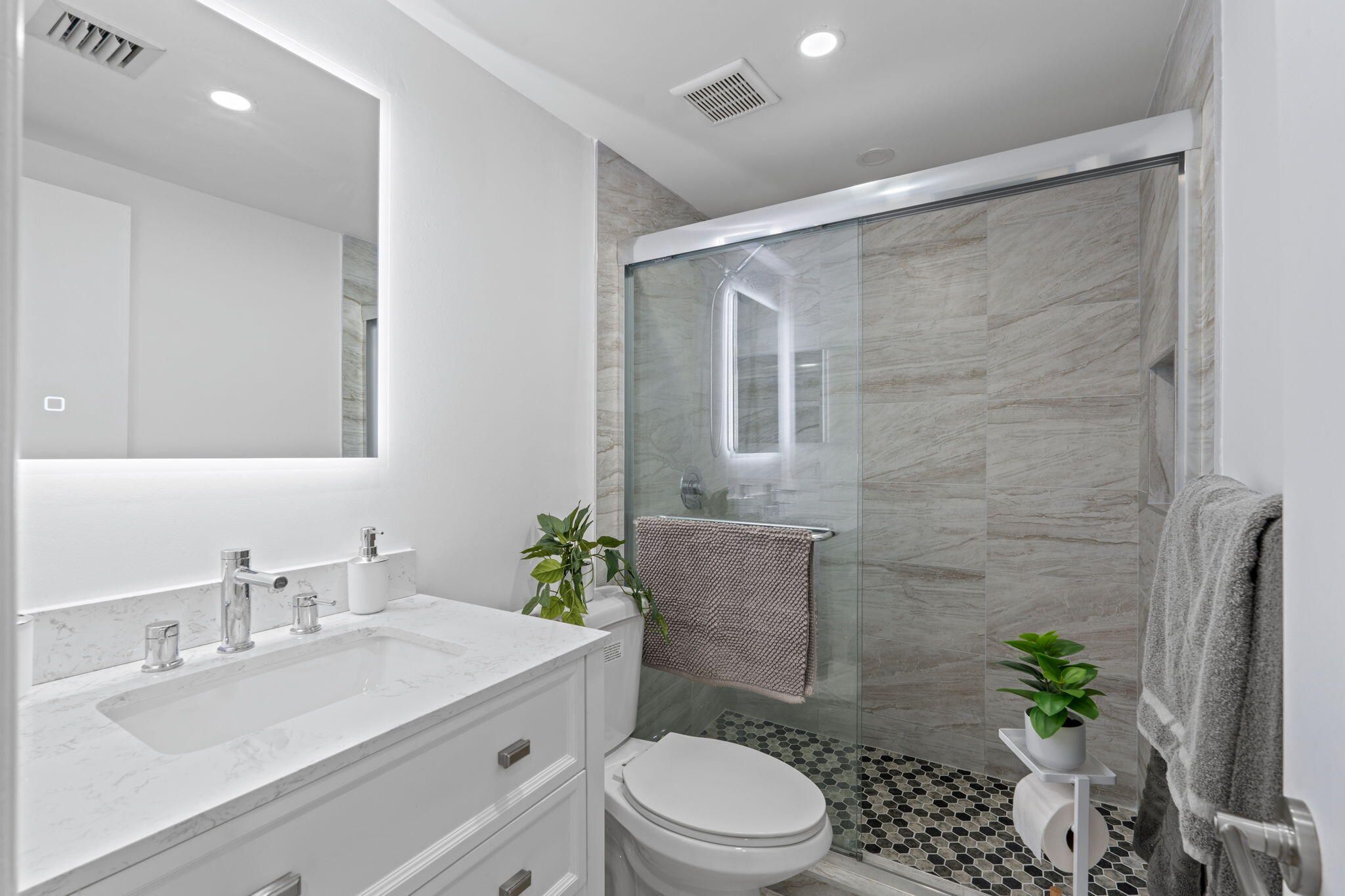 Beautifully renovated 2BR/1BA condo in Sterling Village, Boynton Beach. This turnkey, fully furnished home features an open kitchen with quartz counters, white shaker cabinets, and stainless steel appliances. Wide plank flooring, recessed lighting, and central A/C bring modern comfort throughout. Bathroom fully updated with glass shower, designer finishes, and LED mirror. Enjoy intracoastal views from the screened balcony and bedroom. Elevator building with community pool, clubhouse, shuffleboard, putting green, and private waterfront boardwalk just steps away. Active 55+ community near Banana Boat, Two Georges, and downtown Boynton Beach.