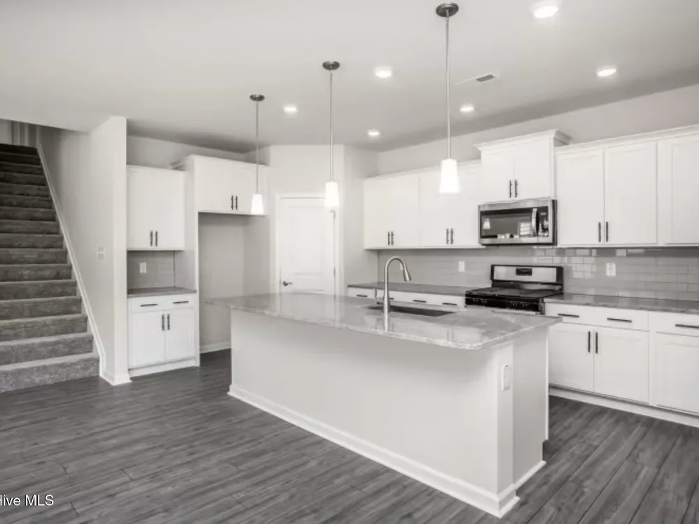 Welcome to the Raymond, a thoughtfully designed home by esteemed builder Pulte. Offering 2,229 square feet of living space, this residence includes three bedrooms, two and a half bathrooms, a private office, and a spacious loft, ideal for a variety of lifestyles. The heart of the home is the beautifully appointed kitchen, where a large island with upgraded pendant lighting creates a striking centerpiece. Quartz countertops reflect natural light throughout the room, complemented by rich brown cabinetry and a stylish tile backsplash that ties the space together. This upgraded kitchen features premium KitchenAid gas appliances, a large single-basin sink, and enhanced hardware finishes that elevate both function and style. Located on the main level, the owner's suite is a true retreat. The ensuite bath showcases dual quartz vanities, a walk-in shower with elegant tile surround and frameless glass door, and a generous walk-in closet. Just steps from the suite, the main-level laundry room adds daily convenience. Also on the first floor, the open-concept gathering room flows seamlessly to a screened-in porch, perfect for relaxing or entertaining. Upstairs, the home offers a large, versatile loft space along with an additional flex room that can be tailored to your needs. Two secondary bedrooms and a full bathroom complete the second floor, providing comfort and privacy for family or guests. Throughout the home, you'll find hard surface flooring with cozy carpet in the bedrooms. Additional features include solid oak stair treads with wood baluster railing, window blinds, LED lighting, an upgraded interior trim package, a base paint upgrade, programmable thermostat, Ring doorbell camera, and a two-car garage. This home is ideal for those seeking the ease of primary living on the first floor while still having ample space for visitors and extended family.