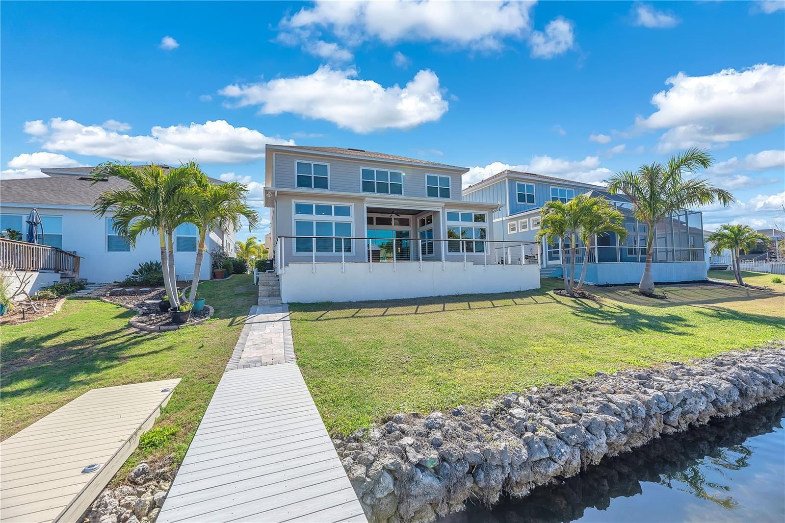 Nestled along the shores of Tampa Bay, this stunning 4-bedroom, 3.5-bath waterfront residence offers the perfect blend of luxury, comfort, and effortless outdoor living — complete with a bonus room and your own private boat dock and sparkling saltwater pool. From the moment you step inside, the home welcomes you with light-filled spaces, coastal elegance, and serene water views. The open-concept design is ideal for gatherings and year-round entertaining, seamlessly connecting the gourmet kitchen, dining area, and spacious living room. The chef’s kitchen is both beautiful and functional, featuring quartz countertops, stainless steel appliances, a gas cooktop with pot filler, and an oversized island with seating — the perfect place for morning coffee before a day on the water or hosting friends for sunset cocktails. The living room showcases a stunning wall of built-in wood beam shelving with integrated LED lighting, beautifully framing an electric fireplace beneath the large TV (included with the home) to create a warm, inviting ambiance. The first-floor primary suite is a peaceful retreat designed for relaxation. Wake up to canal views and unwind in a spa-inspired bath showcasing dual quartz vanities, a generous walk-in custom closet, and an oversized shower. Upstairs, a versatile bonus room provides flexible space for a media room, playroom, or a fifth bedroom. Three additional bedrooms offer comfort and privacy, including a secondary suite with its own private bath — ideal for guests or multi-generational living. Step outside and experience the true highlight of this waterfront retreat. The saltwater pool and inviting waterfall features invite you to cool off or unwind with an evening swim as the sky turns shades of coral and gold. The spacious lanai is designed for effortless entertaining, complete with an outdoor kitchen and sink — perfect for grilling fresh catch and serving drinks poolside. A newly installed, hurricane-rated remote-controlled Storm Screen adds both protection and comfort, allowing you to open the living room’s accordion glass doors wide and enjoy seamless indoor-outdoor living while keeping insects at bay. Just beyond the lanai, your private dock awaits. Equipped with a 10,000-pound boat lift, it provides direct access to open water and endless adventure. Spend your mornings paddleboarding in calm waters, afternoons fishing from your own backyard, or set out for an evening cruise into Tampa Bay as dolphins play and the sun melts into the horizon. This is waterfront living at its most vivid and unforgettable. Life in MiraBay extends far beyond your front door. Residents enjoy resort-style amenities including a waterfront clubhouse, pools with waterslides, a state-of-the-art fitness center, tennis and basketball courts, playgrounds, and scenic walking trails lined with palm trees and coastal breezes. The community’s beautifully maintained grounds and guard-gated entrance create a sense of privacy and exclusivity, while still being conveniently located near shopping, dining, and top-rated schools. Whether you’re entertaining by the pool, setting out for a day on the water, or enjoying peaceful evenings overlooking the bay, this MiraBay residence offers a lifestyle many only dream about. Luxury waterfront living. Private dock. Resort amenities. This is Florida living at its finest. Schedule your private tour today and start living the coastal life this spring.