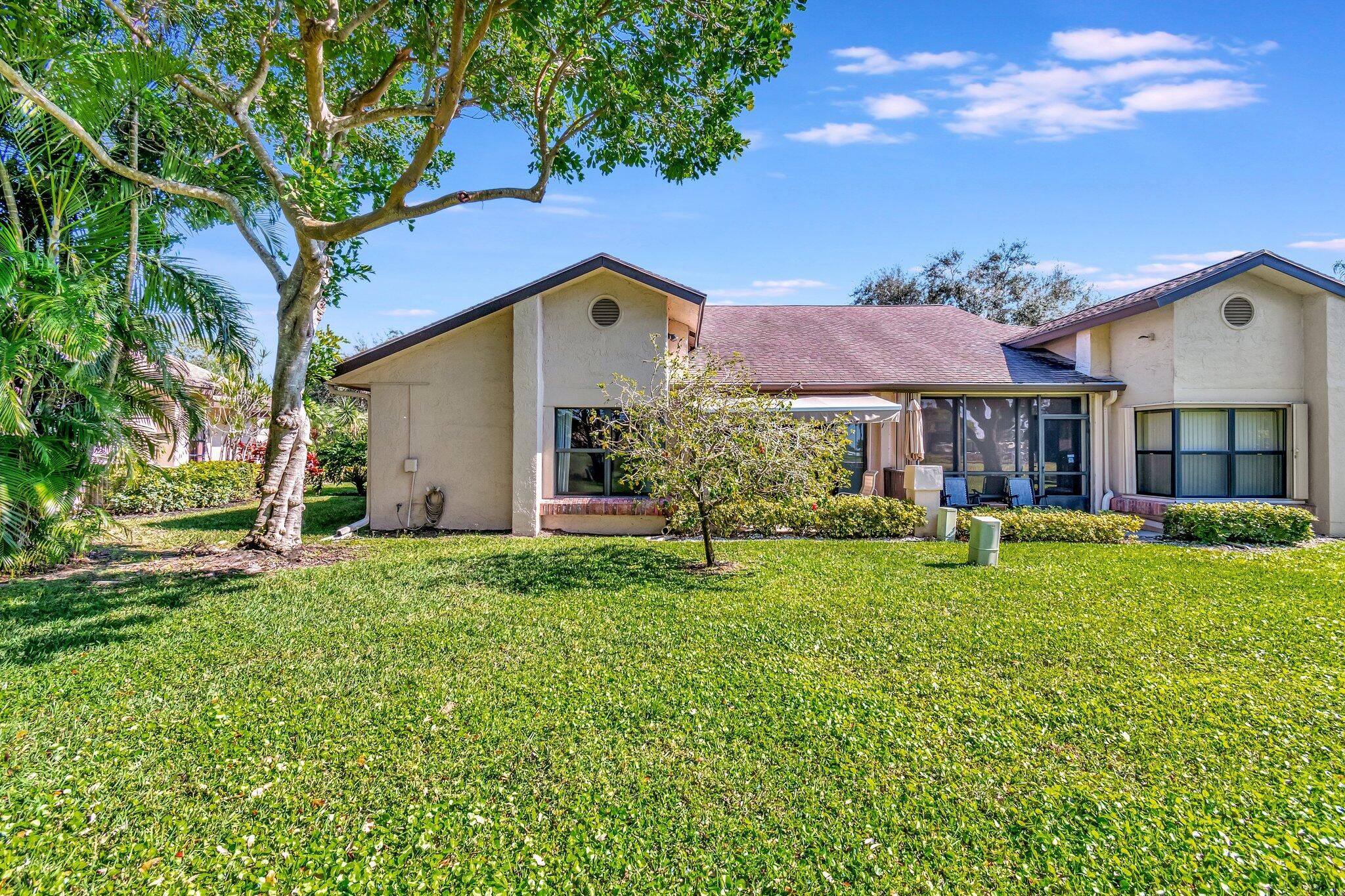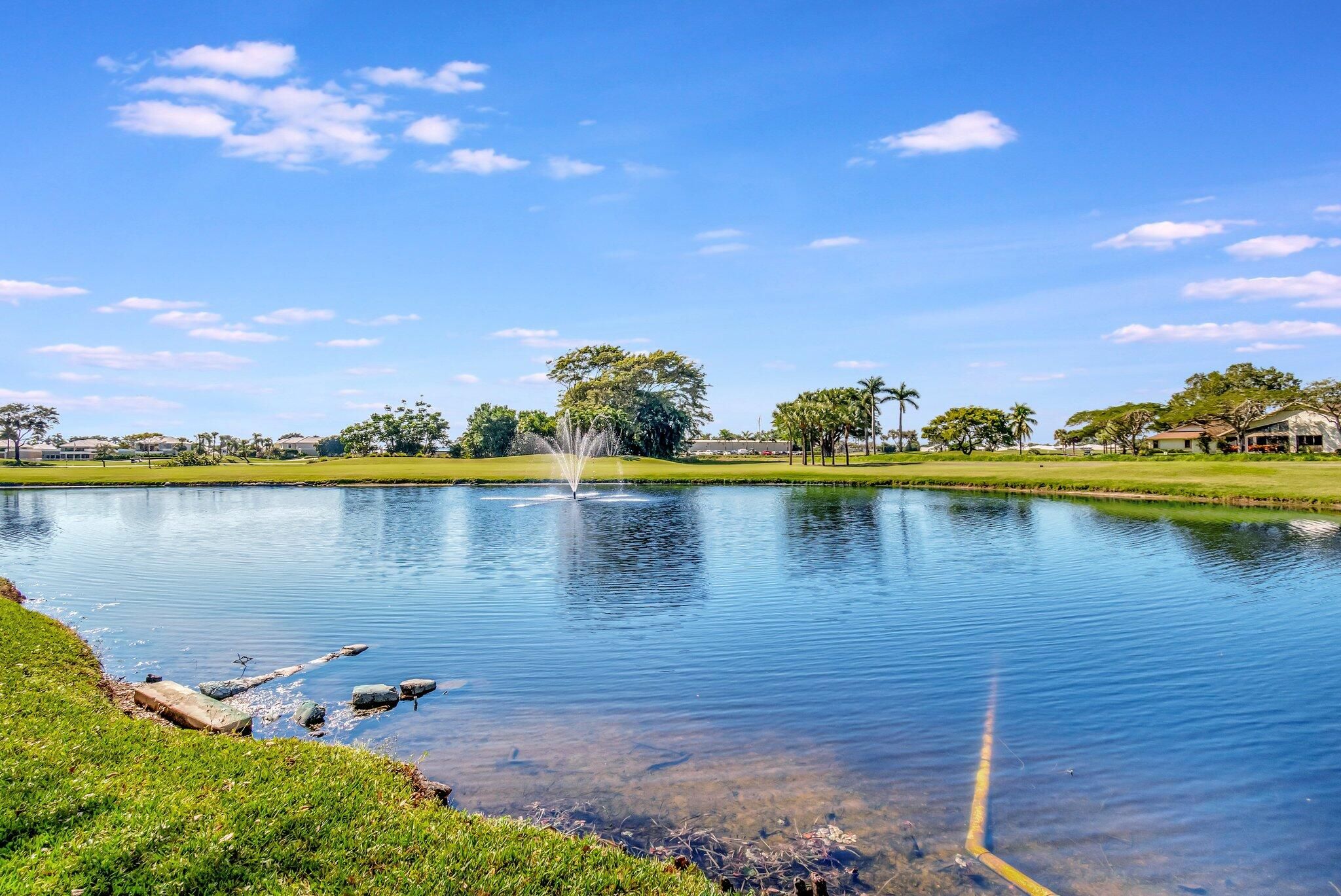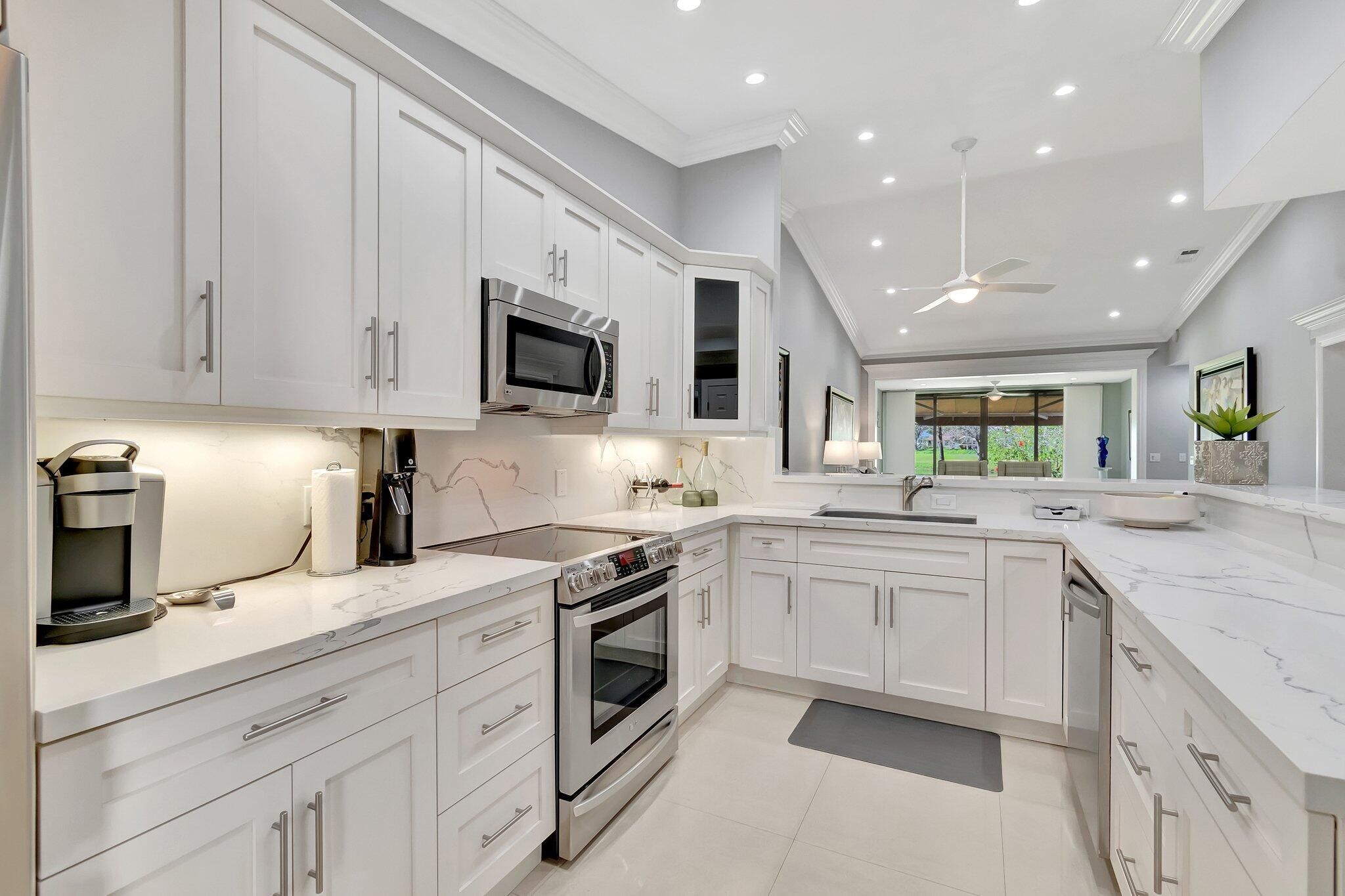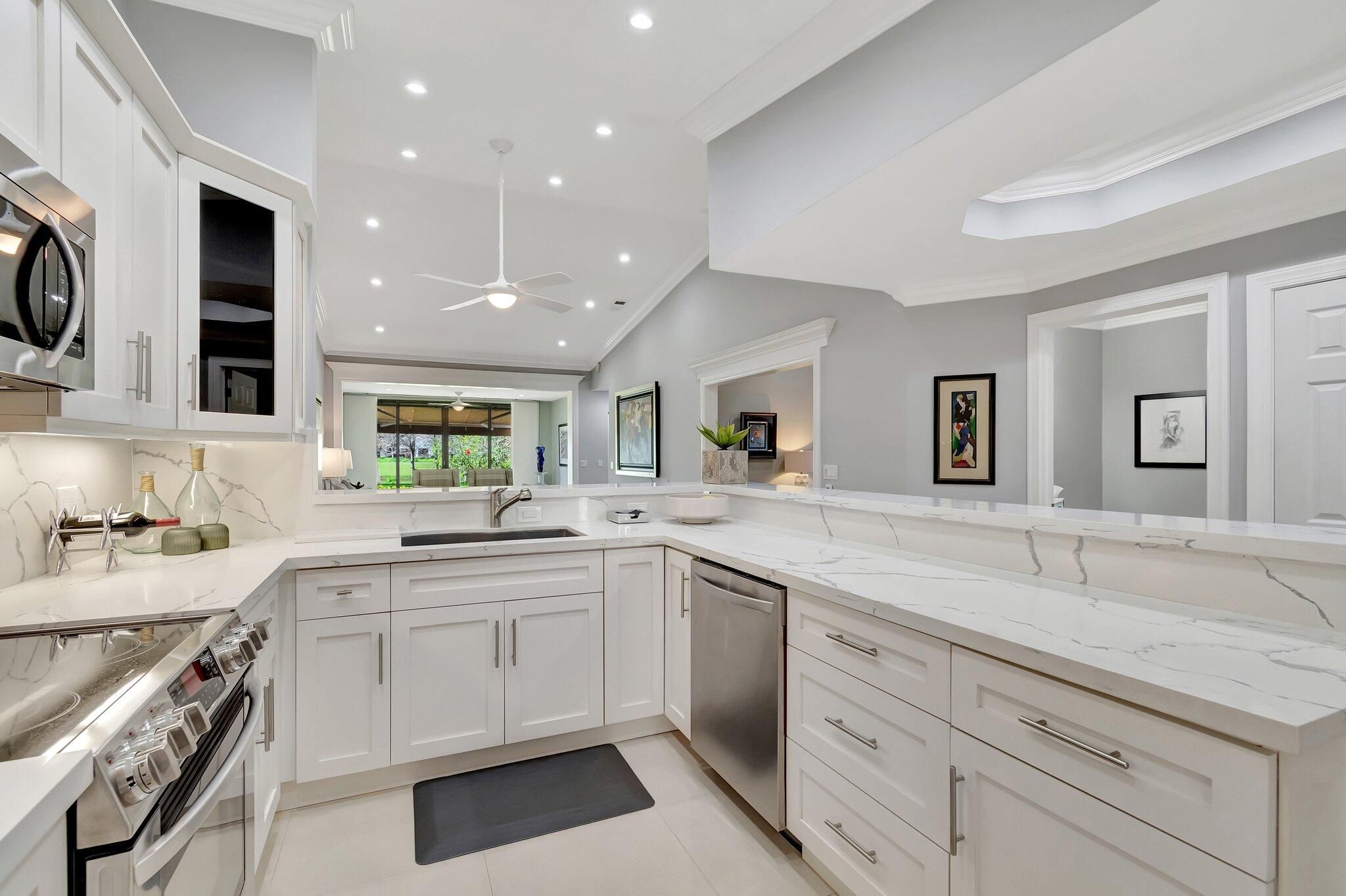 Country Club living without equity or club membership fees. Unbelievable value! Professionally designed stunning corner villa with 2 bedroom plus den with 2 ½ baths and 1 1/2 car garage. Open concept living space, laundry room, gourmet kitchen with top of the line stainless steel appliances, quartz counter tops and backsplash, porcelain floor tile and impact windows. The master bedroom suite features a large walk-in closet, double vanity, walk-in shower and jetted tub. The spacious private courtyard or patio are perfect spots for enjoying your morning coffee or afternoon cocktails. Tranquil lake and golf views from the back of this villa. Great location! Newly renovated Clubhouse. 18 hole executive golf course and 19th Hole Cafe. Close to shops, restaurants, major highways, and the beach.