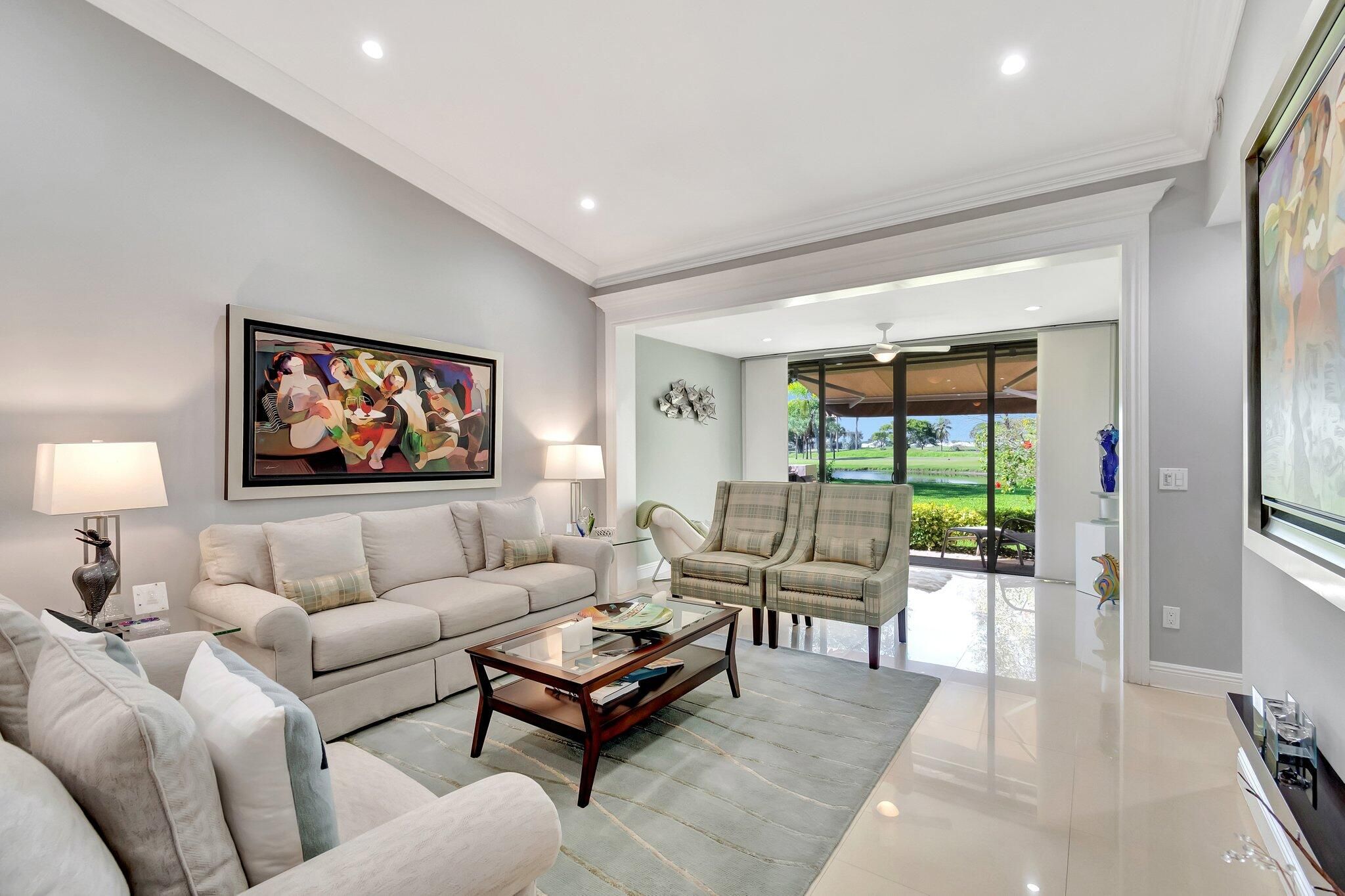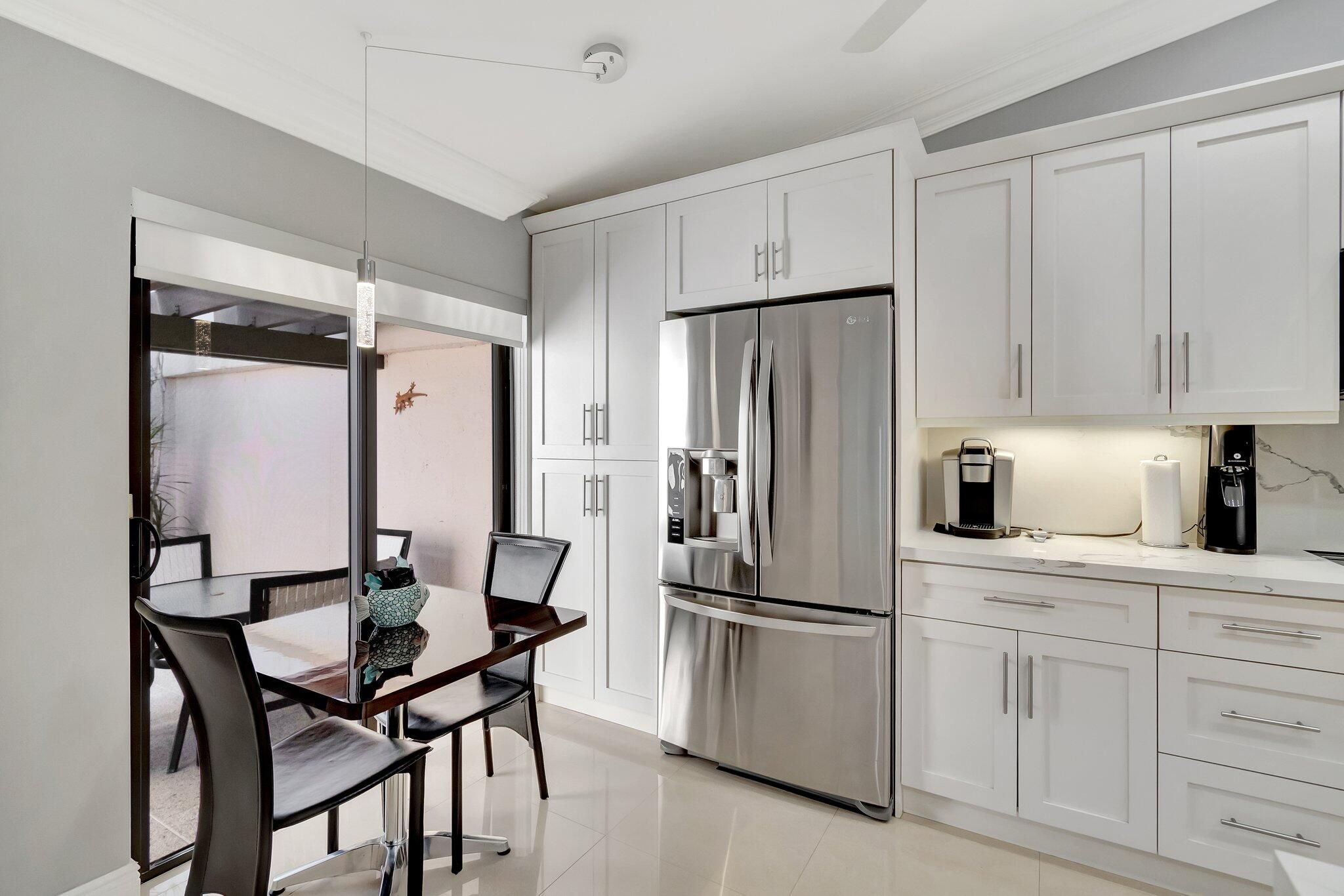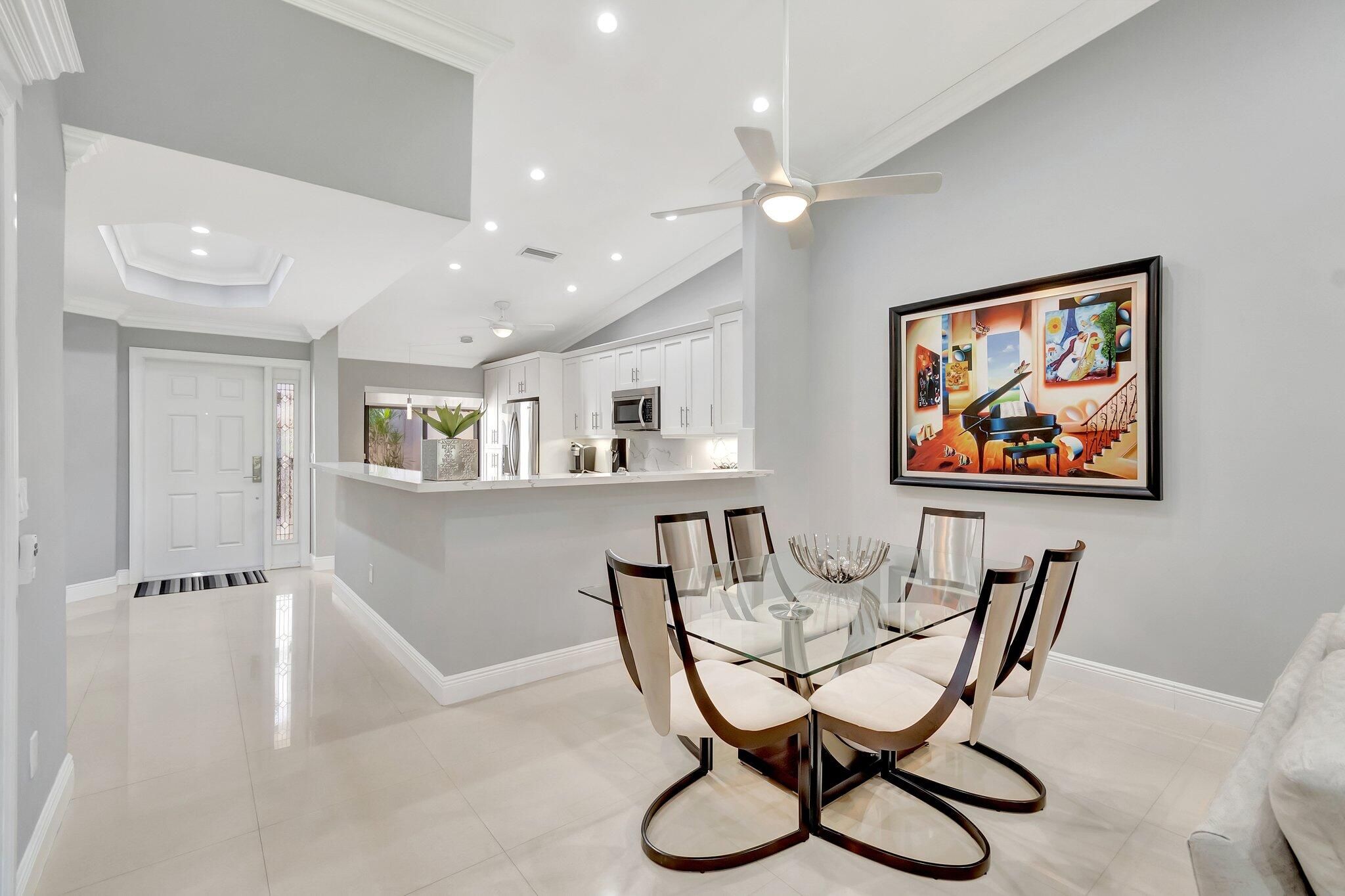 Country Club living without equity or club membership fees. Unbelievable value! Professionally designed stunning corner villa with 2 bedroom plus den with 2 ½ baths and 1 1/2 car garage. Open concept living space, laundry room, gourmet kitchen with top of the line stainless steel appliances, quartz counter tops and backsplash, porcelain floor tile and impact windows. The master bedroom suite features a large walk-in closet, double vanity, walk-in shower and jetted tub. The spacious private courtyard or patio are perfect spots for enjoying your morning coffee or afternoon cocktails. Tranquil lake and golf views from the back of this villa. Great location! Newly renovated Clubhouse. 18 hole executive golf course and 19th Hole Cafe. Close to shops, restaurants, major highways, and the beach.