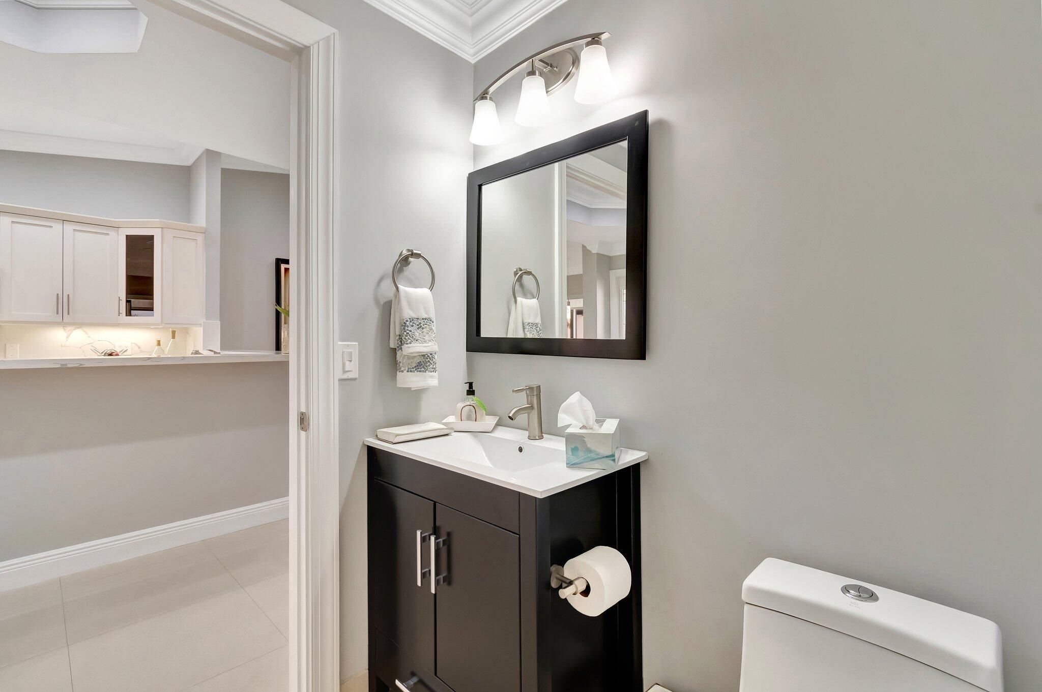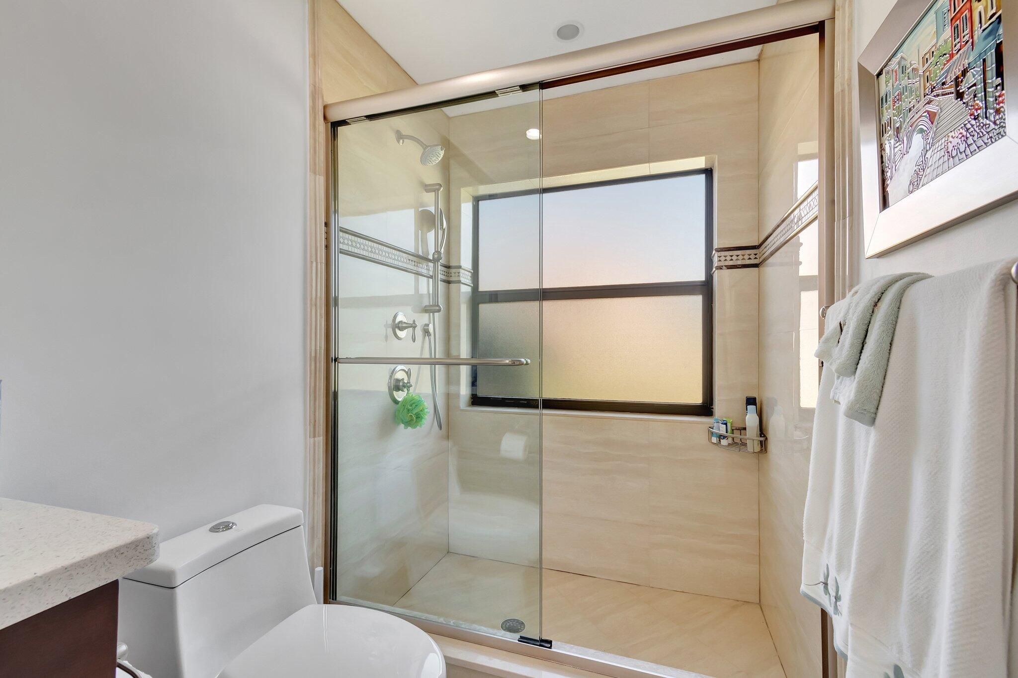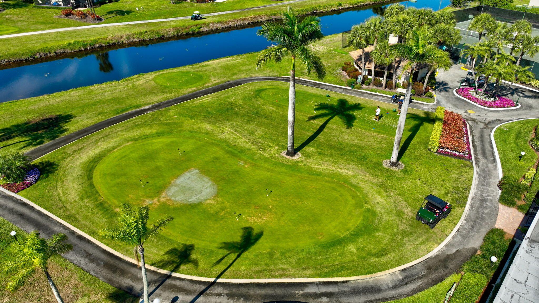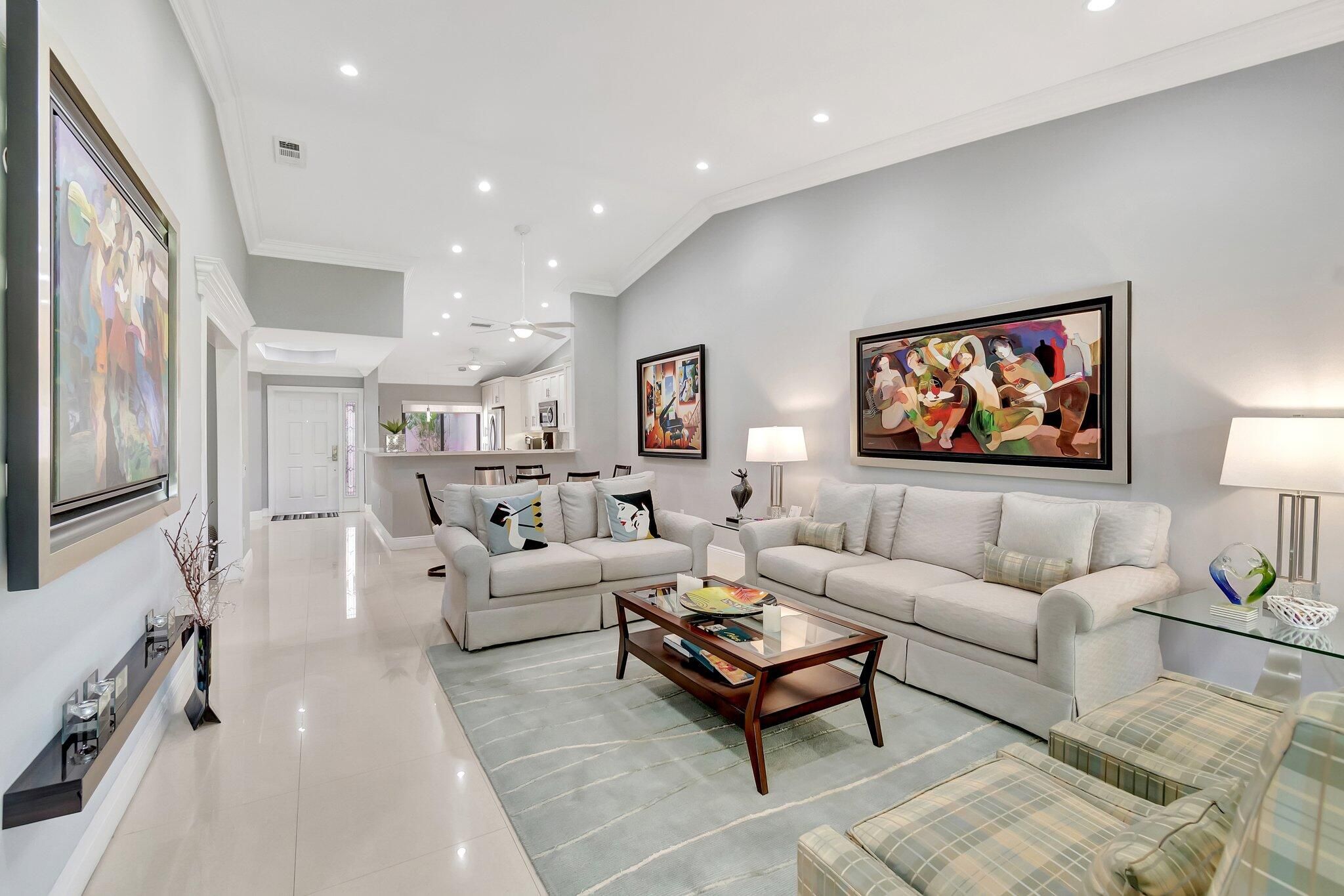 Country Club living without equity or club membership fees. Unbelievable value! Professionally designed stunning corner villa with 2 bedroom plus den with 2 ½ baths and 1 1/2 car garage. Open concept living space, laundry room, gourmet kitchen with top of the line stainless steel appliances, quartz counter tops and backsplash, porcelain floor tile and impact windows. The master bedroom suite features a large walk-in closet, double vanity, walk-in shower and jetted tub. The spacious private courtyard or patio are perfect spots for enjoying your morning coffee or afternoon cocktails. Tranquil lake and golf views from the back of this villa. Great location! Newly renovated Clubhouse. 18 hole executive golf course and 19th Hole Cafe. Close to shops, restaurants, major highways, and the beach.