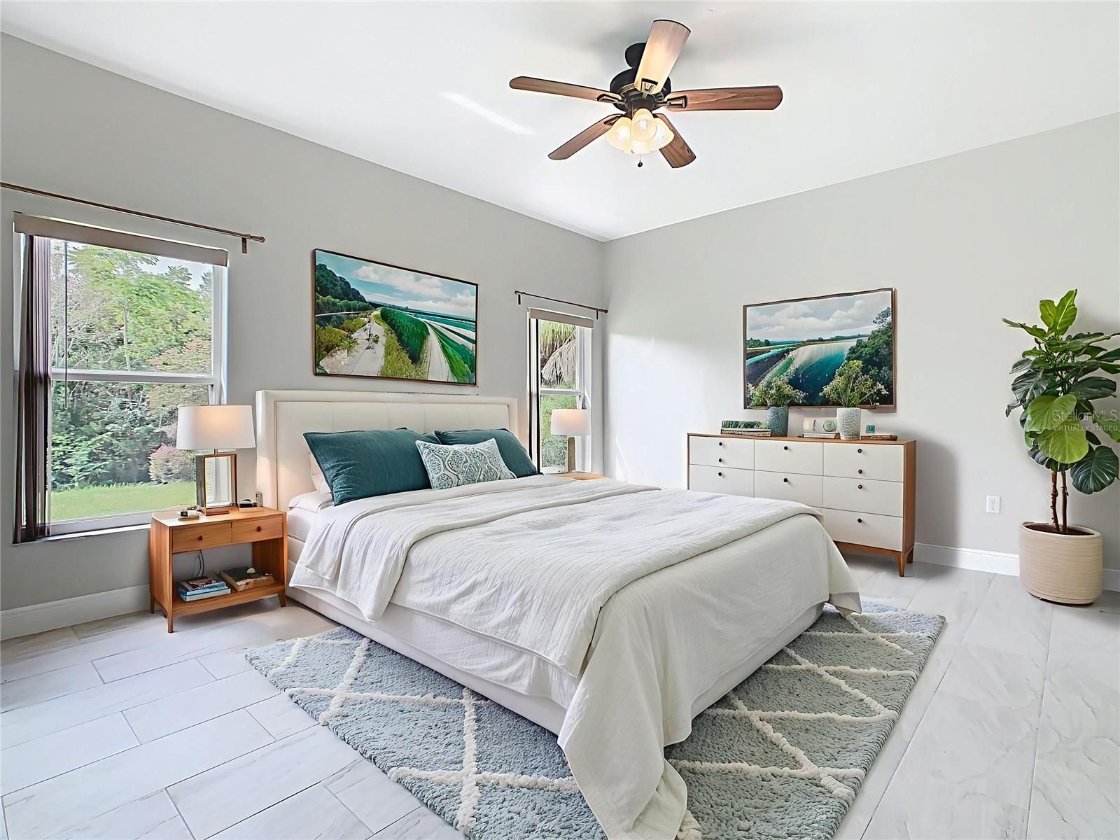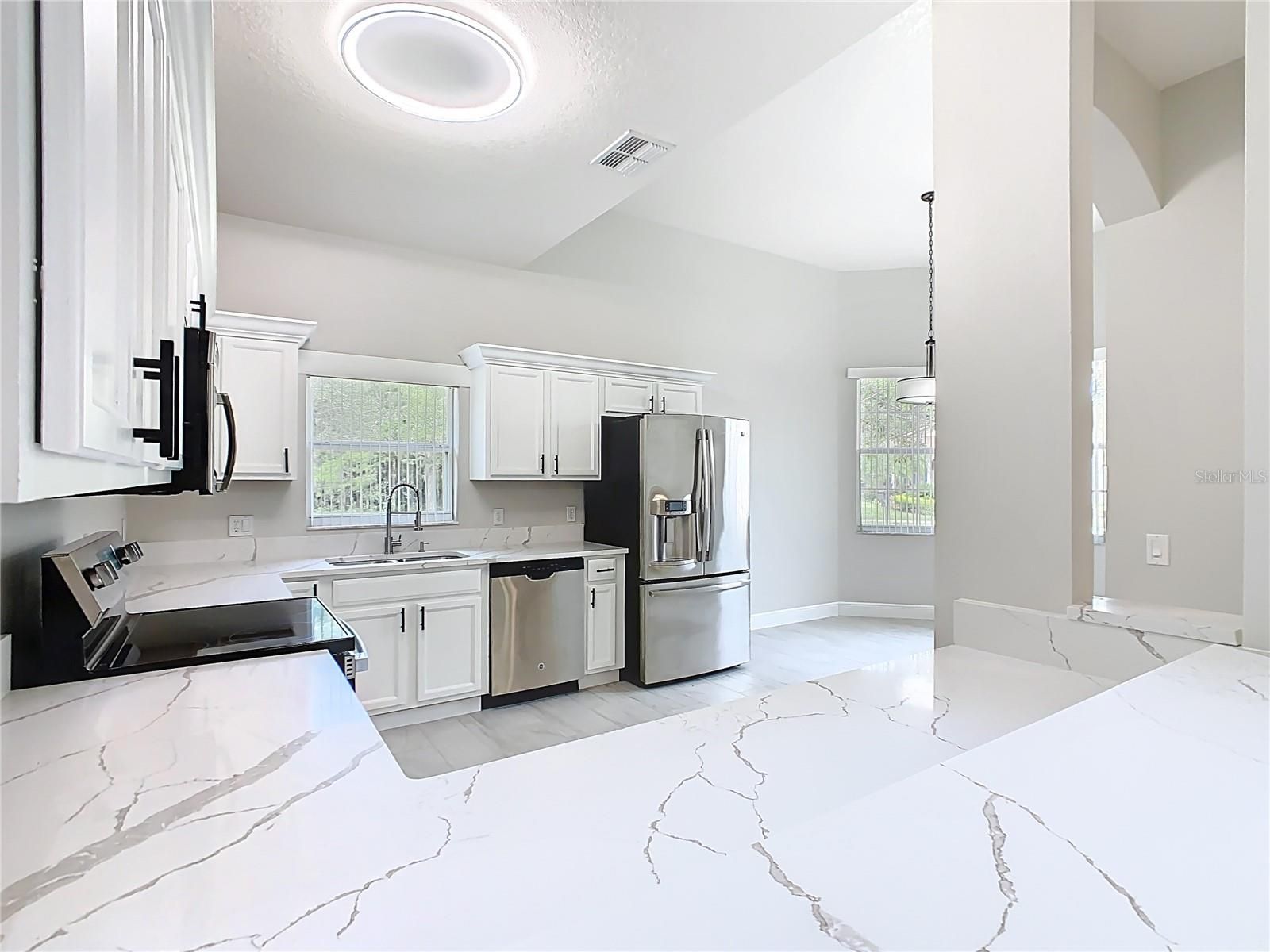 - Ceiling Fan(s), Eat-in Kitchen, High Ceilings, Living/Dining Room, Solid Surface Counters, Split Bedrooms, Stone Counters, Walk-In Closet(s), Window Treatments