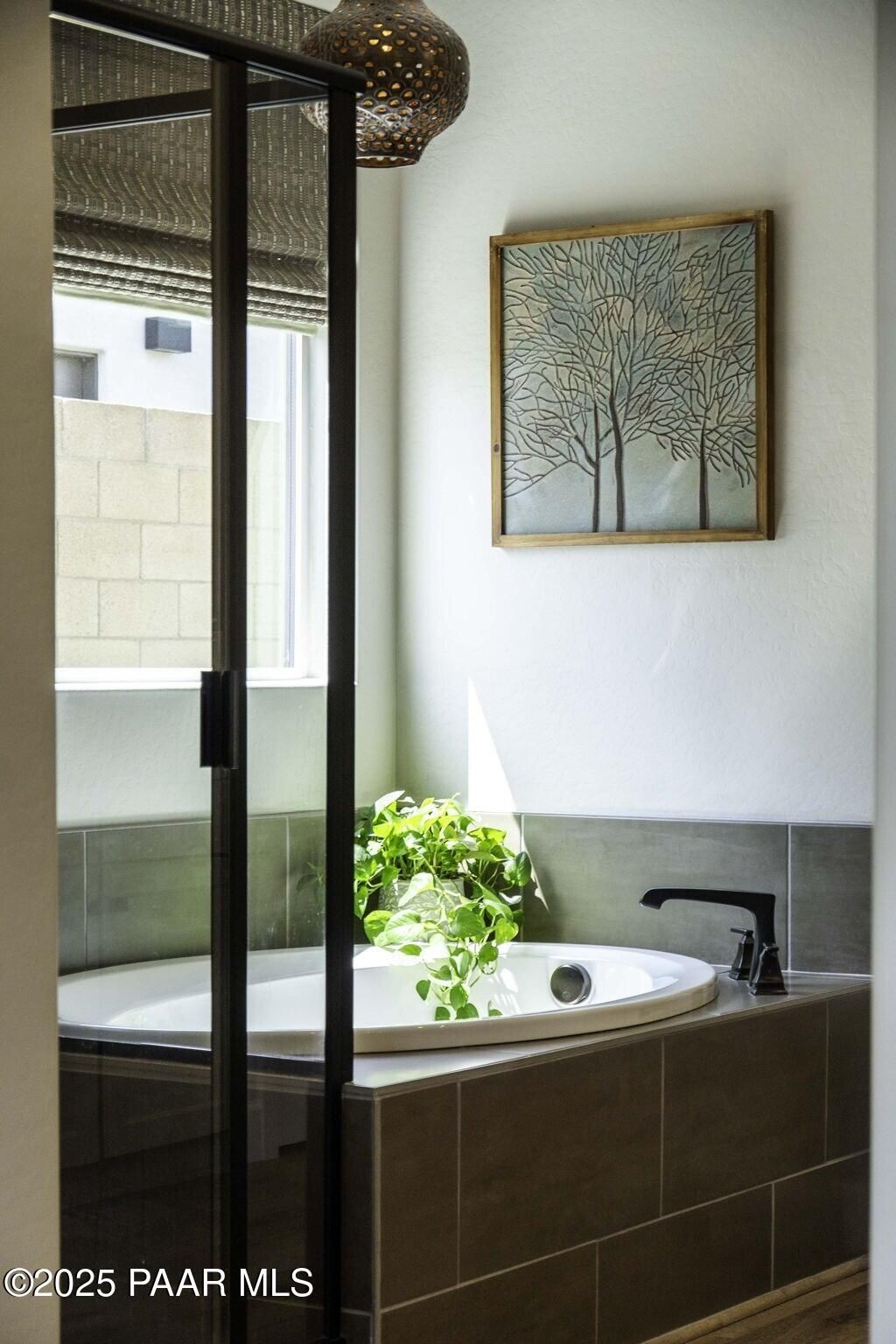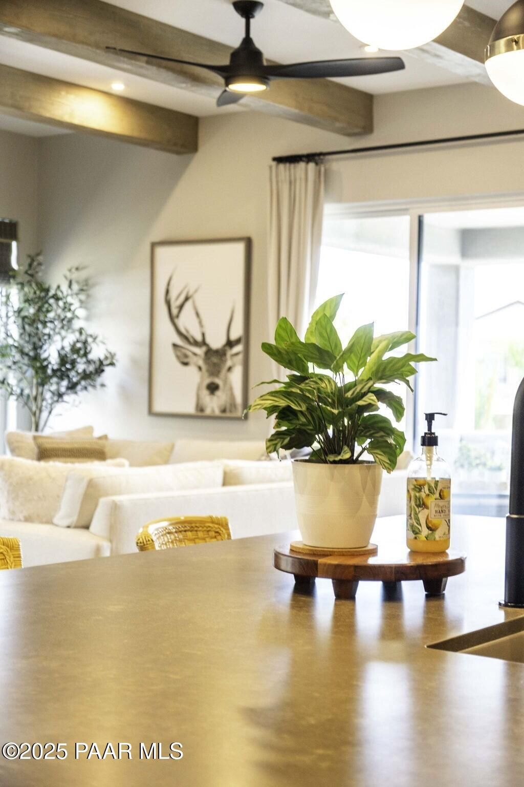 - Beamed Ceilings, Ceiling Fan(s), Wired for Data, Eat-in Kitchen, Soaking Tub, Kitchen/Dining Combo, Kitchen Island, Living/Dining Room, Single Living Level, Pantry, Quartz Countertops, High Ceilings, Walk-In Closet(s)