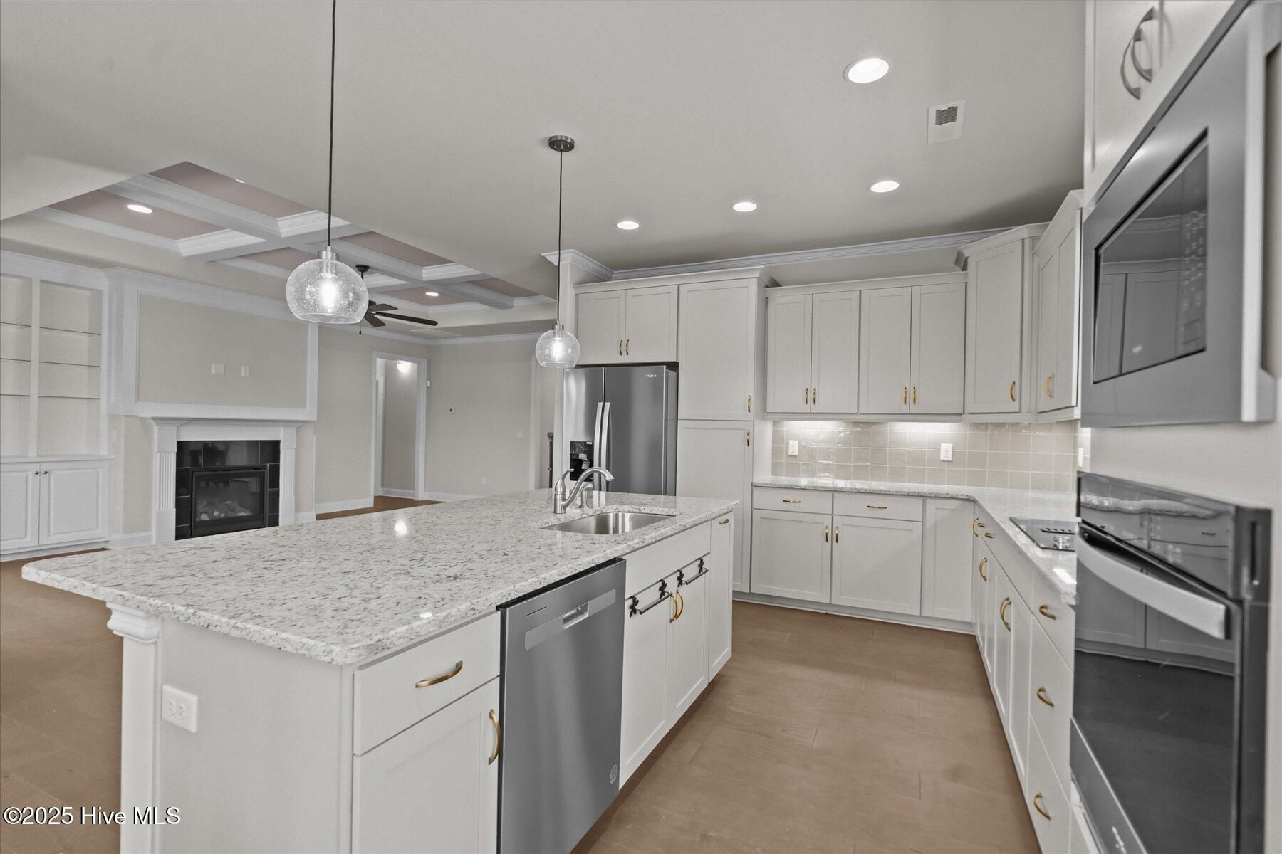 BETTER THAN NEW! GATED COMMUNITY! MOVE-IN READY! BUILDER WARRANTY! Welcome to 5311 Marco Drive—an all-brick beauty tucked inside The Home Place, one of Southport's newest and most charming gated neighborhoods, just minutes from historic downtown and a short drive to the beaches of Oak Island. Why wait to build when you can have it all right now? This 2024-built Beach Boca Villa I by Premier Homes is thoughtfully designed for easy coastal living, with high-end finishes and relaxed elegance throughout. Inside, you'll find engineered tongue and groove flooring, coffered ceilings, crown molding, built-in bookcases, and a cozy gas fireplace anchoring the open-concept living space. The designer kitchen features custom cabinetry, granite countertops, Whirlpool appliances, and a large island that flows seamlessly into the dining area and upgraded Carolina room—perfect for lazy mornings or casual entertaining. The primary suite is a retreat in itself with tray ceilings, dual walk-in closets (vented wood shelving included!), and a spa-like bath with a tiled walk-in shower and dual vanities. With four bedrooms—including one behind French doors that's ideal for a home office—and a private upstairs suite with its own full bath, this layout adapts to whatever life brings. A welcoming front porch, 2-car garage with upgraded epoxy floors, and a builder warranty round out the package. This is coastal living made easy—just move in, relax, and know it'll be a breeze.