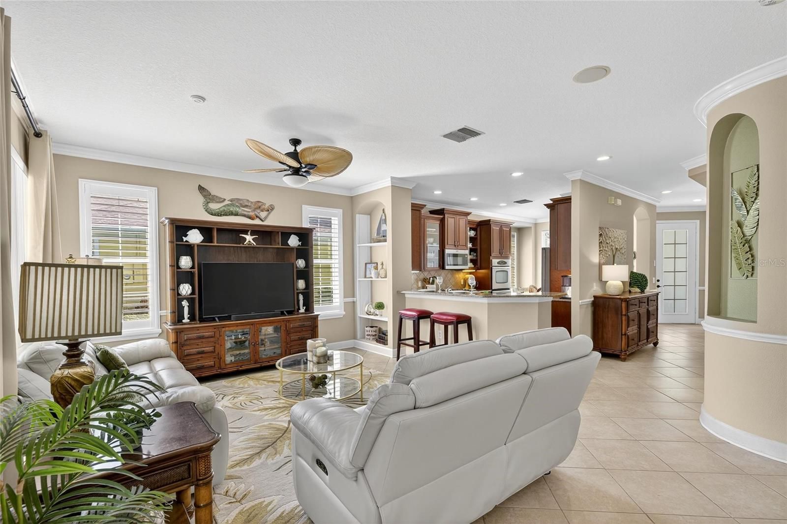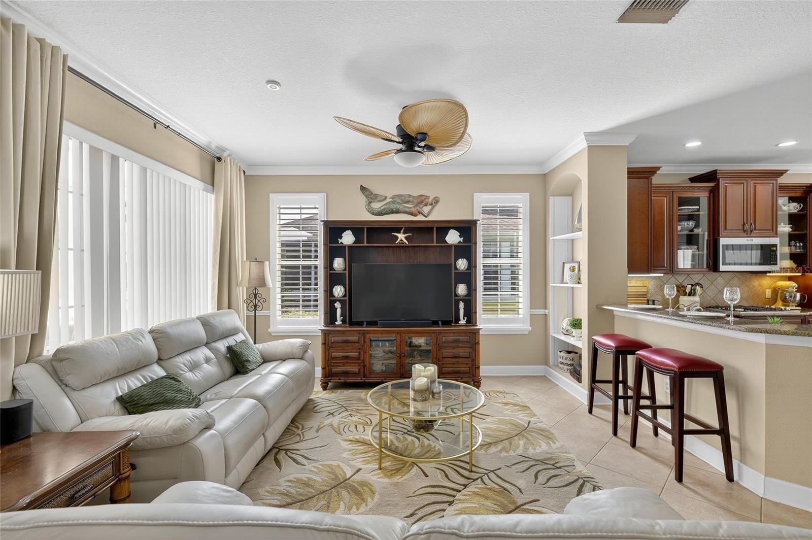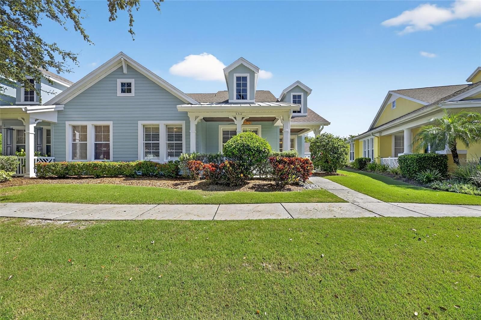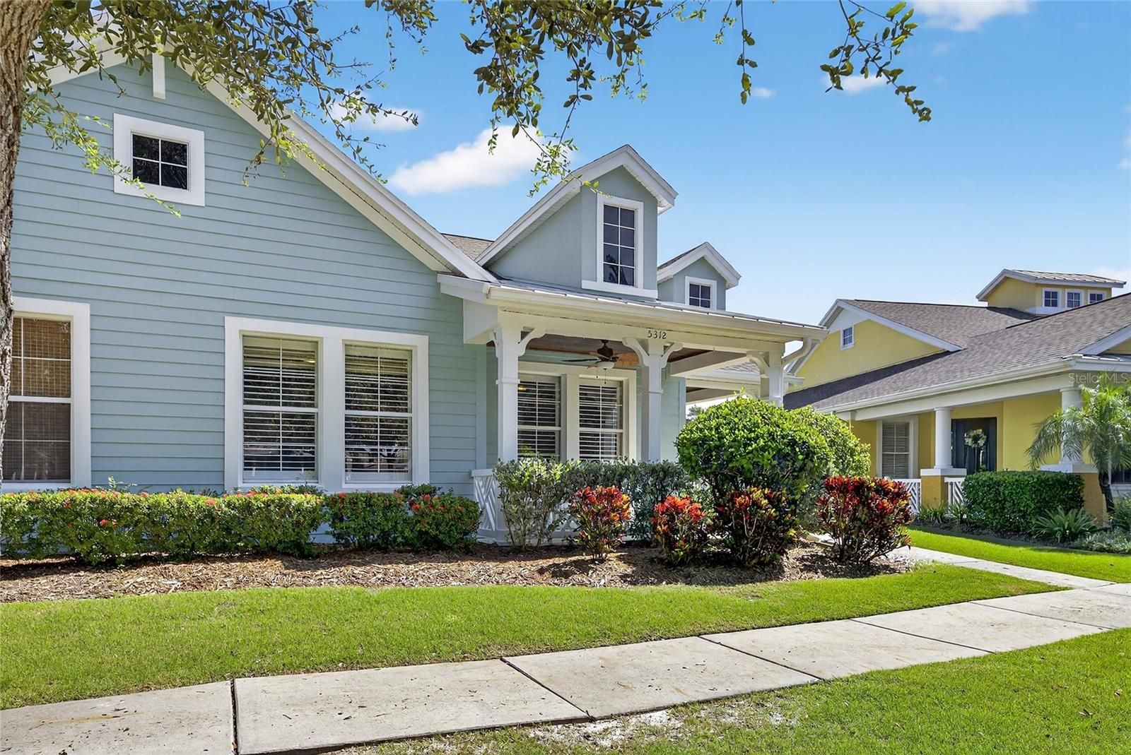 5312 Golden Isles Drive | 3 Beds | 2 Baths | 1,750 Sq Ft | Tidewater Floorplan | Park-Like Views | Villa in MiraBay This upgraded Tidewater villa offers 3 bedrooms, 2 bathrooms, a dedicated office with French doors, and 1,750 square feet of single-story living in the gated waterfront community of MiraBay. Located directly across from a peaceful, park-like green space, the charming front porch creates the perfect setting for relaxing or chatting with neighbors. Inside, you'll find crown molding in every room, hand-rubbed bronze hardware, a surround sound system, granite countertops, and 18-inch diagonal tile in the main areas. The kitchen is a showstopper, featuring 42-inch wood cabinets with crown and rope trim, stainless steel appliances, a gas range, and a double wall oven (including convection). The cozy breakfast nook offers views of the front porch and park. The primary suite includes a custom walk-in closet with built-in organizers and an en suite bath with pedestal sinks, large shower and expansive walk in closet. The secondary bedroom is generously sized, and the office offers flexible space for work or guests. The rear-entry garage includes a laundry sink, and a large screened patio provides private outdoor living at the back of the home. Additional upgrades- new roof 2024, plantation shutter window treatments, built in glass display cabinetry, front and back entry ceiling custom woodwork. MiraBay residents enjoy resort-style amenities including year-round heated pools with lap lanes and a waterslide, a 24-hour fitness center, clubhouse with café and lounge, tennis, pickleball, basketball courts, parks, playgrounds, kayaking, paddleboarding, and miles of walking trails. The community is golf cart-friendly with backroad access to MiraBay Village’s dining, grocery, and retail options. Conveniently located between Tampa and Sarasota, this home offers a coastal lifestyle with easy access to airports, shopping, dining, and entertainment.