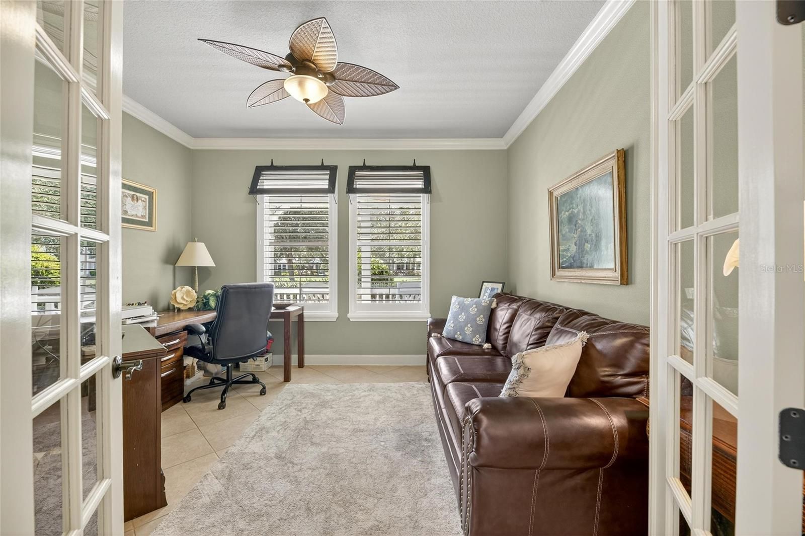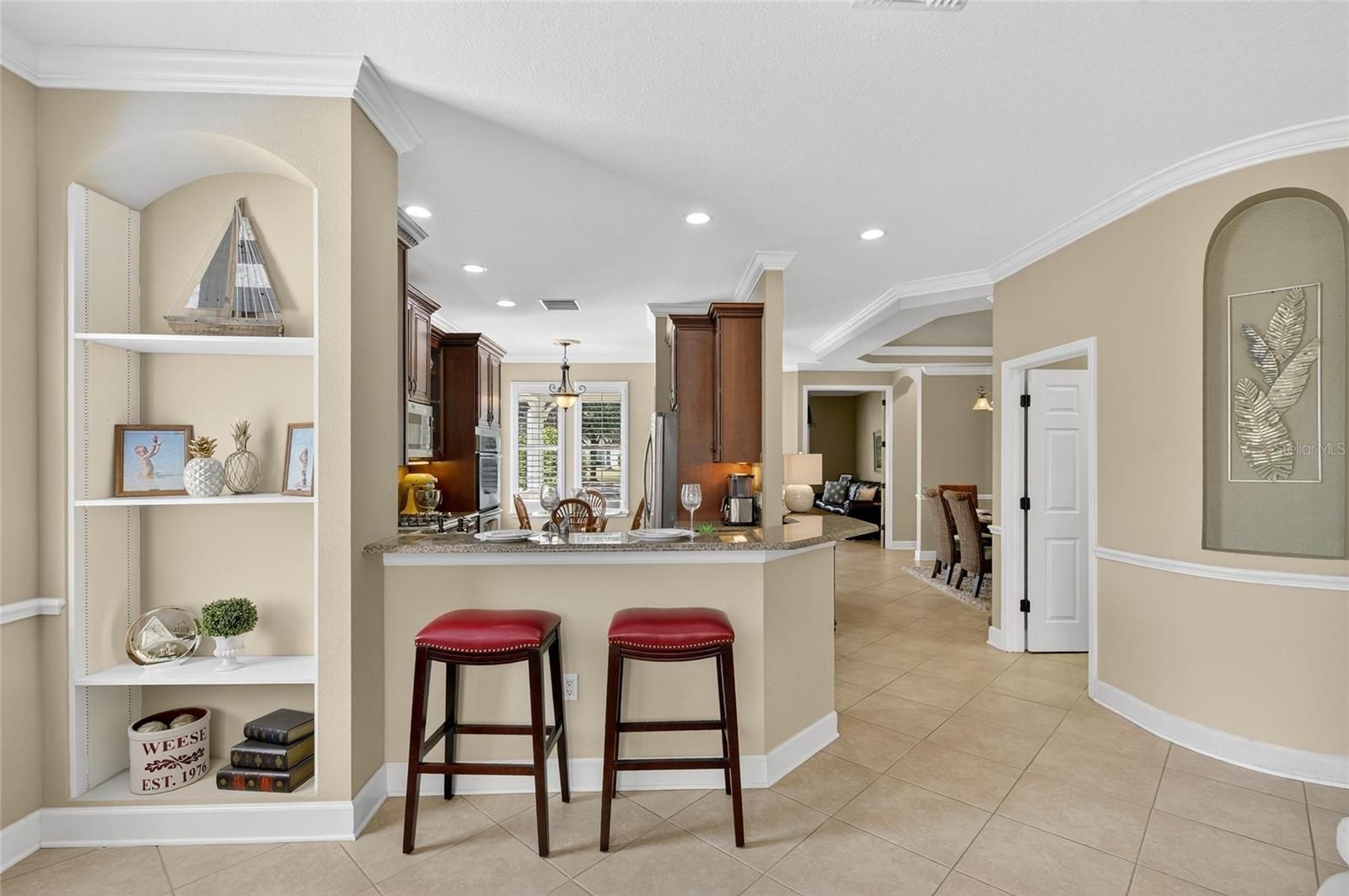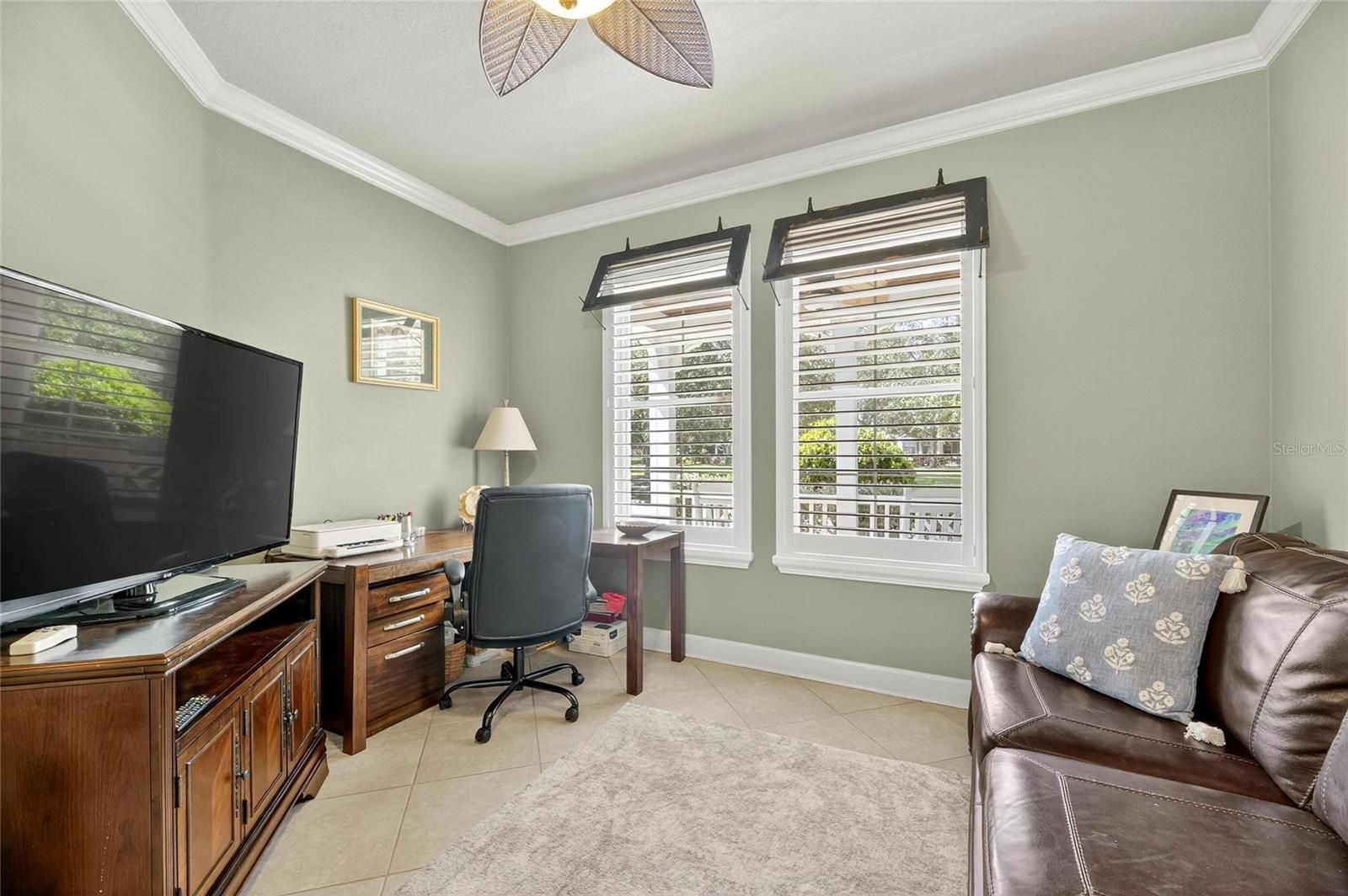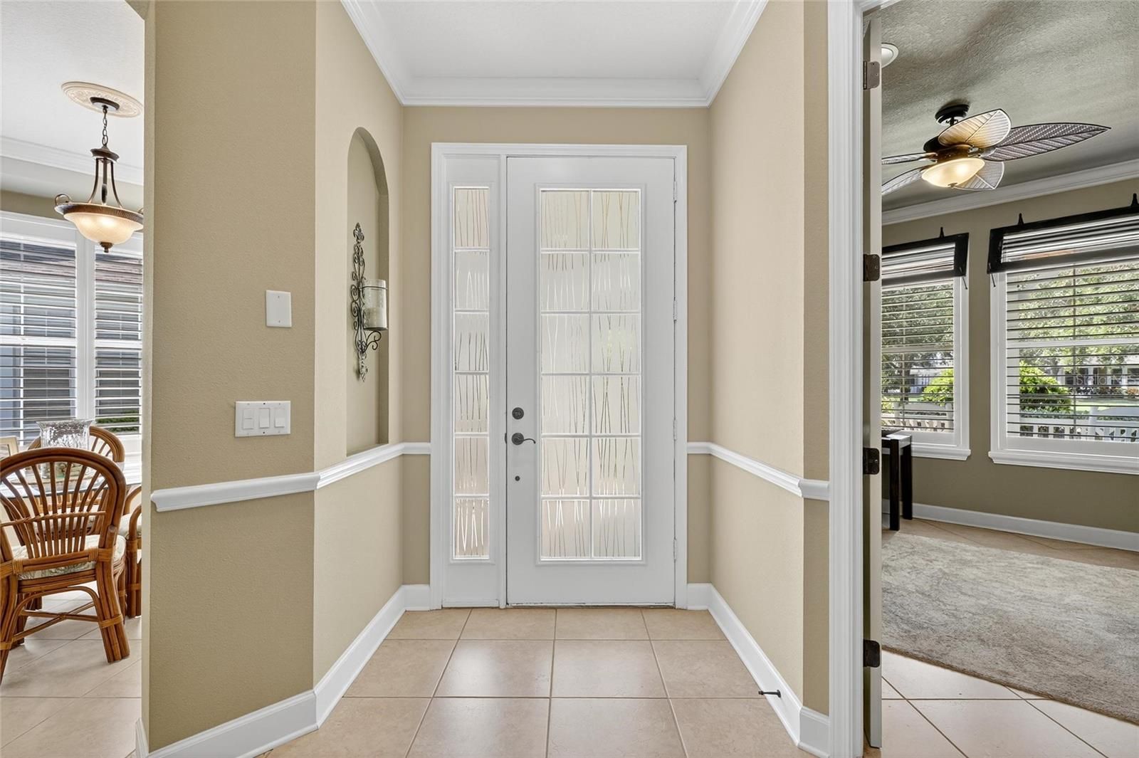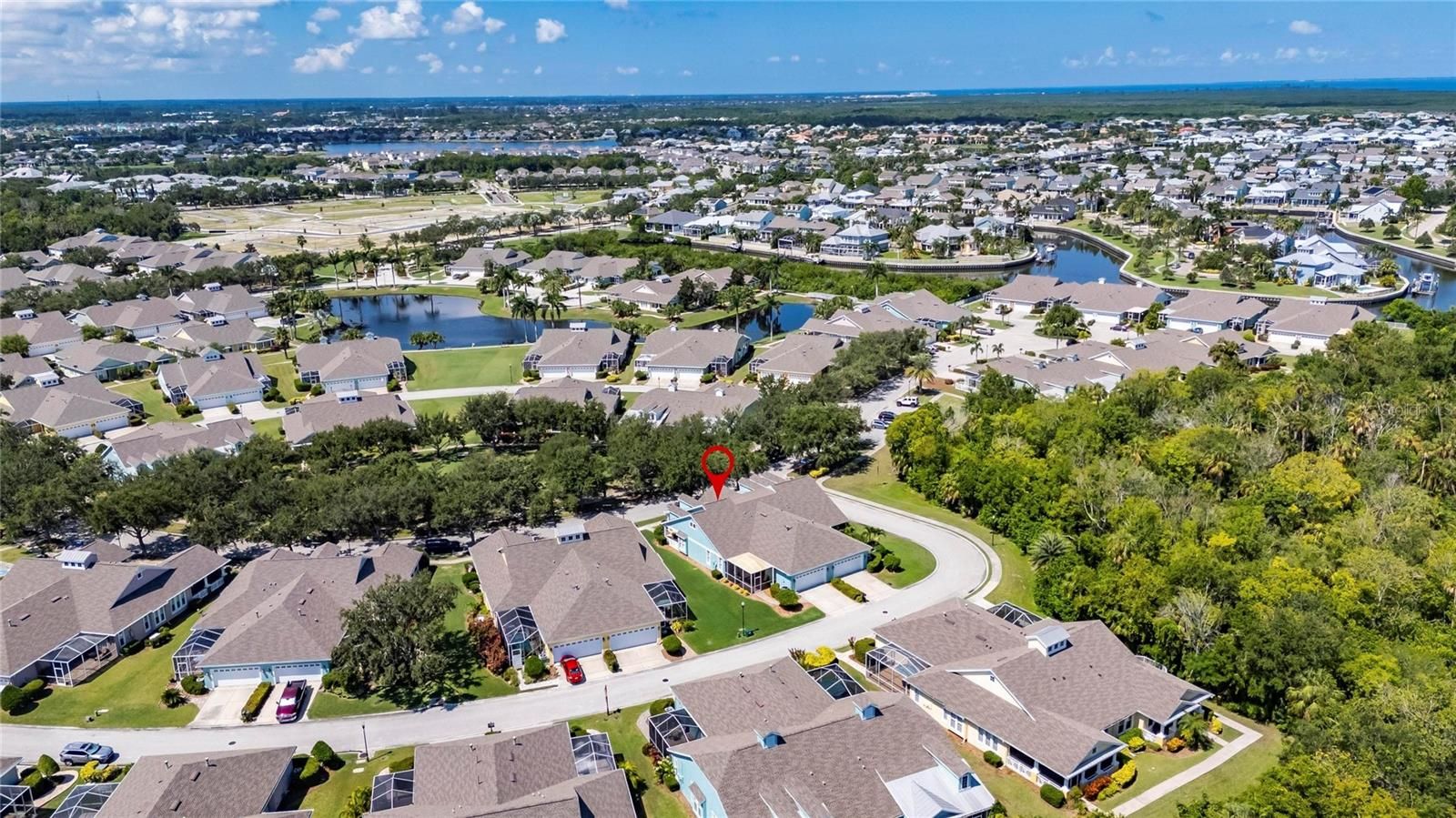 5312 Golden Isles Drive | 3 Beds | 2 Baths | 1,750 Sq Ft | Tidewater Floorplan | Park-Like Views | Villa in MiraBay This upgraded Tidewater villa offers 3 bedrooms, 2 bathrooms, a dedicated office with French doors, and 1,750 square feet of single-story living in the gated waterfront community of MiraBay. Located directly across from a peaceful, park-like green space, the charming front porch creates the perfect setting for relaxing or chatting with neighbors. Inside, you'll find crown molding in every room, hand-rubbed bronze hardware, a surround sound system, granite countertops, and 18-inch diagonal tile in the main areas. The kitchen is a showstopper, featuring 42-inch wood cabinets with crown and rope trim, stainless steel appliances, a gas range, and a double wall oven (including convection). The cozy breakfast nook offers views of the front porch and park. The primary suite includes a custom walk-in closet with built-in organizers and an en suite bath with pedestal sinks, large shower and expansive walk in closet. The secondary bedroom is generously sized, and the office offers flexible space for work or guests. The rear-entry garage includes a laundry sink, and a large screened patio provides private outdoor living at the back of the home. Additional upgrades- new roof 2024, plantation shutter window treatments, built in glass display cabinetry, front and back entry ceiling custom woodwork. MiraBay residents enjoy resort-style amenities including year-round heated pools with lap lanes and a waterslide, a 24-hour fitness center, clubhouse with café and lounge, tennis, pickleball, basketball courts, parks, playgrounds, kayaking, paddleboarding, and miles of walking trails. The community is golf cart-friendly with backroad access to MiraBay Village’s dining, grocery, and retail options. Conveniently located between Tampa and Sarasota, this home offers a coastal lifestyle with easy access to airports, shopping, dining, and entertainment.