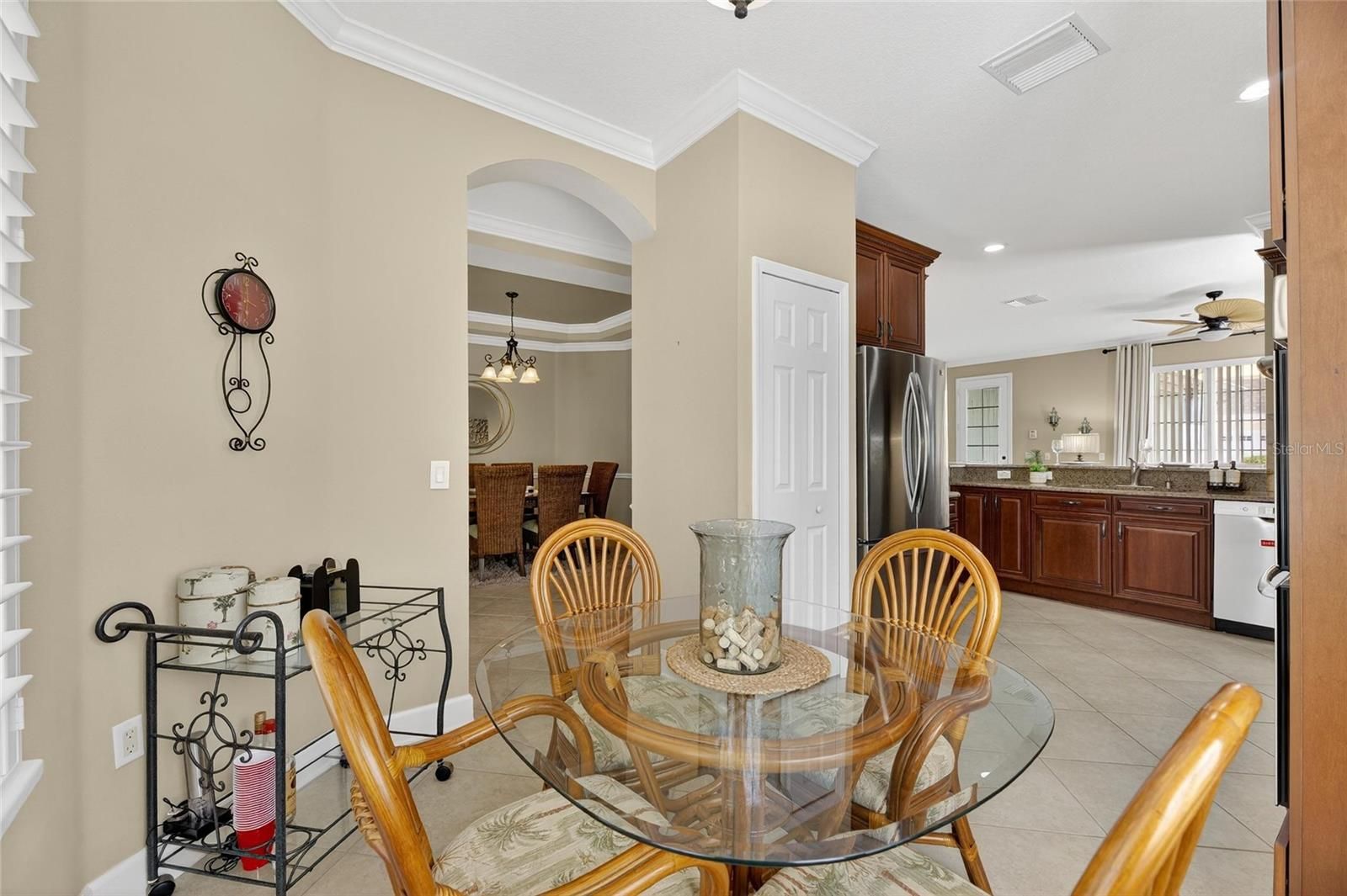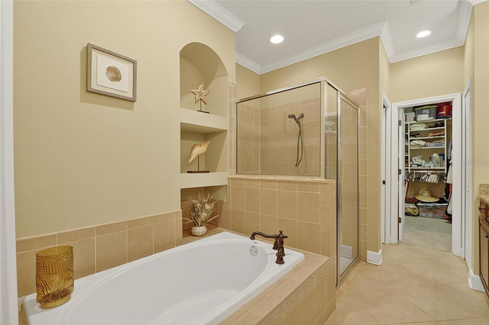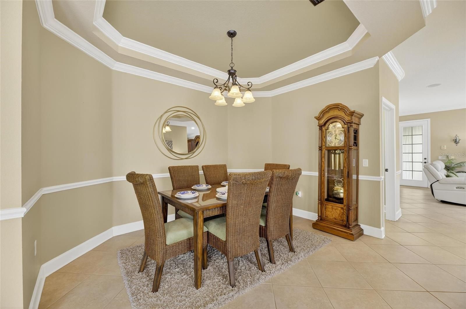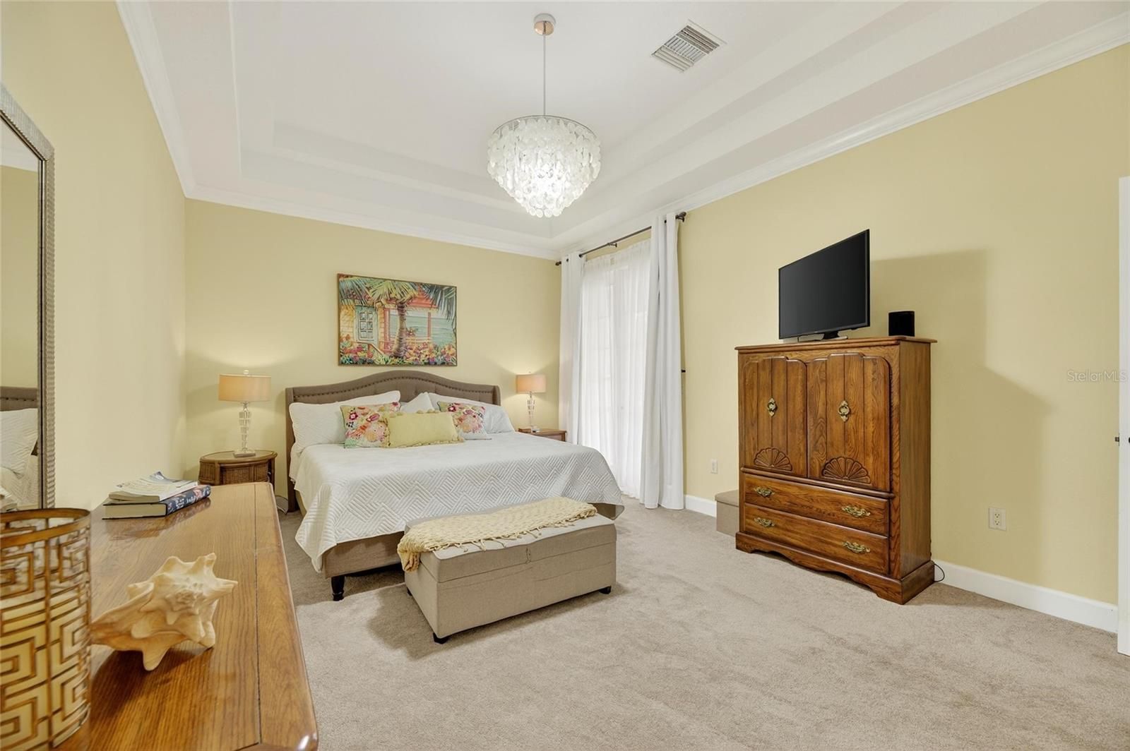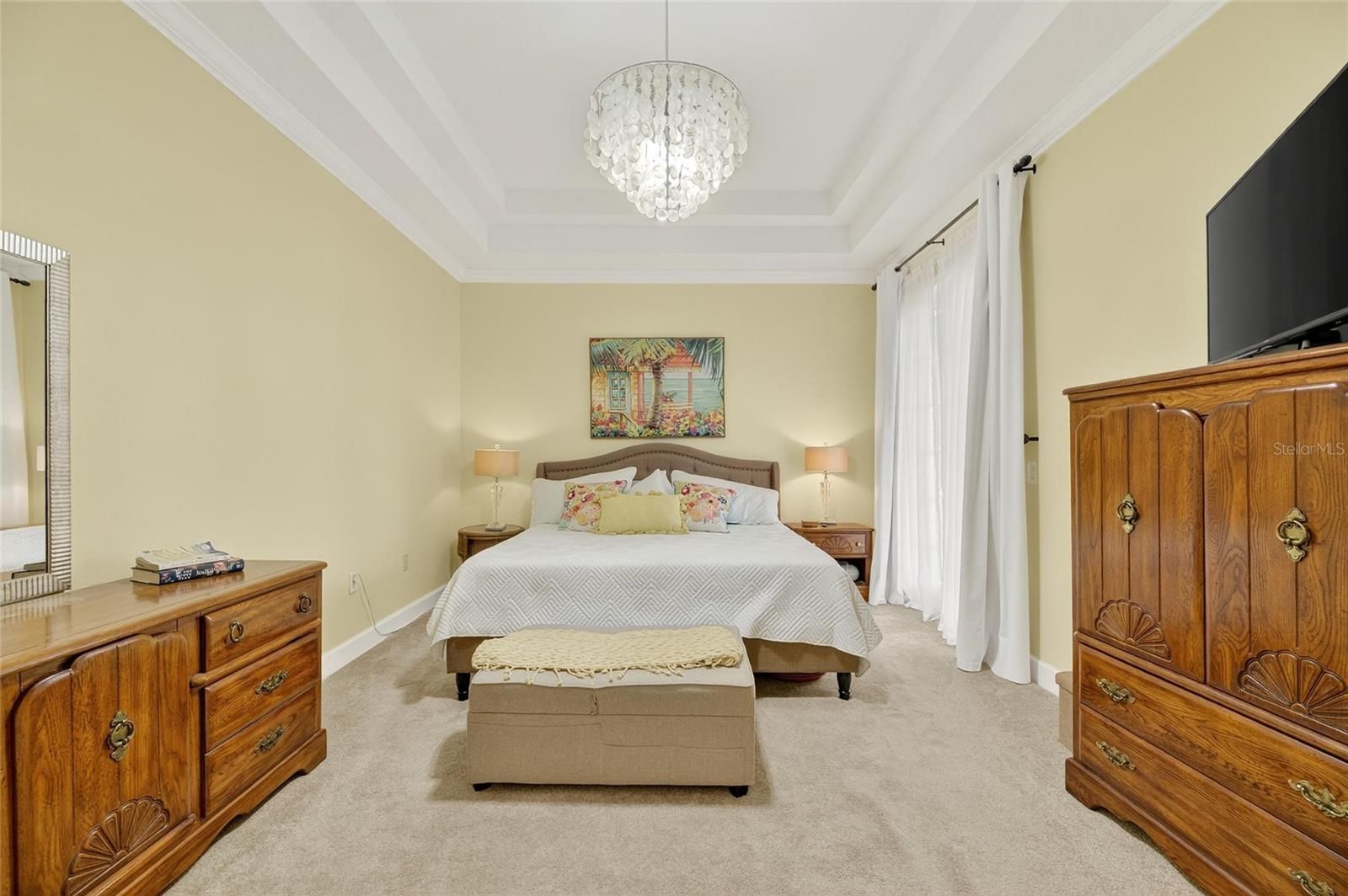 - Ceiling Fan(s), Crown Molding, Eat-in Kitchen, L-Shaped Dining Room, Open Floorplan, Main Level Primary, Solid-Wood Cabinets, Split Bedrooms, Stone Counters, Thermostat, Tray Ceiling(s), Walk-In Closet(s), Window Treatments