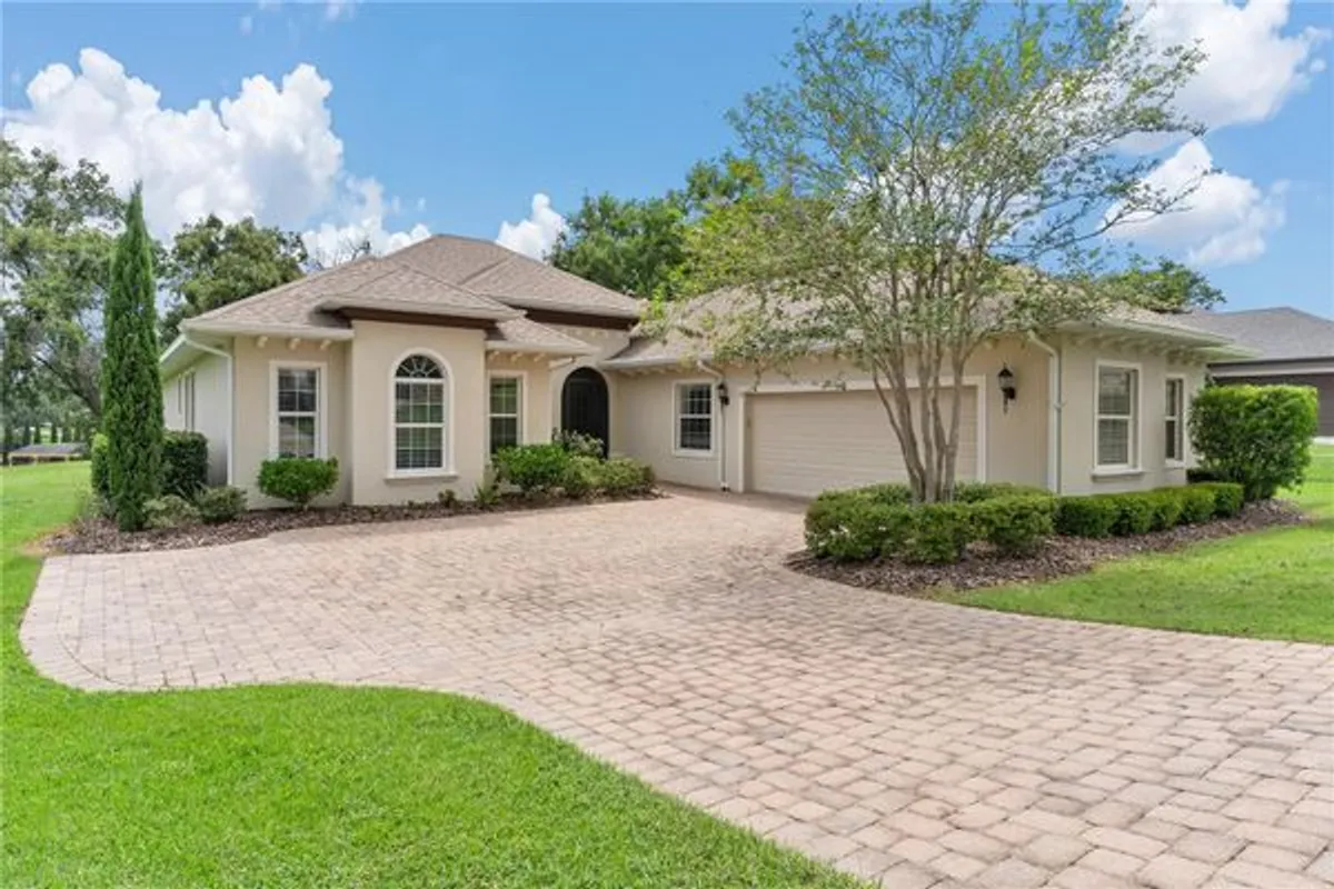 ATTENTION BUYERS…Seller is open to a lease option or lease purchase possibility!! AMAZING HOME...UNIQUE IN DESIGN! Look no further and don't miss this golden opportunity to own this stunning four-bedroom, three-bath home featuring 3 en suites! Lease purchase possible with acceptable terms to seller. Located on the 6th fairway with spectacular views in a secure, 24/7 guard gated, prestigious Golfing Community! The brick paver driveway greets you as you step through the front screen porch to enter your "move in ready"...like new home! This residence features a bright and airy open-concept layout with a 3-way split floor plan! Soaring ceilings and wall-to-wall sliding glass doors flood the space with natural light and frame breathtaking golf course views. The oversized foyer leads you to the heart of the home... the spacious kitchen! Fit for the chef, this gourmet kitchen blends functionality with style—complete with a large center island, granite countertops, stainless steel appliances to include a double oven range, two pantries, abundant cabinetry with pull out shelving/ drawers and a wine bar with a built-in wine rack and wine cooler. The elegant dining area showcases a sparkling crystal chandelier and direct access to the lanai, perfect for effortless indoor-outdoor entertaining. The spacious great room is enhanced by a cozy stone gas fireplace for "romantic evenings" at home! Enter through double doors to your luxurious primary suite offering a spa-like retreat with dual raised vanities, oversized soaking tub, walk-in shower, water closet for privacy, two generous walk-in closets, automatic window shades and serene views of the fairway. En suite #2 with walk in closet include its own bathroom features a pocket door to hall, servicing guests & bedroom 4 with huge walk-in closet! In addition, enjoy en suite 3 with its own private bath! Convenient inside laundry room with lots of cabinets & built in sink! The oversized screened lanai—equipped with an automatic screen—overlooks the lush golf course and offers a peaceful outdoor sanctuary. The backyard, enclosed by a new black iron fence with a 6-foot gate, is adorned with blooming Confederate jasmine for added privacy and beauty, perfect area for your kids to play or your pet to roam freely...Additional highlights include: A deep 2.5-car garage includes extra space (11 x 9.6) for golf cart or extra storage Custom wood cabinetry, real oak hardwood and porcelain tile flooring Upgraded LED recessed lighting and oversized ceiling fans Recent updates such as: Full interior repaint (walls, doors, moldings, baseboards). New crystal light fixtures in foyer and dining room Premium hardwood oak flooring. The residents enjoy privacy and tranquility just minutes from The Villages. In addition to the HOA cost there is a Monthly Minimum Social Membership Required of $180 per month offering access to a wide range of luxury amenities to include clubhouse with fitness center, Olympic size pool, tennis, racquet and pickle ball! Plus, access to boating/fishing on the Harris Chain of Lakes!! For additional fees...Golf membership and RV/Boat storage available. This home seamlessly blends luxury, comfort, and resort-style living in one of Central Florida’s most desirable golf communities. Call today for the start of your new beginning vacationing from home!