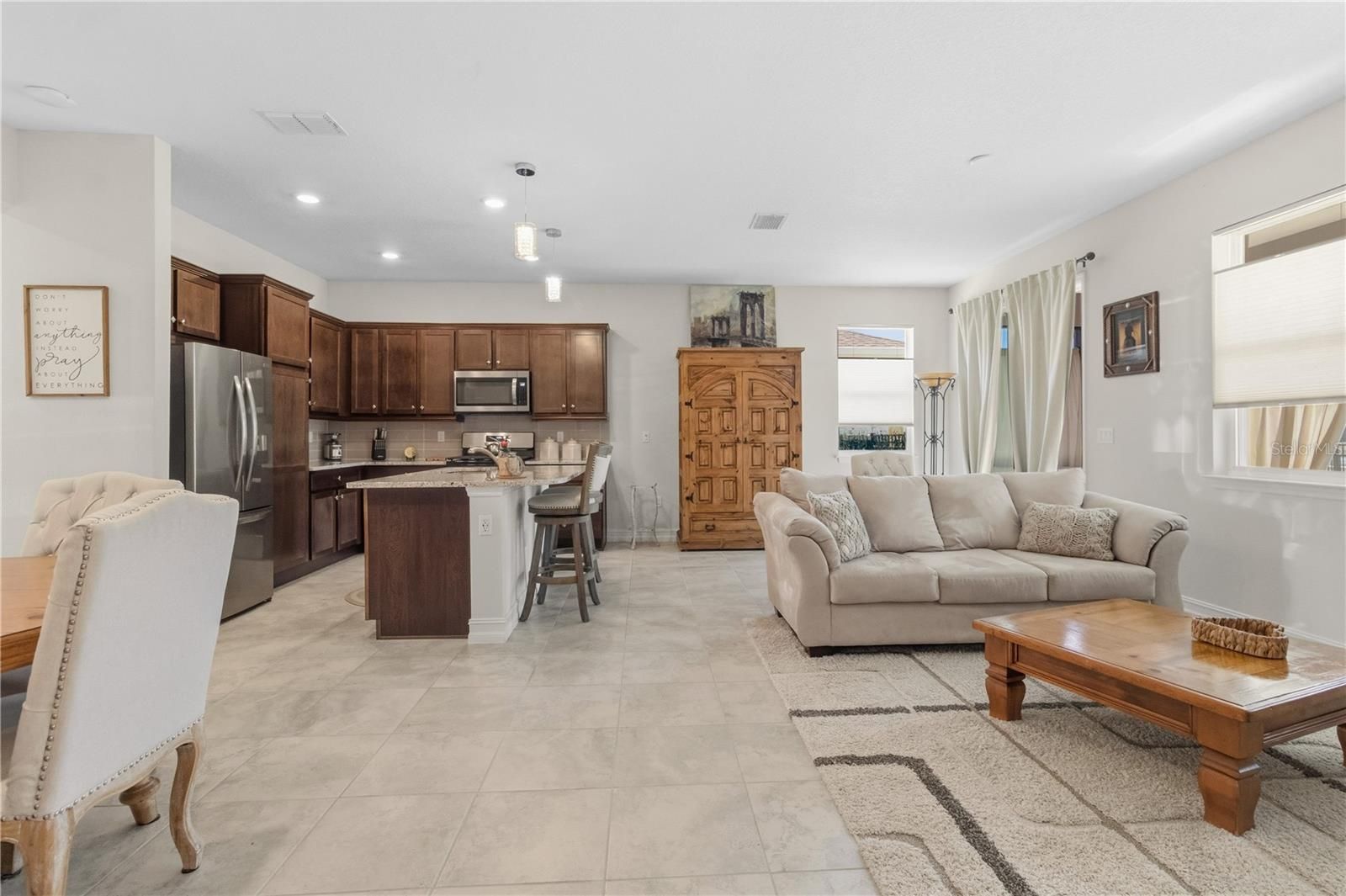 - Ceiling Fan(s), Eat-in Kitchen, Kitchen/Family Room Combo, Living/Dining Room, Open Floorplan, Main Level Primary, Smart Home, Solid Surface Counters, Solid-Wood Cabinets, Split Bedrooms, Stone Counters, Thermostat, Walk-In Closet(s), Window Treatments