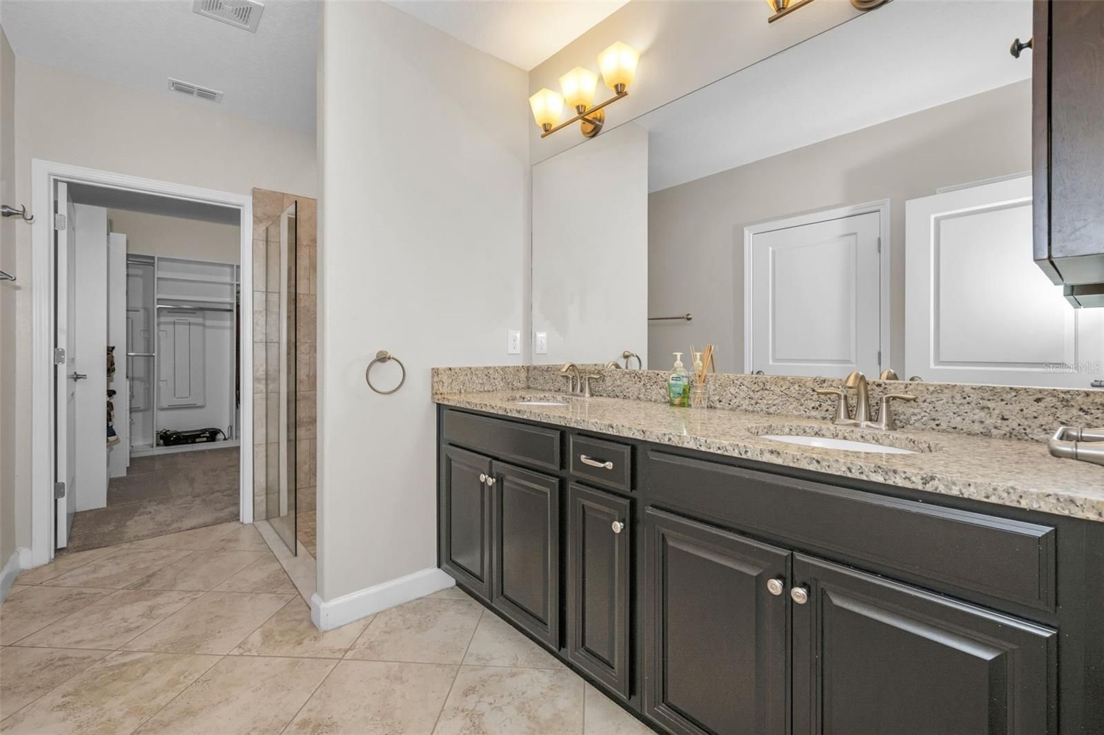 - Ceiling Fan(s), High Ceilings, Living/Dining Room, Open Floorplan, Main Level Primary, Solid-Wood Cabinets, Split Bedrooms, Stone Counters, Thermostat, Walk-In Closet(s)