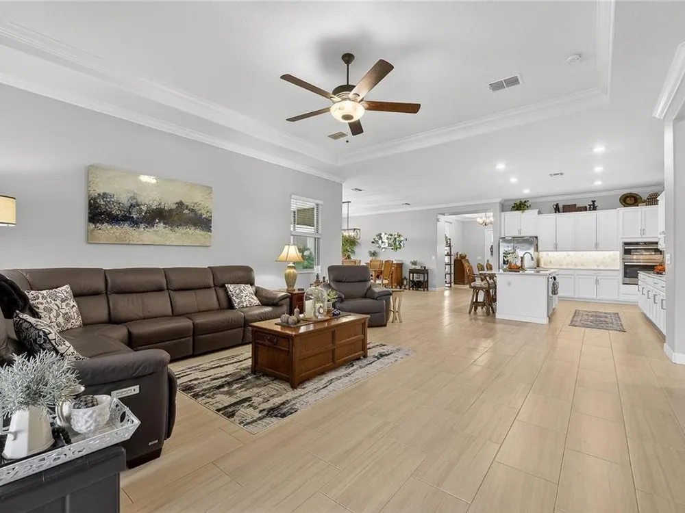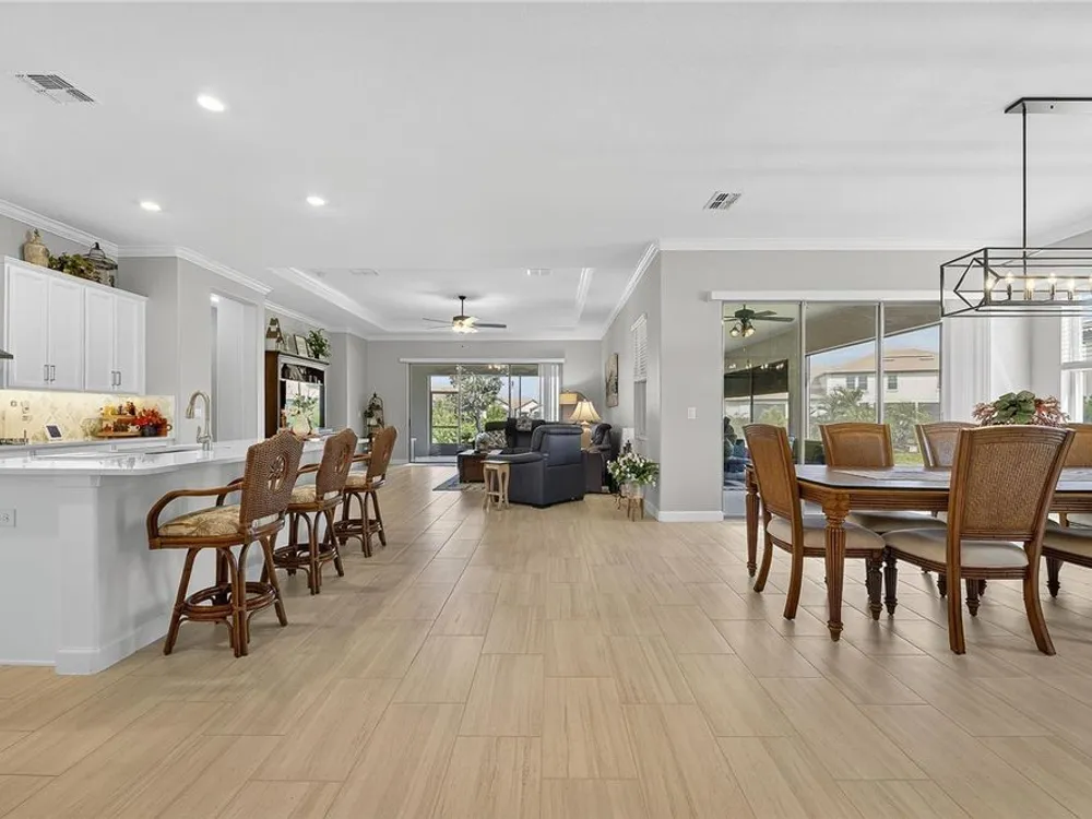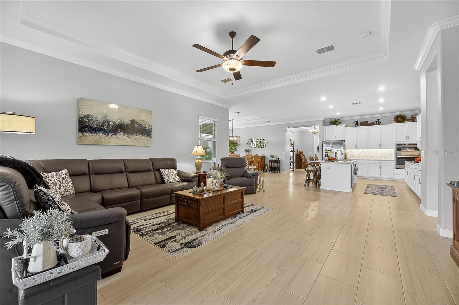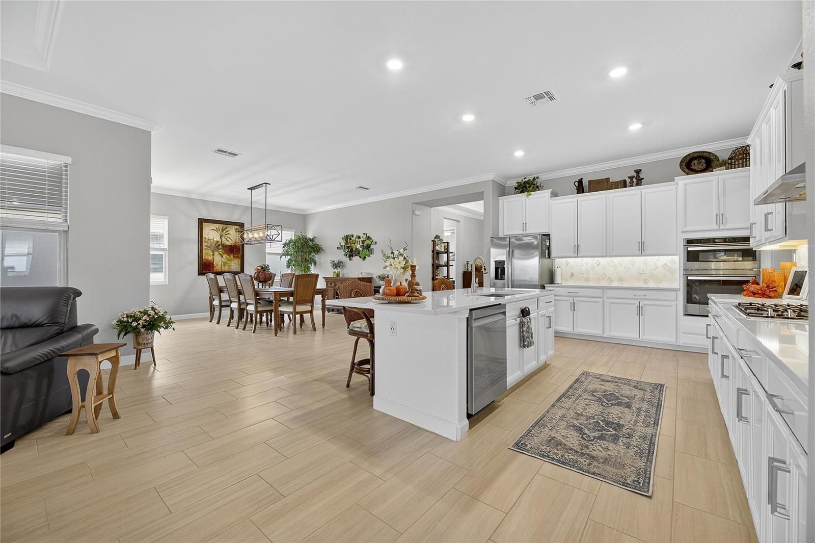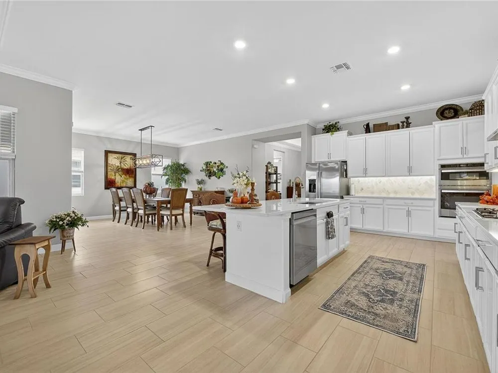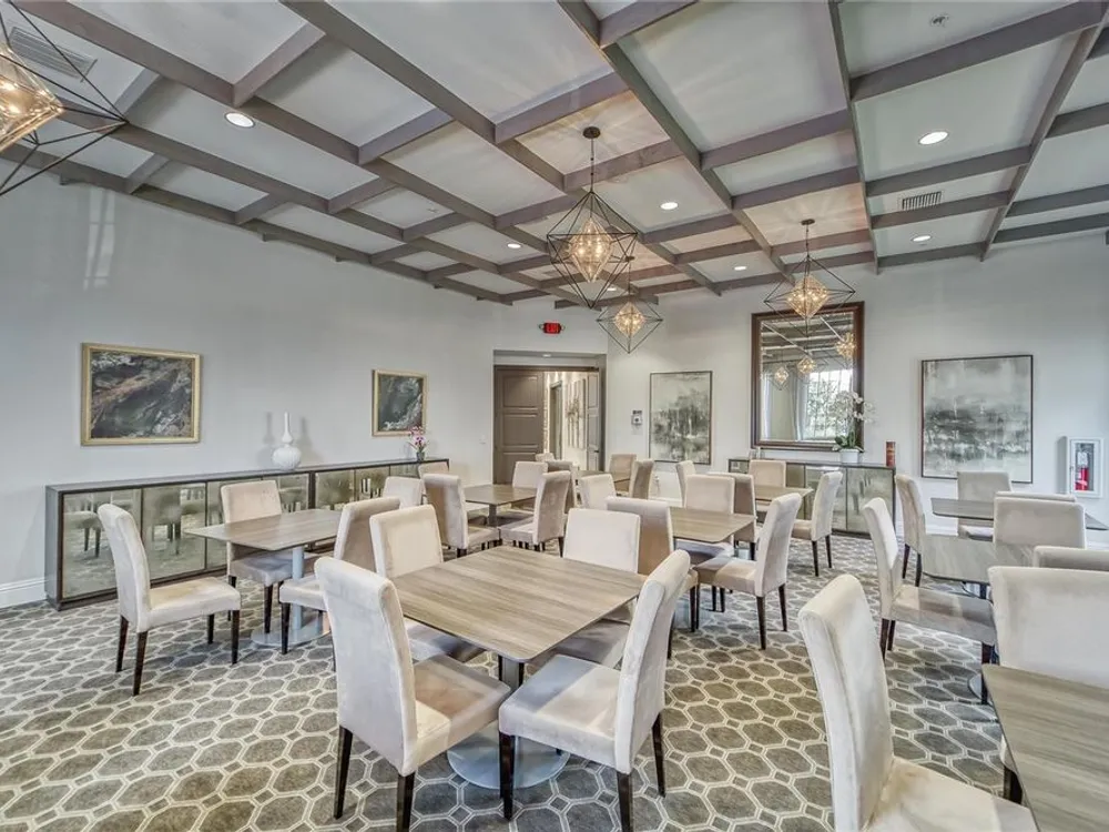 - Coffered Ceiling(s), Crown Molding, Eat-in Kitchen, High Ceilings, In-Wall Pest Control, Kitchen/Family Room Combo, Living/Dining Room, Open Floorplan, Main Level Primary, Solid Surface Counters, Split Bedrooms, Thermostat, Walk-In Closet(s), Window Treatments