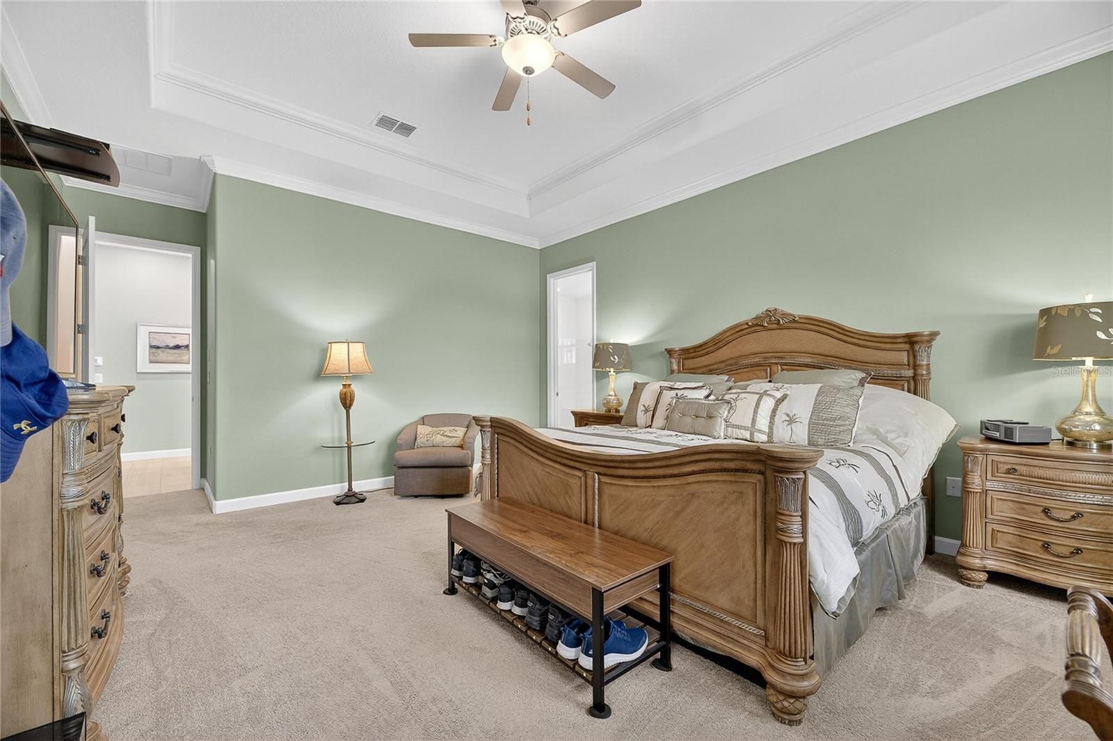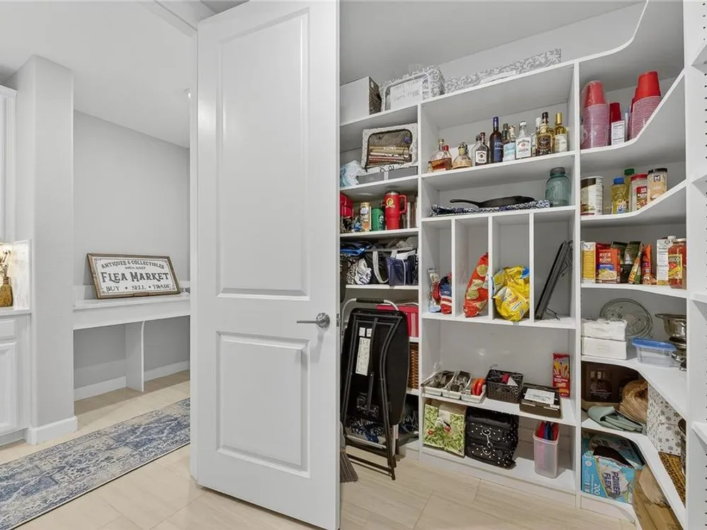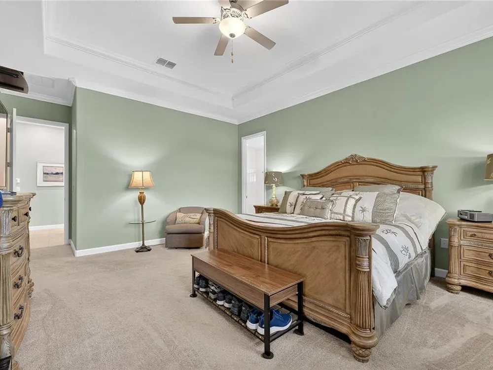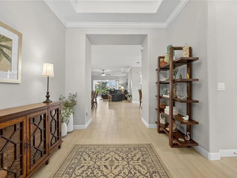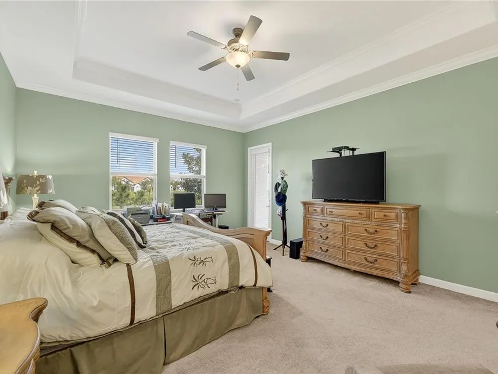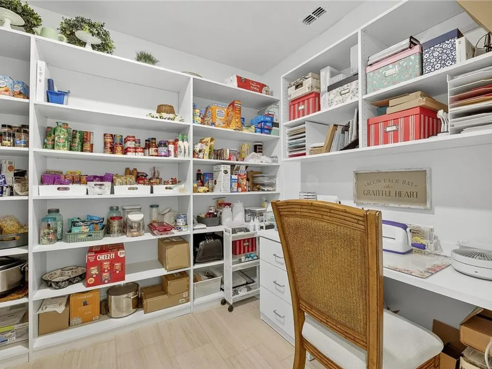 - Coffered Ceiling(s), Crown Molding, Eat-in Kitchen, High Ceilings, In-Wall Pest Control, Kitchen/Family Room Combo, Living/Dining Room, Open Floorplan, Main Level Primary, Solid Surface Counters, Split Bedrooms, Thermostat, Walk-In Closet(s), Window Treatments