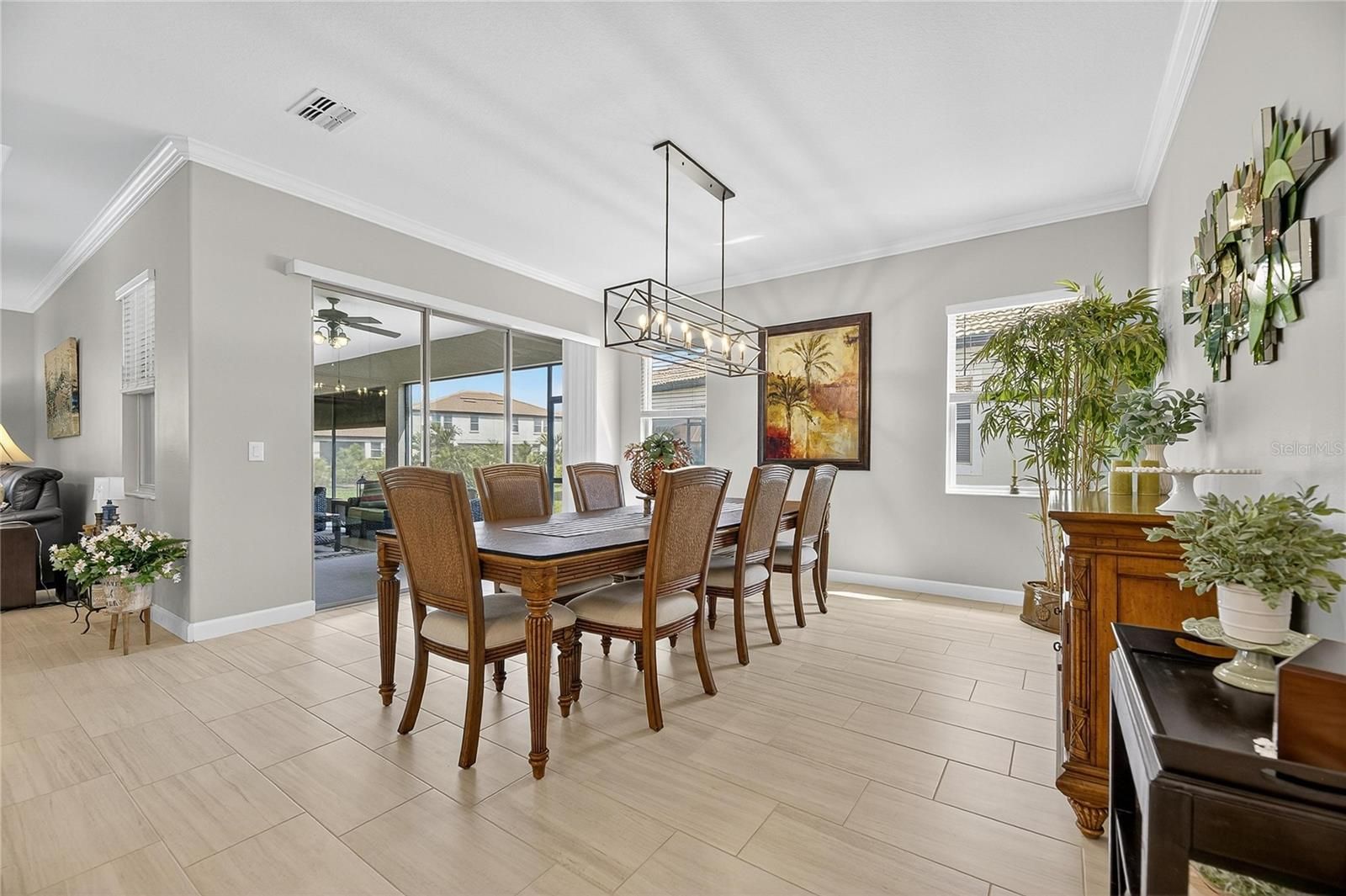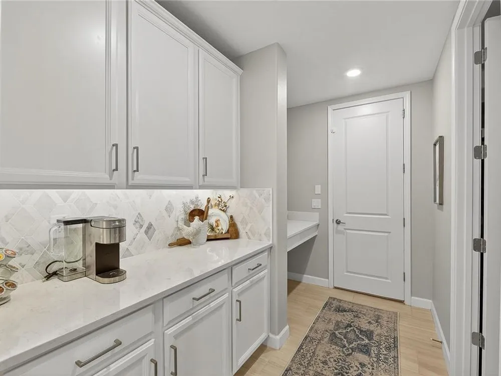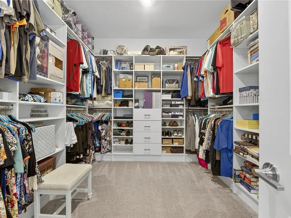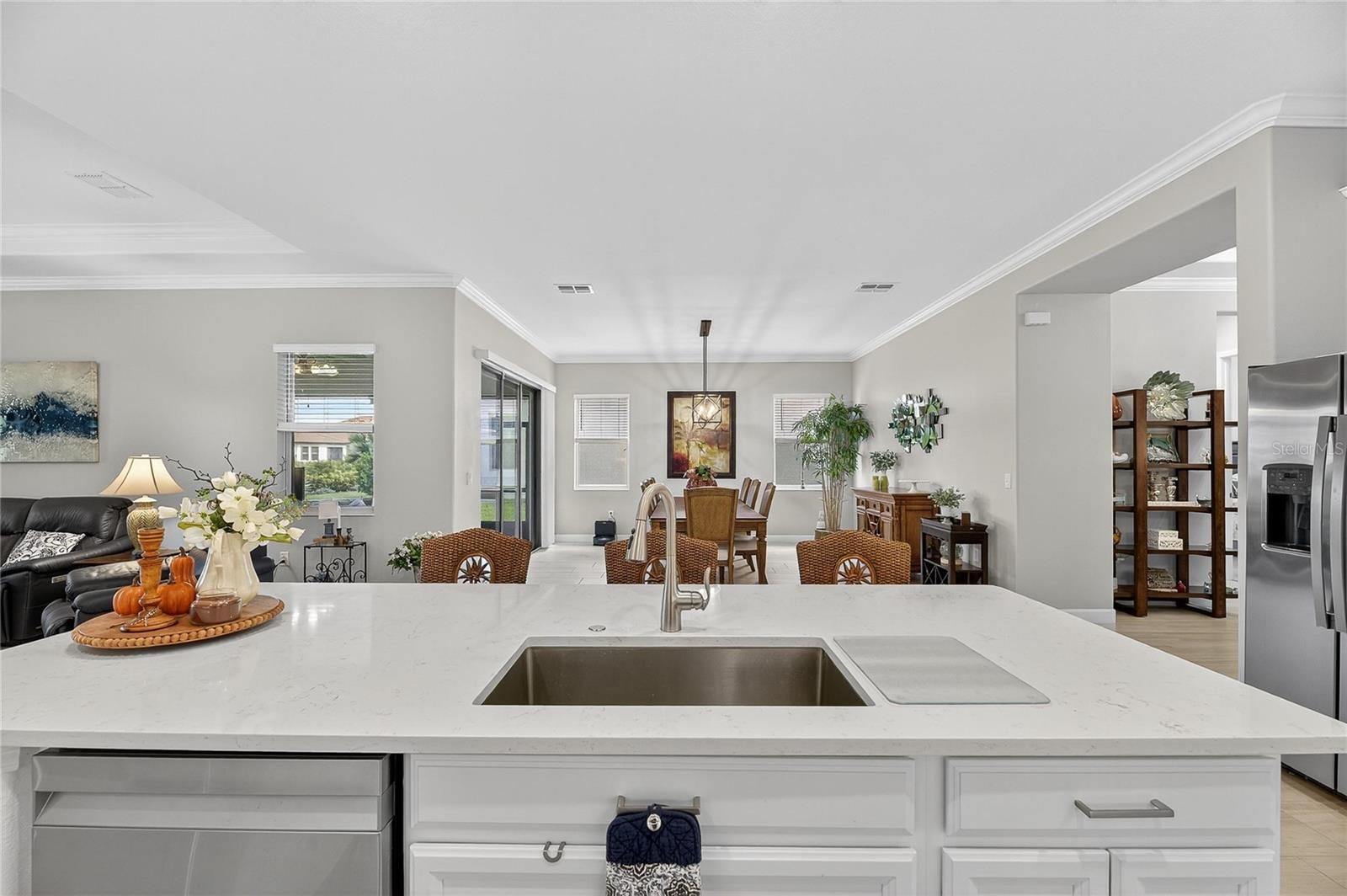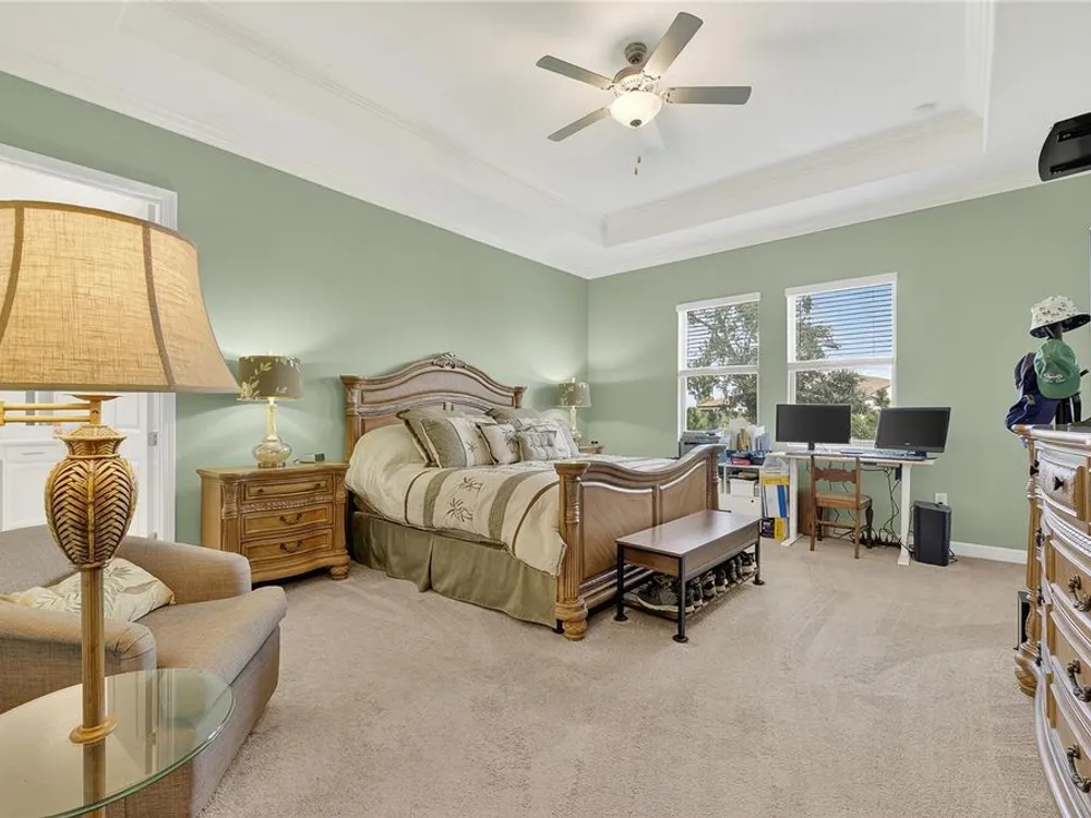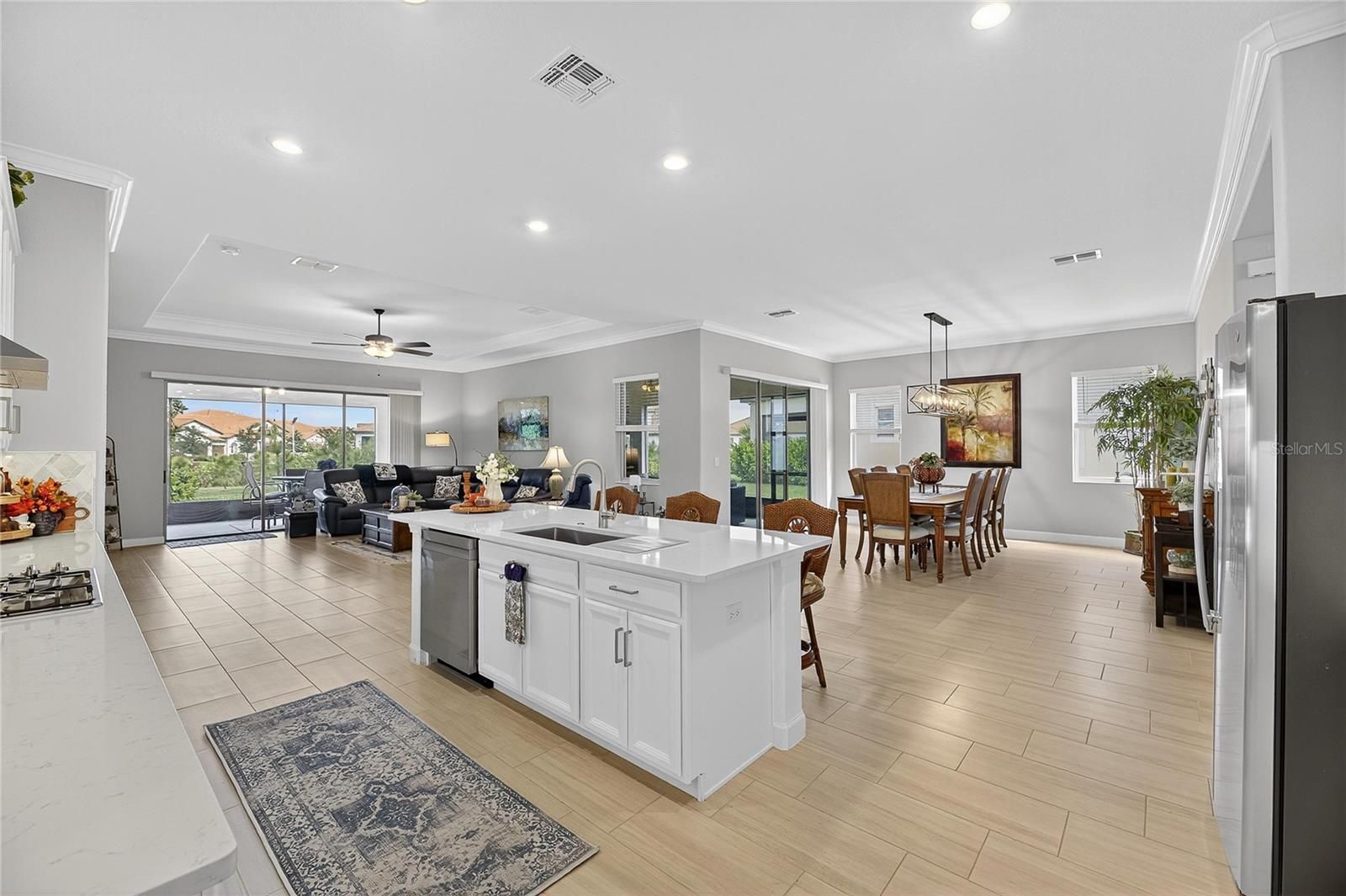- Coffered Ceiling(s), Crown Molding, Eat-in Kitchen, High Ceilings, In-Wall Pest Control, Kitchen/Family Room Combo, Living/Dining Room, Open Floorplan, Main Level Primary, Solid Surface Counters, Split Bedrooms, Thermostat, Walk-In Closet(s), Window Treatments