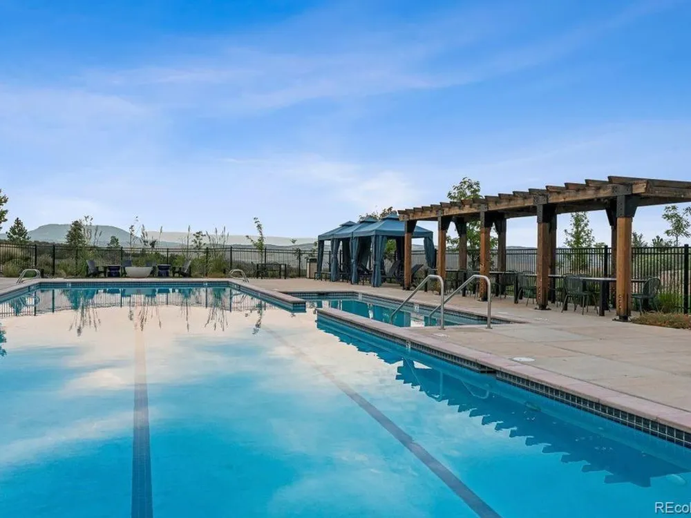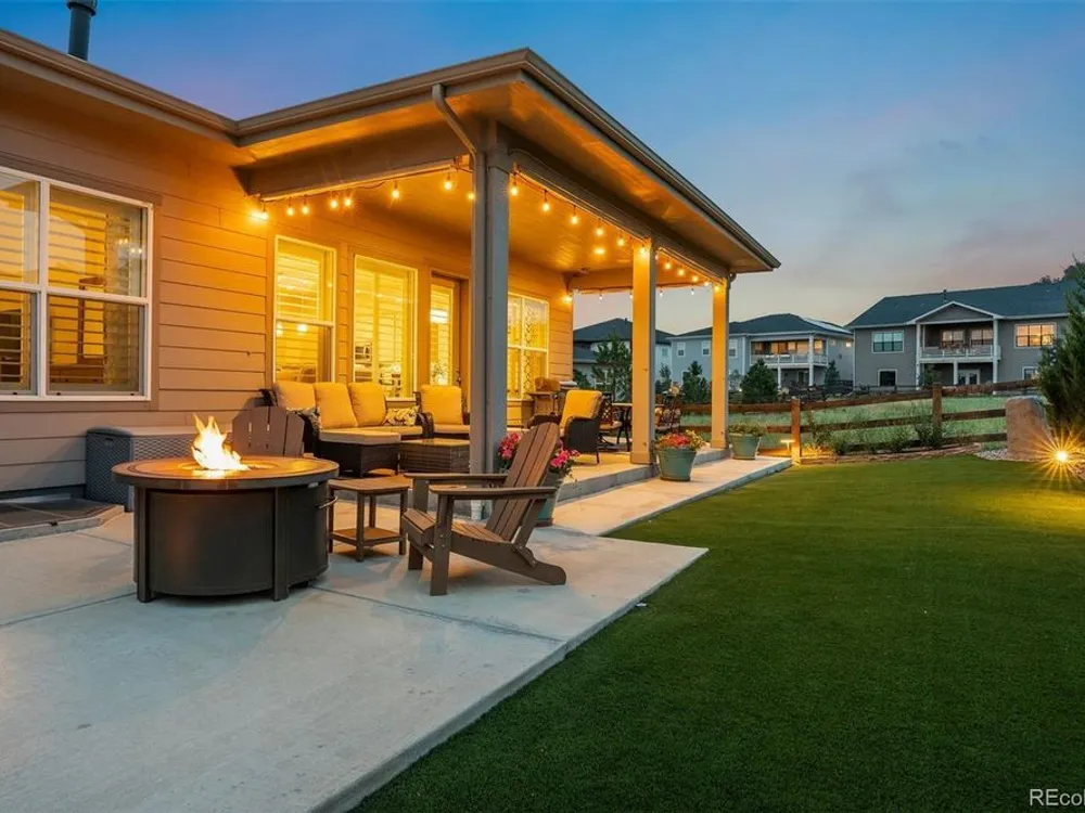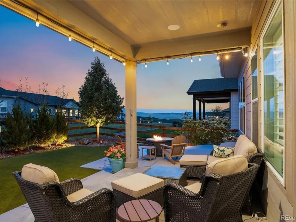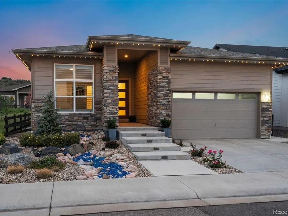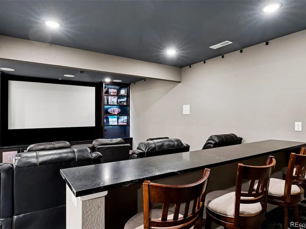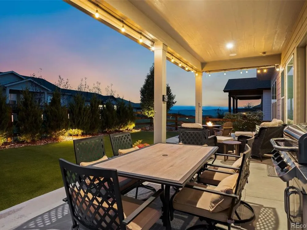 Welcome to the Regency neighborhood of Montaine, a vibrant 55+ community in Castle Rock, recently named one of the nation’s top cities for quality of life. Discover refined living in this Toll Brothers Boyd floorplan, offering 5 bedrooms, 3 bathrooms, and 3,707 square feet of beautifully designed space. This 2021-built home is a rare find. Entertainment at its best. The fully finished basement is an entertainer’s dream, featuring a stylish mini kitchen/bar that makes hosting effortless. Step into your own state-of-the-art home theater, complete with projection video and immersive surround sound system that transforms every night into a movie night. Thoughtful upgrades and finishes throughout. With over $200,000 in post-construction upgrades, this home radiates luxury. The primary suite closet system adds smart organization, while custom built-in shelving and stonework framing the fireplace elevate the living room. The epoxy-finished two-car garage keeps things tidy, while the gorgeous custom bar brings warmth and character to gatherings. Designed for easy living. Low-maintenance landscaping makes this the ideal lock-and-leave retreat for snowbirds and travelers. A fenced yard provides peace of mind for your pets, while the greenbelt backdrop ensures both privacy and tranquility. After a day exploring nearby trails like Plum Creek or Castlewood Canyon State Park, relax and rejuvenate in your soaking tub in the primary retreat. Lifestyle and location at it’s best. Regency at Montaine is more than a neighborhood—it’s a lifestyle. Residents enjoy resort-style amenities including a clubhouse with full-time event coordinator, pool, hot tub, fitness center, tennis and pickleball courts, and miles of trails. With stunning mountain views and easy access to I-25, commuting or traveling is a breeze.