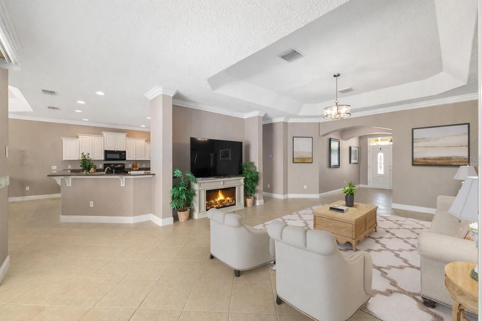 Under contract-accepting backup offers. One or more photo(s) has been virtually staged. AMAZING WATER & GOLF FRONT HOME UNDER $700K! This beautiful EXPANDED BRIDGEPORT HOME perfectly positioned on the 4TH HOLE OF MALLORY GOLF COURSE with STUNNING WATER and GOLF-COURSE VIEWS. This home features an impressive EXPANDED LANAI with PANORAMIC CAGE, ENHANCED LANDSCAPING, and EXTERIOR LIGHTING for a true resort-style outdoor experience. Inside, the CHEF'S KITCHEN offers STAGGERED CABINETRY, GRANITE COUNTERTOPS, a GAS RANGE, and a BUILT-IN DESK. The home boasts NO CARPET, with elegant tile and luxury vinyl plank flooring throughout, along with TREY CEILINGS, PLANTATION SHUTTERS, and CROWN MOLDING for a refined finish. The spacious primary suite includes DUAL WALK-IN CLOSETS, while guests enjoy the convenience of a Jack-and-Jill bathroom between the two guest bedrooms. Additional upgrades include GUTTERS, a PAINTED DRIVEWAY, EXPOXY-FINISHED GARAGE FLOOR, and a 2021 ROOF adds peace of mind. Located in the Village of Amelia, this exceptional home is just a short distance from Lake Sumter Landing, offering nightly entertainment, waterfront dining, and boutique shopping.