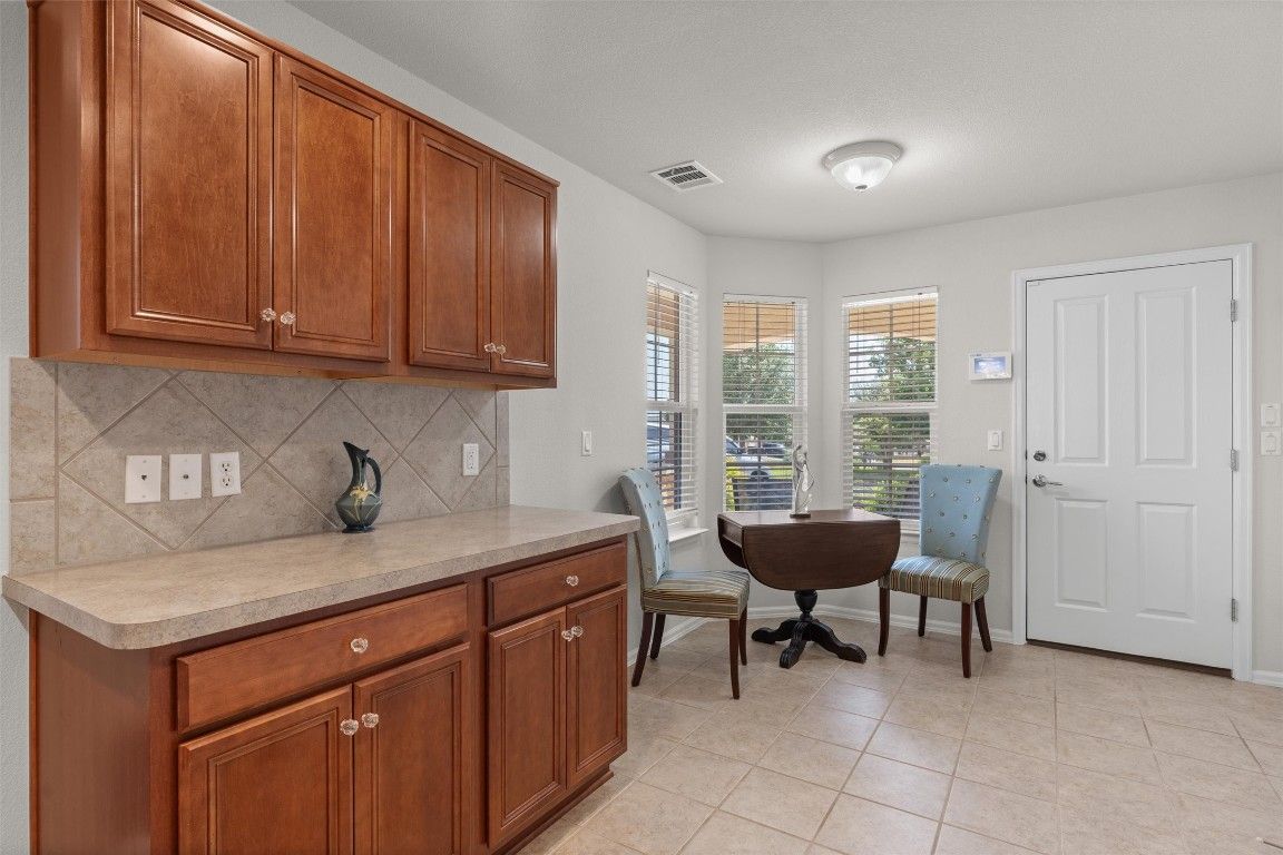 Hugging a deep greenbelt that adds glorious privacy at the back yard, this Sun City Texas Gray Myst greets you with tidy landscaping beds and a stone path leading to the courtyard-style front sitting porch. Inside, twin windows add natural lighting at the Foyer, off of which resides the Open Kitchen where classic white appliances add timeless appeal. A Pantry Closet and a bayed Breakfast Nook join with the plentiful cabinets and counter space, which circle the space. A breakfast bar gently separates the Open Kitchen from the Great Room with Dining, where tile floors, seen throughout the home, form a perfect back drop for favorite rugs. Off the Breakfast Room a Laundry Closet includes handy shelving for organizing, while a door in the Breakfast Nook opens to the Two-Car Garage making bringing-in groceries as easy as pie. Twin sets of full-view glass doors in the Great Room reveal the Extended Covered Patio with stone seat wall and greenbelt location. Those same views repeat in the separated Primary Bedroom located at the rear of the home. There, a trio of windows frame the bucolic vista. Meanwhile, the en suite Primary Bath hosts dual vanities, a seated shower, and a generous Walk-in Closet. At the front of the home, Two Guest Bedrooms flank the full Guest Bath, while a spacious Storage Closet and a convenient Linen Closet are off the Hallway. Ceiling fans pepper the home with breezy comfort, while window treatments are included. Located near upcoming shopping at Ronald Reagan Blvd., this location is also near myriad activities of Cowan Creek Amenity Center.